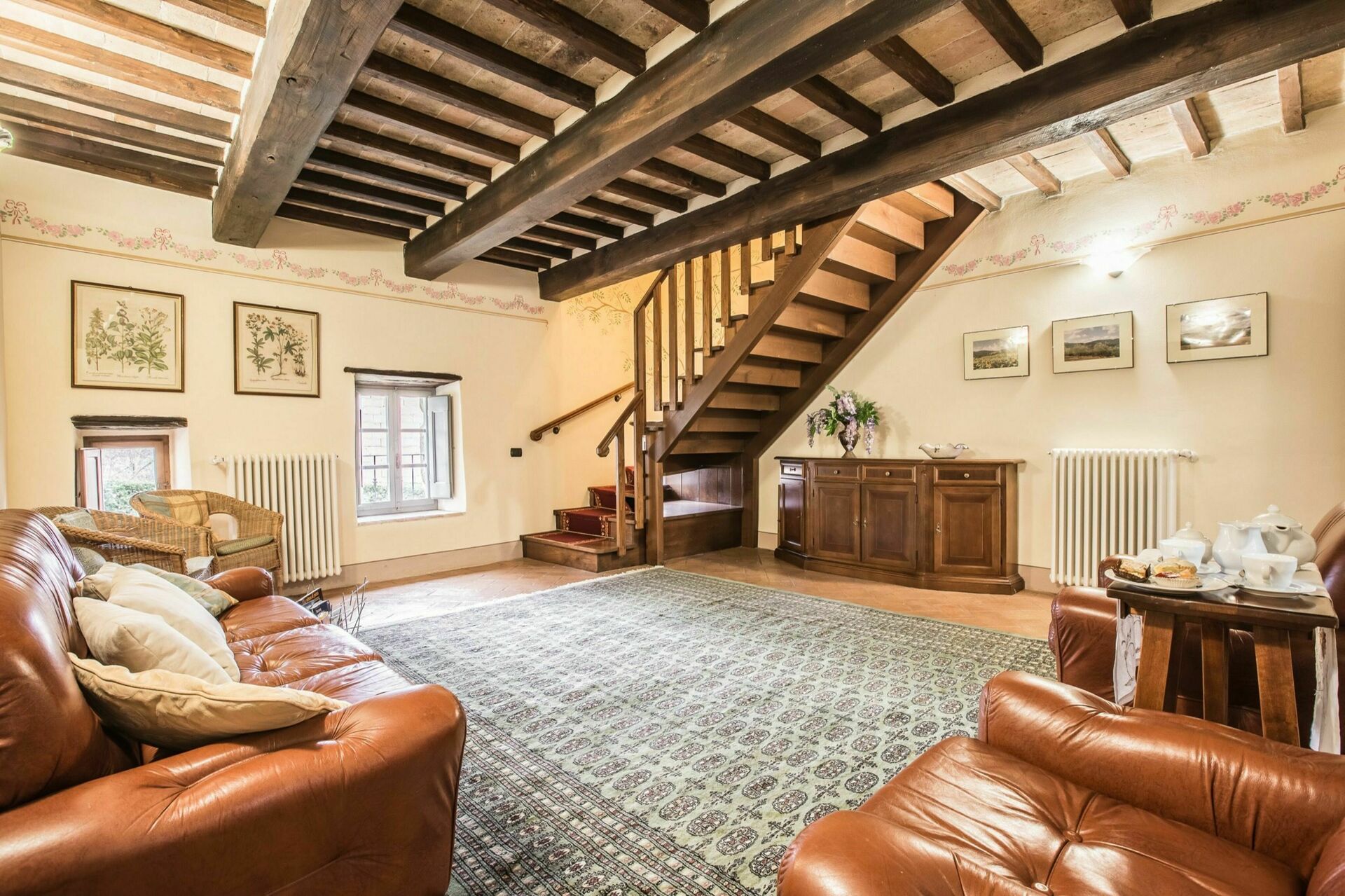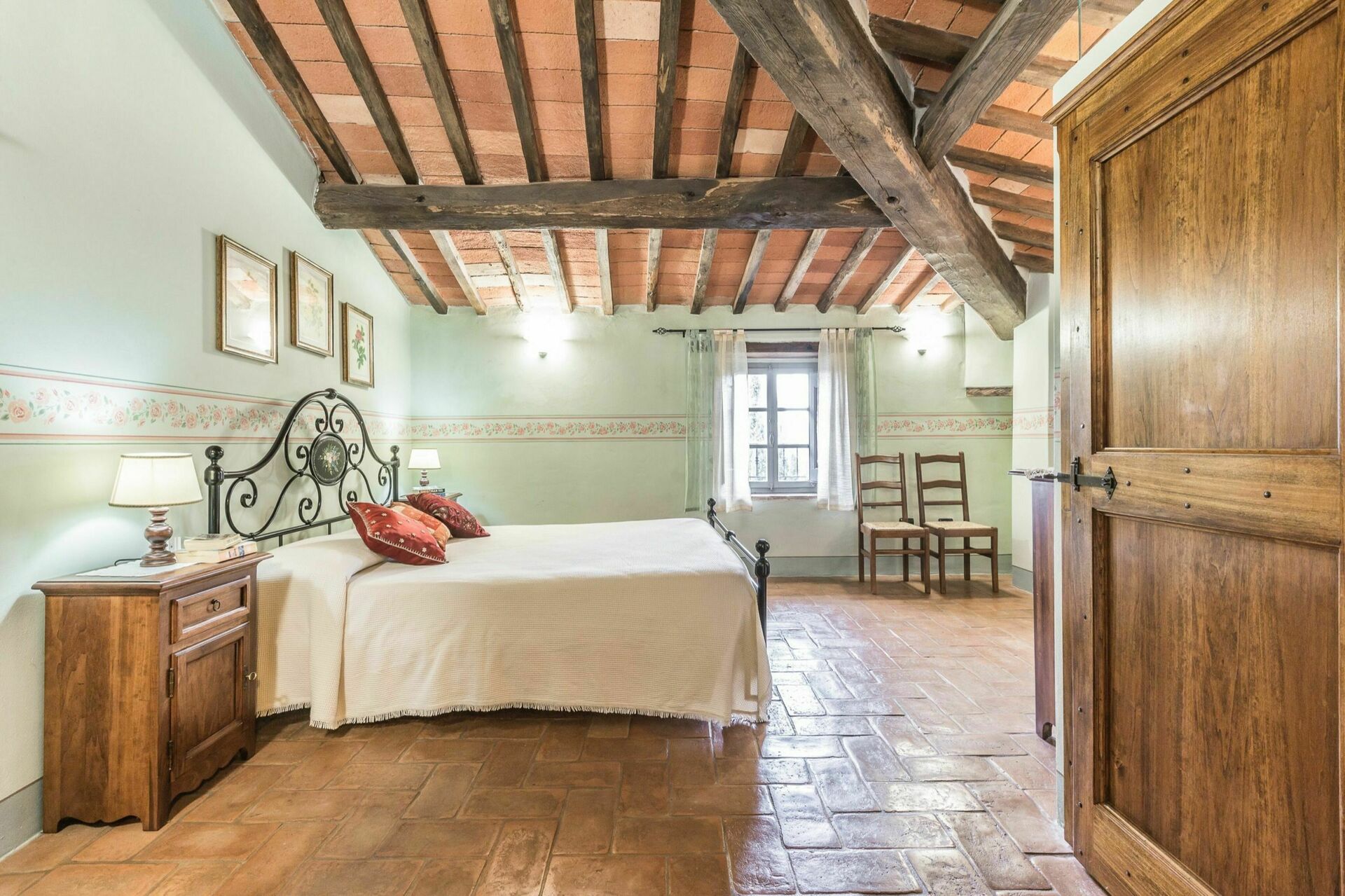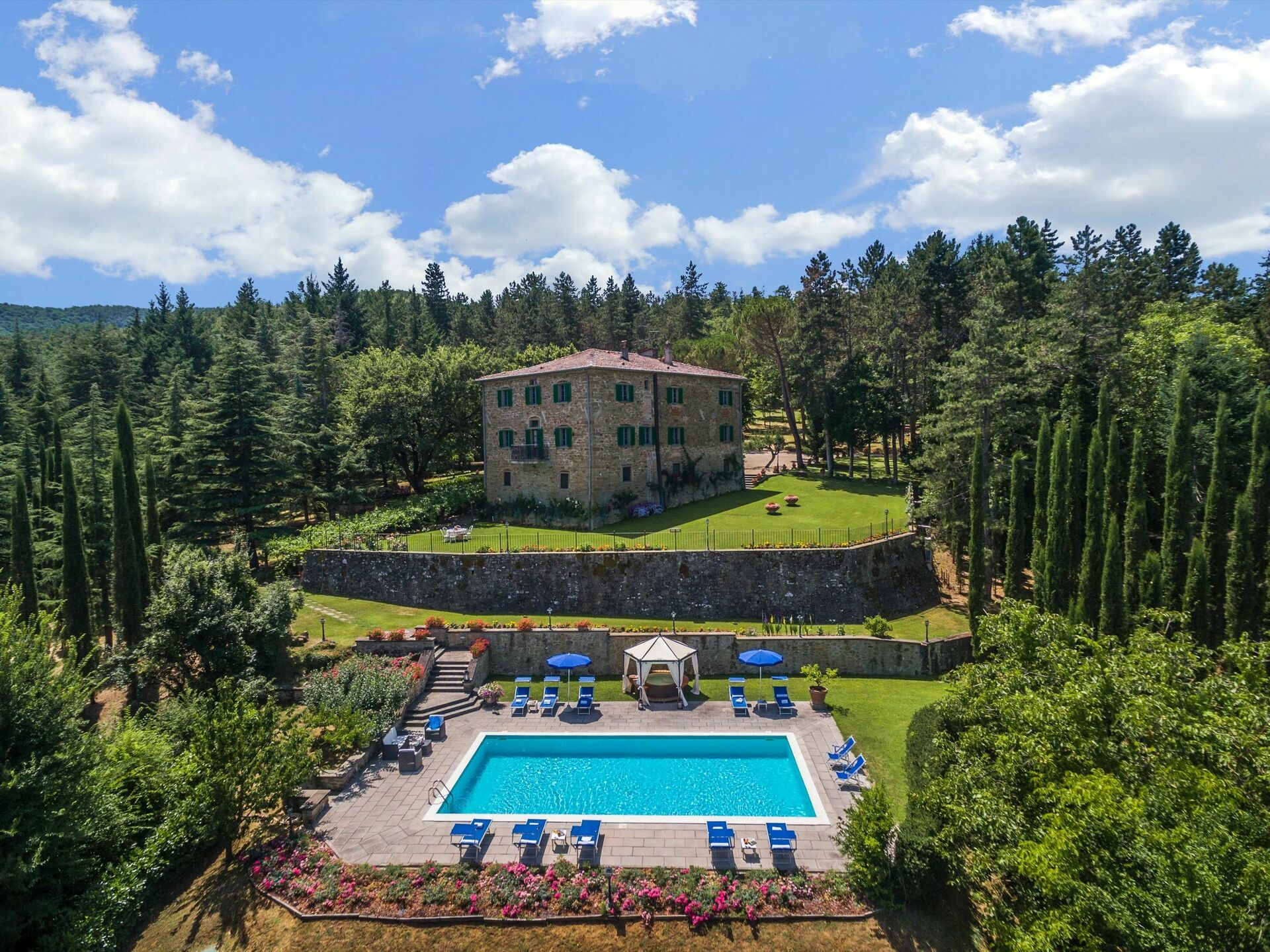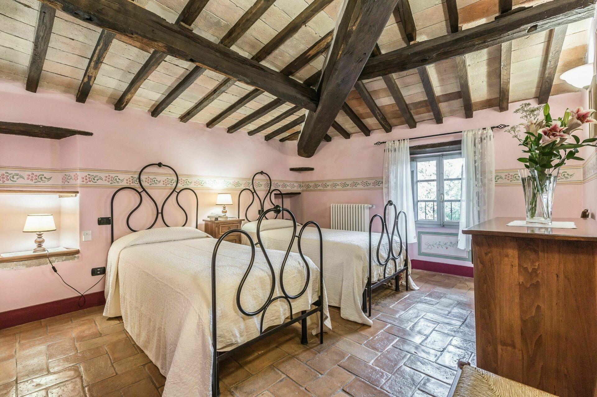 The two properties are full of character but they are only made more appealing by the outdoor space of this estate with the woods; the three hectares of groomed gardens across three terraces; the endless outdoor dining areas and benches taking in pretty views of the Tuscan countryside for outdoor meals or escaping with a coffee and a good book for a while; and two swimming pools (one of which 12 x 6 mt; depth: 1,5 mt) with sun-loungers, a heated Jacuzzi (avaliable on request), and an old stone barn that has been made into a large shower and changing room with bathroom facilities. This wonderful exterior space of the estate is ideal for an outdoor wedding and means that incredible wedding meals can be arranged at tables set up on those terraces taking in sweeping views across the rolling hills of the Tuscan landscape, wedding ceremonies can take place in the pretty Italian garden with flowers all around, and your guests have plenty to do and keep themselves occupied with around the special day, allowing everyone to make incredible memories. For your wedding photography, too, there are endless stunning backdrops to perfectly capture your magical and romantic wedding in this fairytale setting.