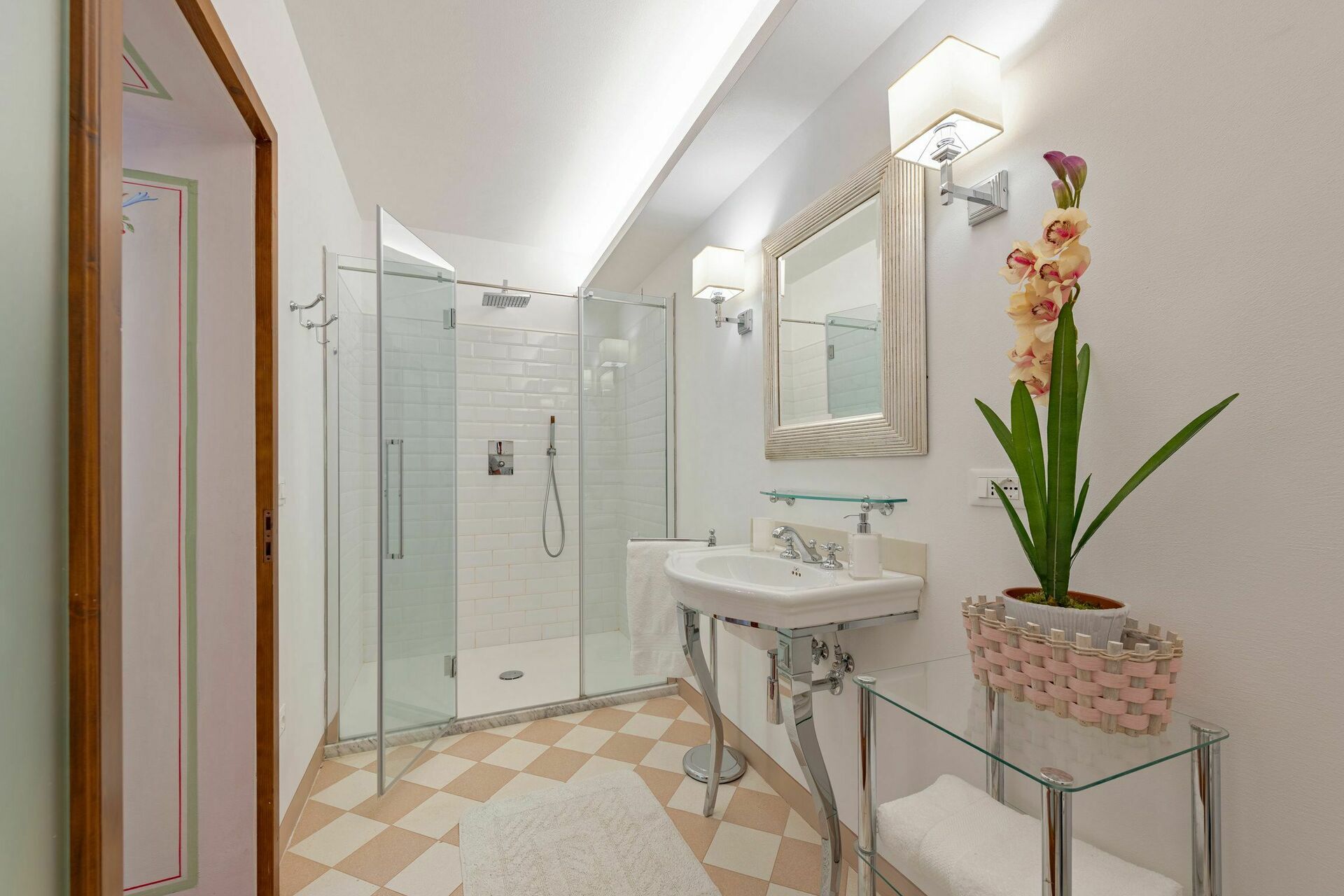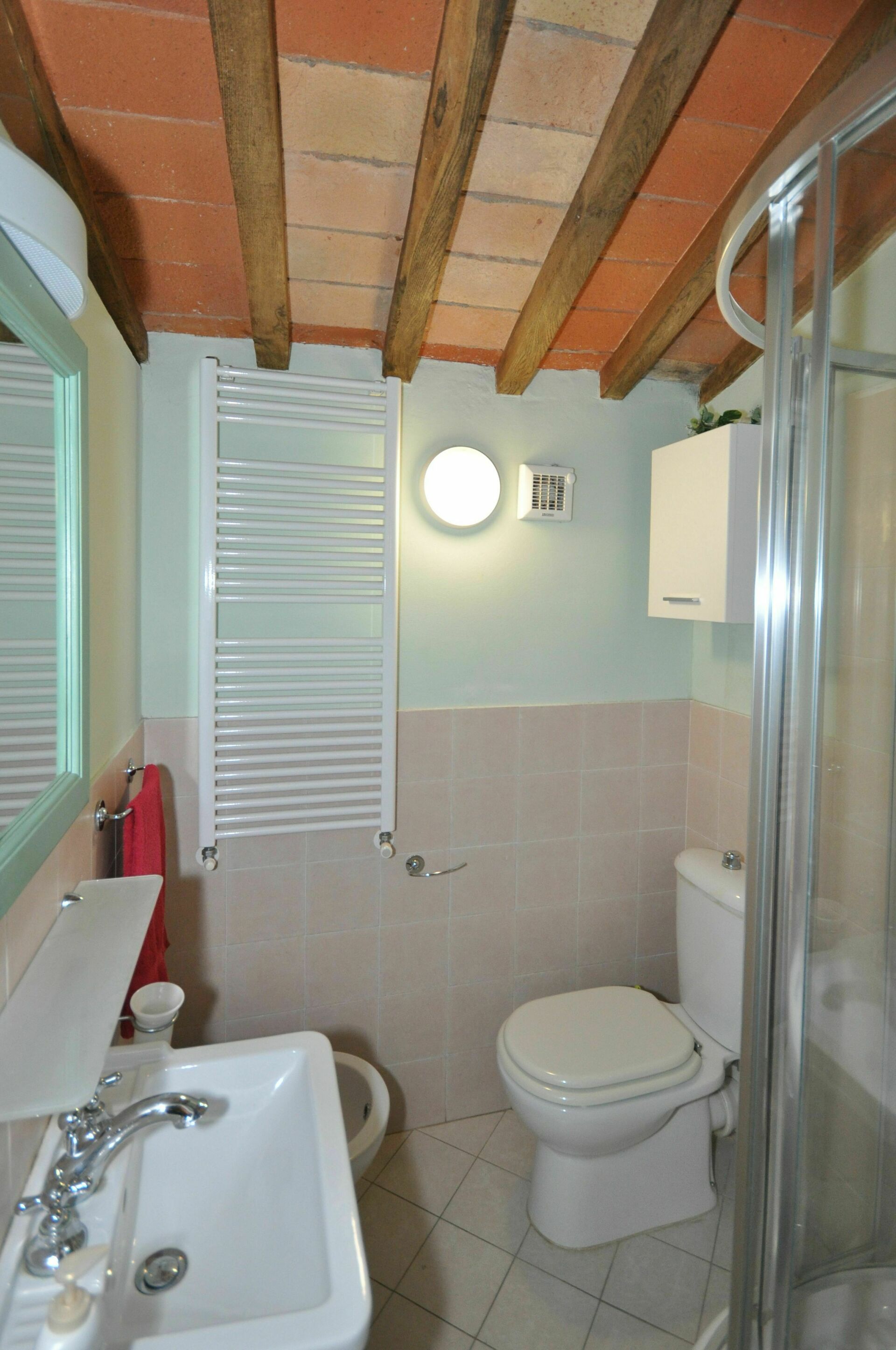 Bathroom: basin, toilet, shower.