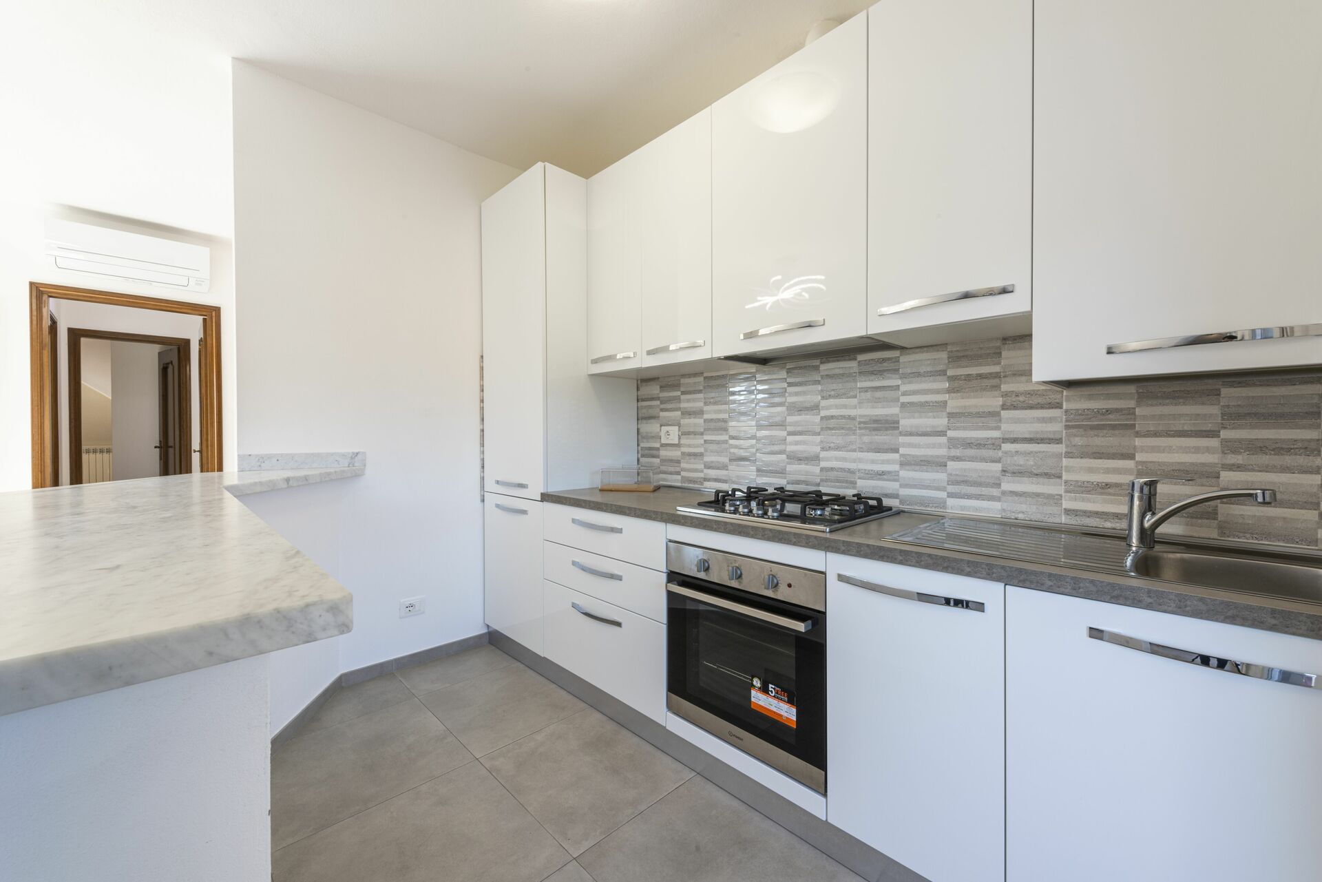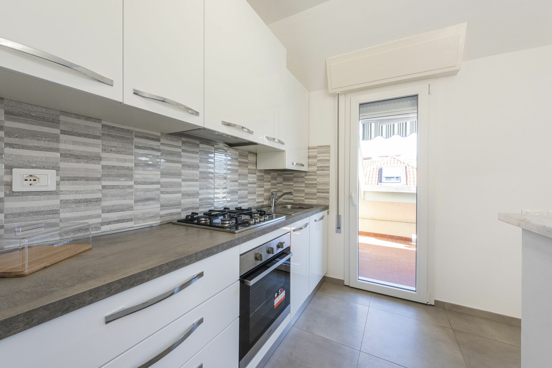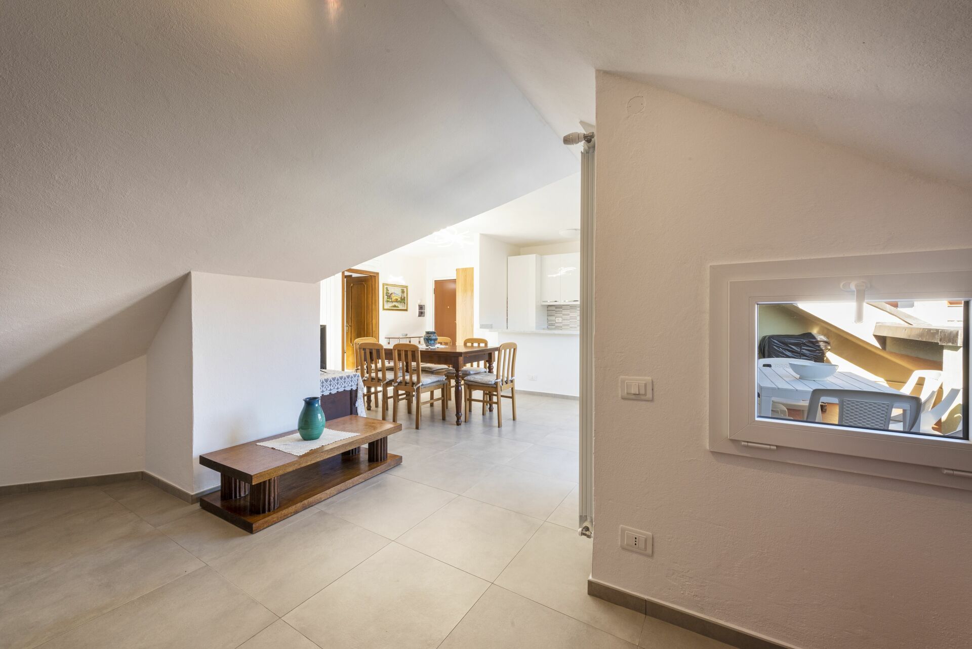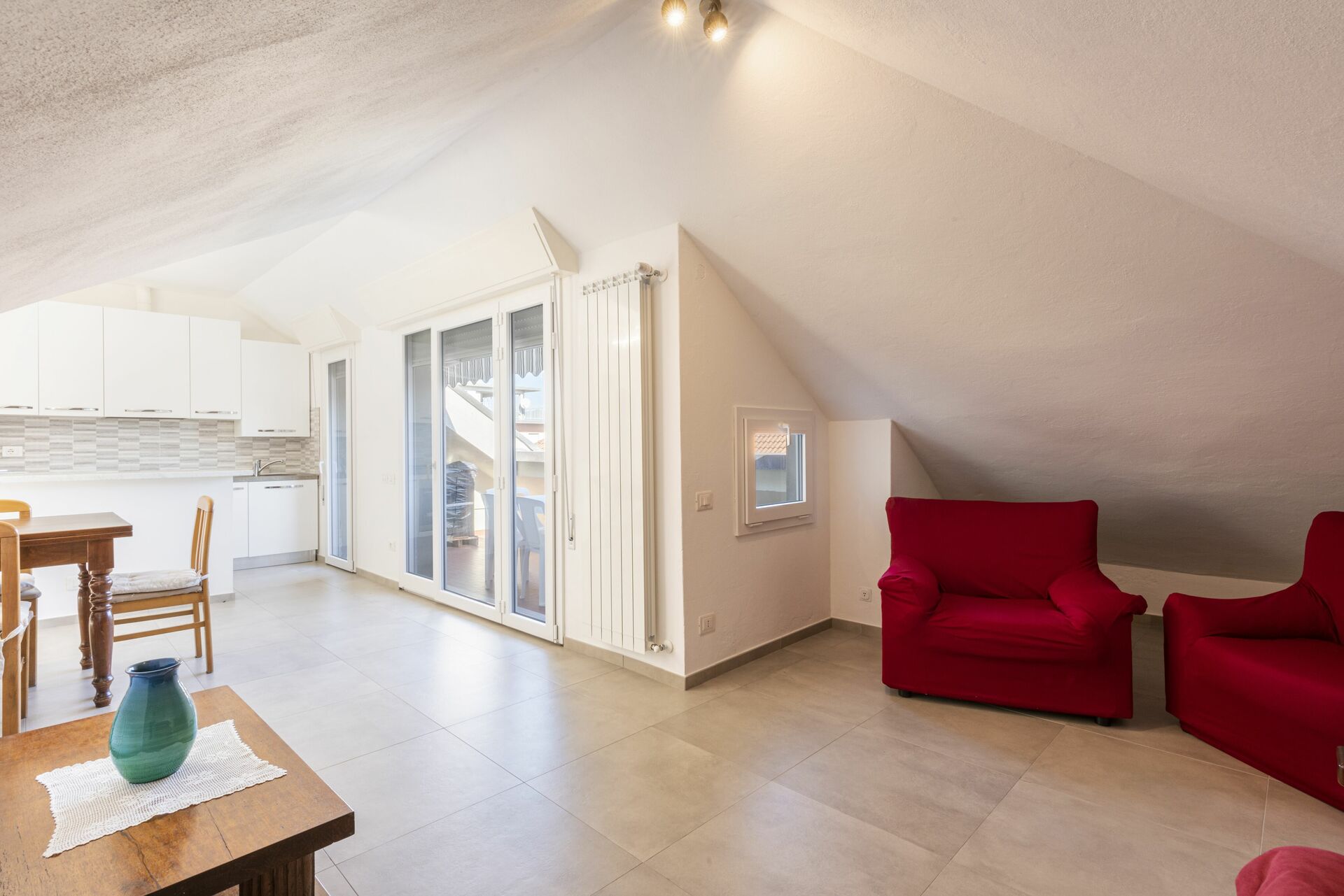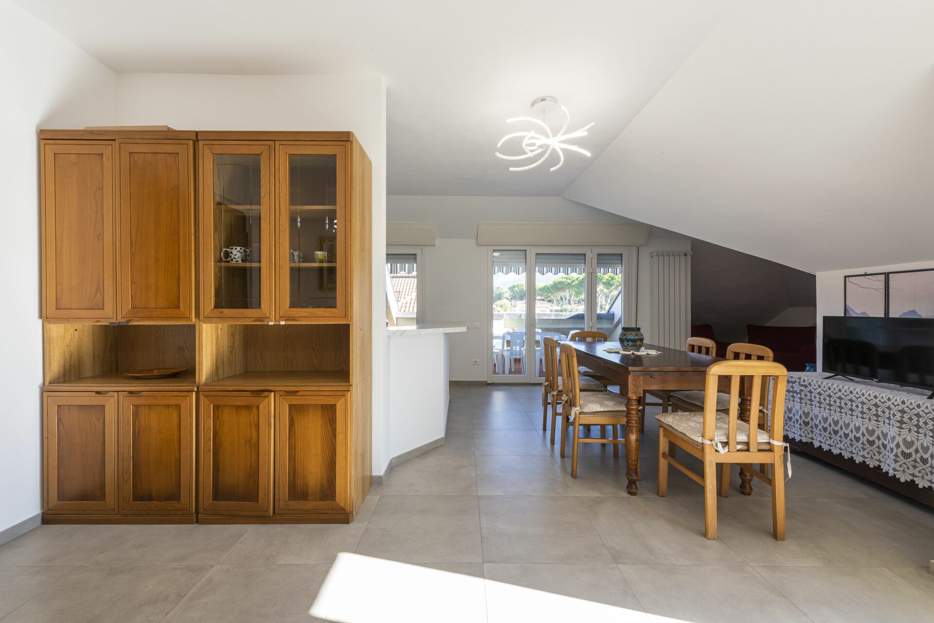 Kitchen + living room: dining table (people: 6), fridge, freezer, stove top, oven, two armchairs, sofa bed double, television, exit to the terrace.