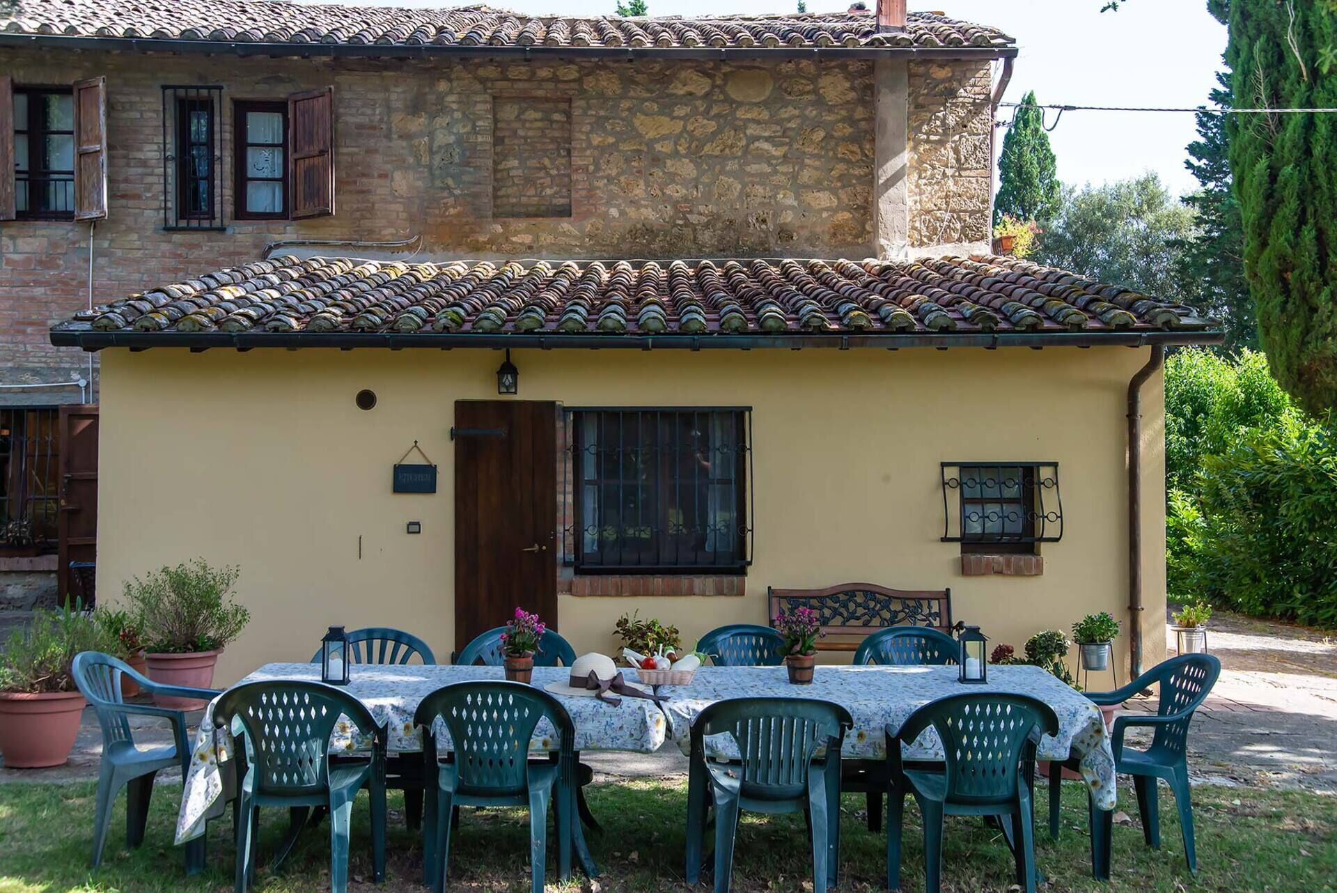 After arriving you’ll find a lovely clean well-maintained property with views of the hills ideal for a peaceful holiday in Tuscany. For your enjoyment you will find a private pool where you can relax while enjoying a nice cold beverage after a hectic day of shopping. For your pleasure, on the grounds there is a hot tub, playground and barbecue grill. If you enjoy cooking for family and friends there is a well-equipped kitchen including coffee machine, microwave, toaster, stove and refrigerator, as well as, plenty of tableware and cutlery for up to 14 people. If you prefer to dine 'al fresco', there is a fully furnished garden where you can enjoy the weather while dining outdoors.