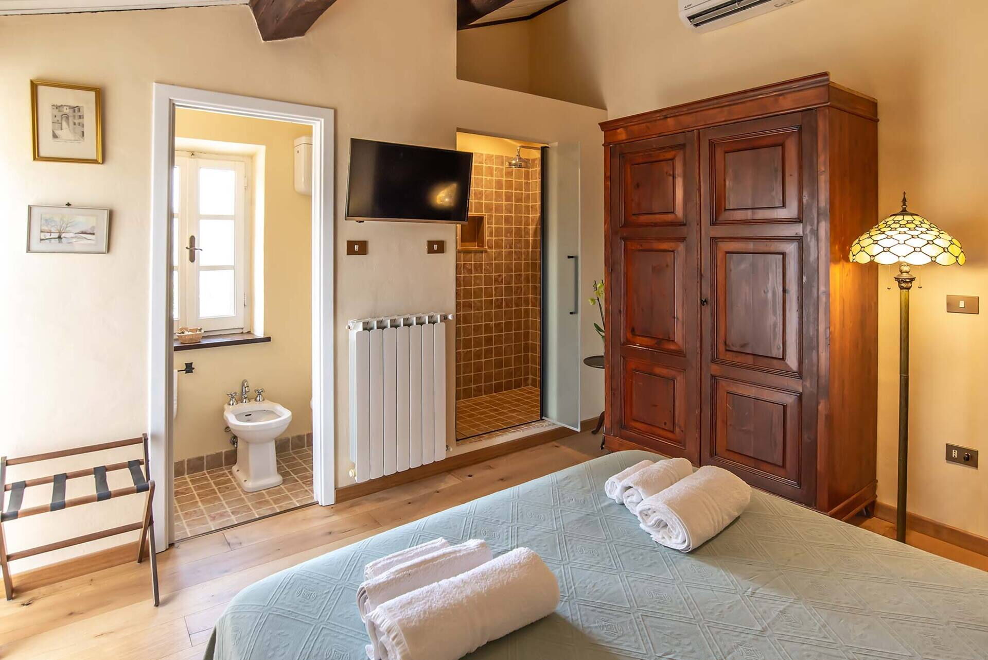 Bedroom + Ensuite Bathroom 1 (16 m2): double bed, single bed, baby crib, WIFI internet, air conditioning, mosquito net, television, portable fan, working desk, basin, toilet, bidet, shower, hairdryer.