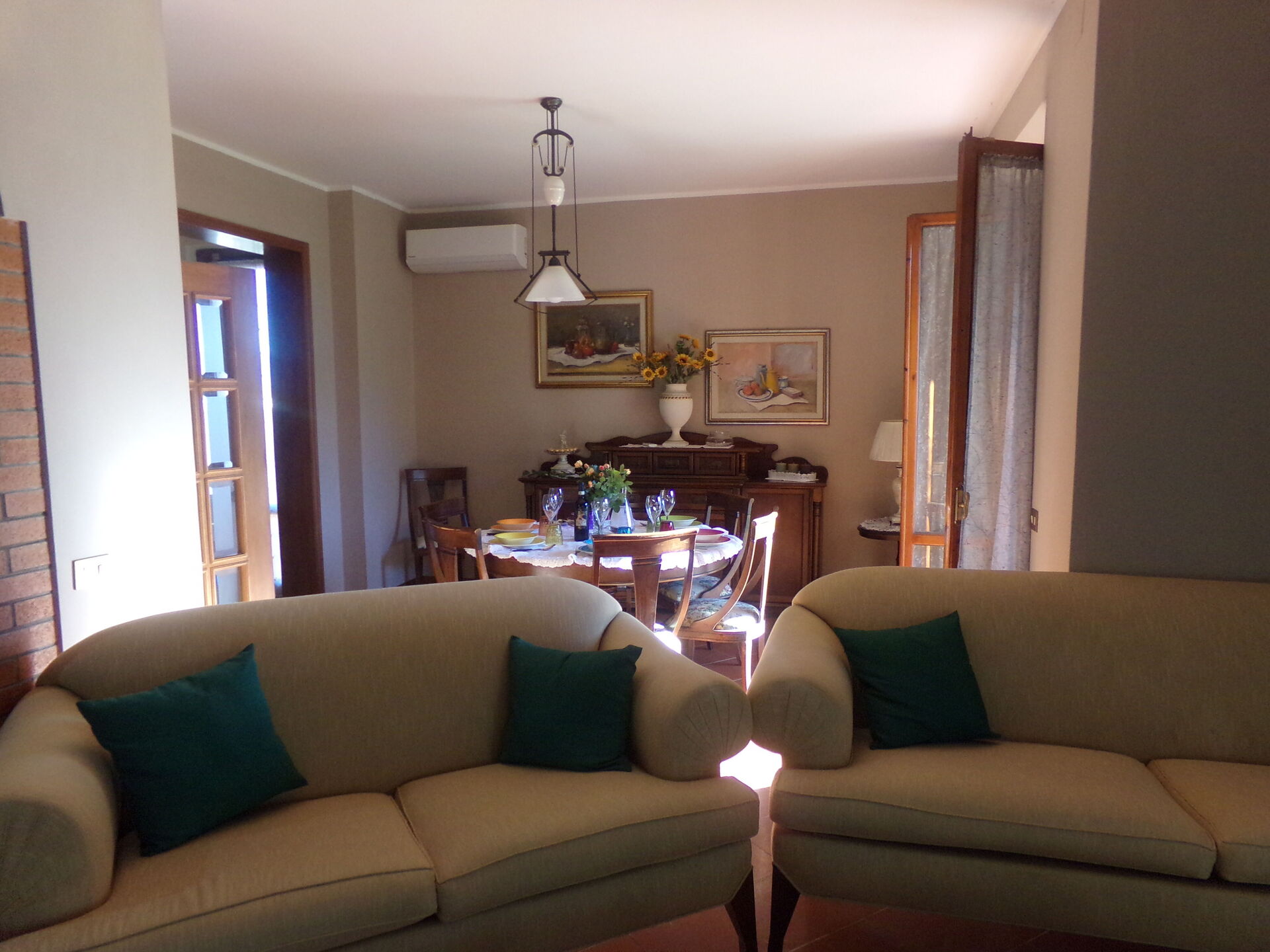 Living room (17 m2): two sofas (people: 6), armchair, WIFI internet, air conditioning, television, exit to the garden.