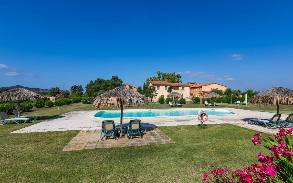 This stunning residence in Scarlino, Italy offers 12 spacious apartments surrounded by tranquil trees and vineyards. The property boasts a range of amenities for shared use, including a 1,500 m2 fully fenced park, a beautiful garden, and a large seasonal swimming pool measuring 14 x 6 m with a depth of 110-140 cm, available from June 1st to September 30th. Enjoy the convenience of an outdoor shower, barbecue area, parking, and internet wifi throughout the property.