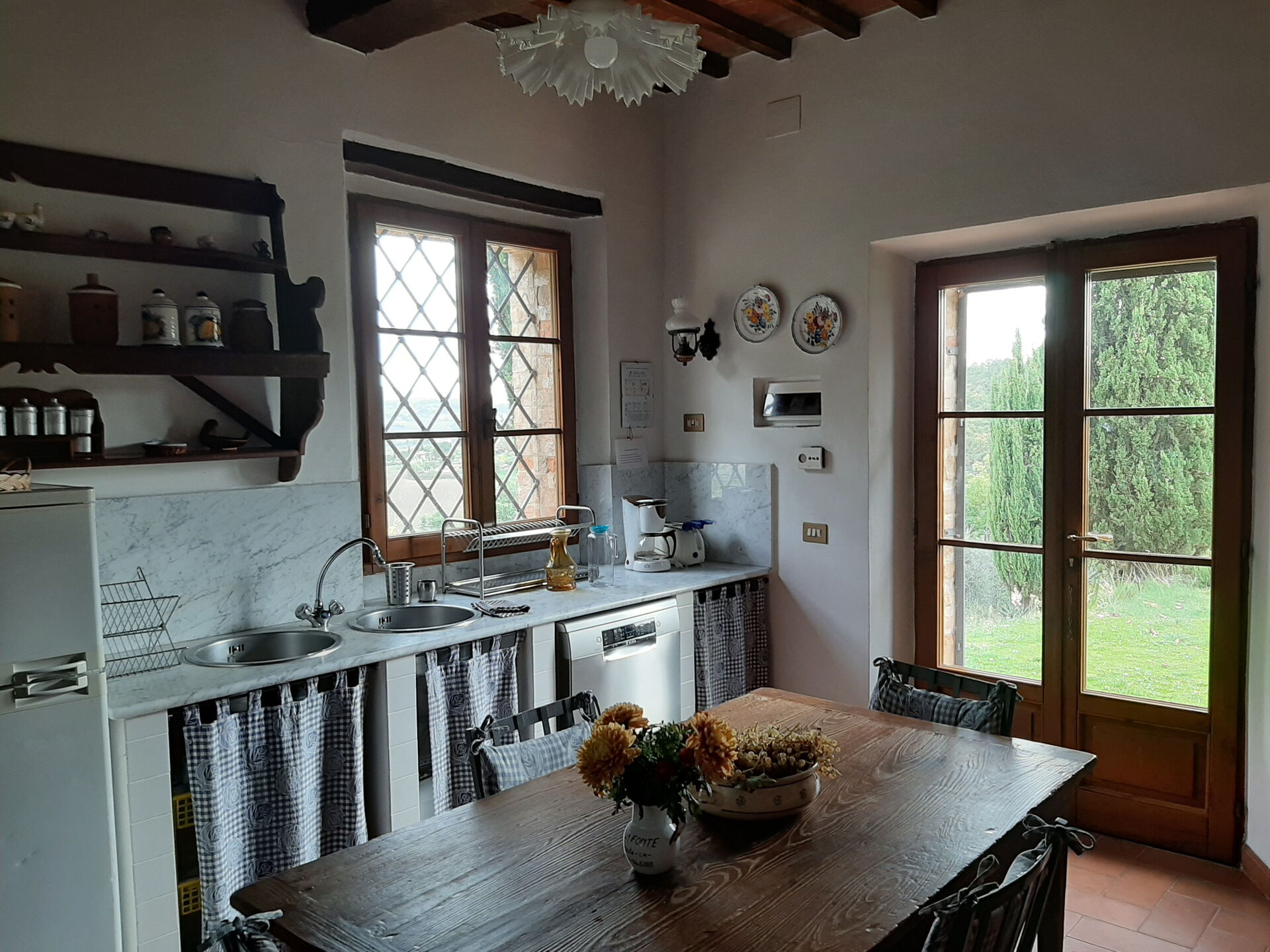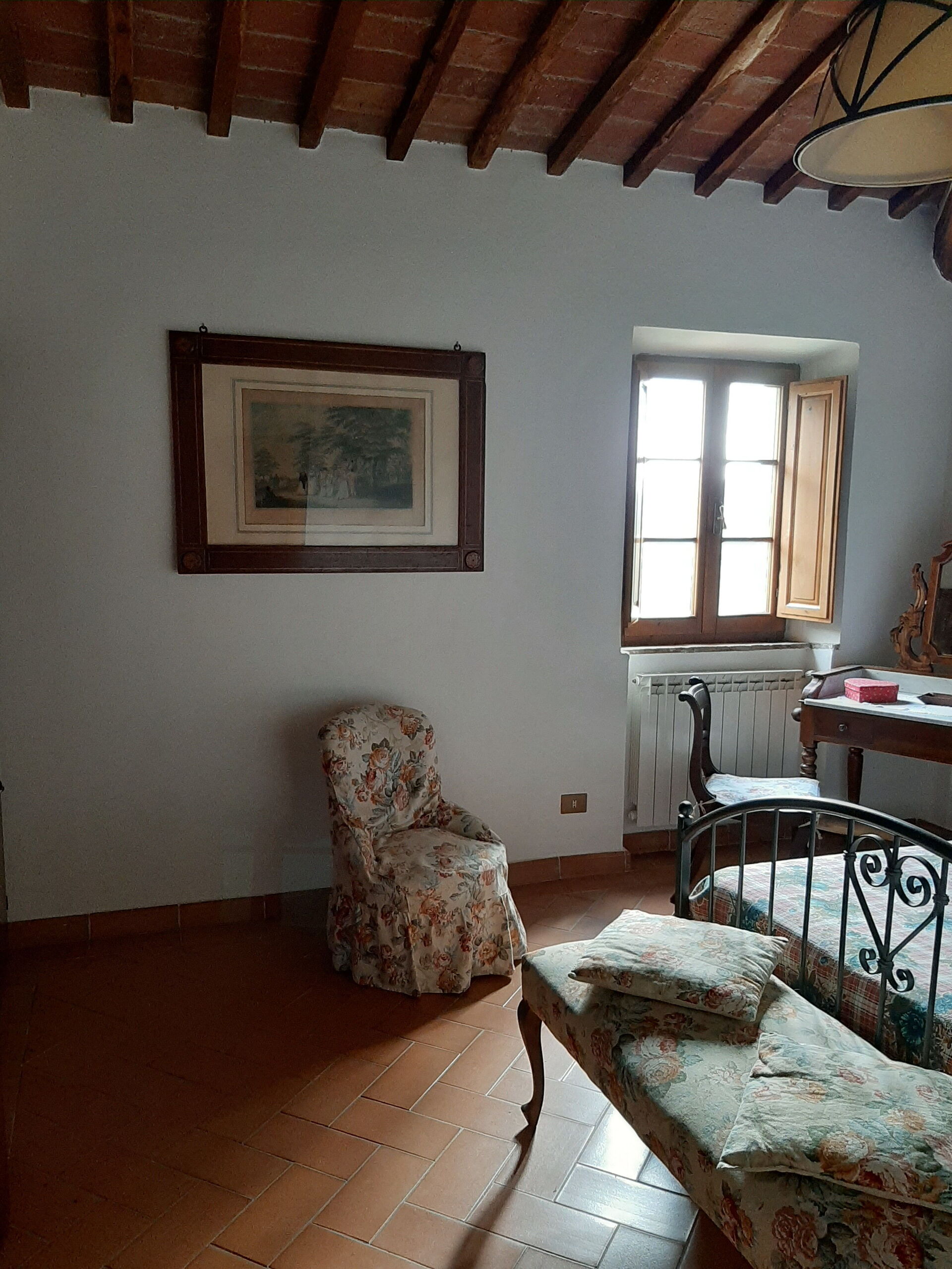 When you arrive you will be greeted by the owner or manager where you’ll find a lovely clean well-maintained property with views of the hills perfect for a splendid holiday in Tuscany. For your pleasure you will find a private garden where you can unwind while enjoying a nice cold beverage after a hectic day of visiting museums. A real benefit of renting a home, instead of multiple hotel rooms, is the ability to relax after a busy day of sightseeing with family and friends. Enjoy a meal together along with some local wine to finish the day. Dining with friends and family is a big part of the Tuscan culture. Take advantage of the kitchen to prepare meals using local produce while on your vacation. The kitchen includes coffee machine, toaster and refrigerator, as well as, plenty of tableware and cutlery for up to six people.