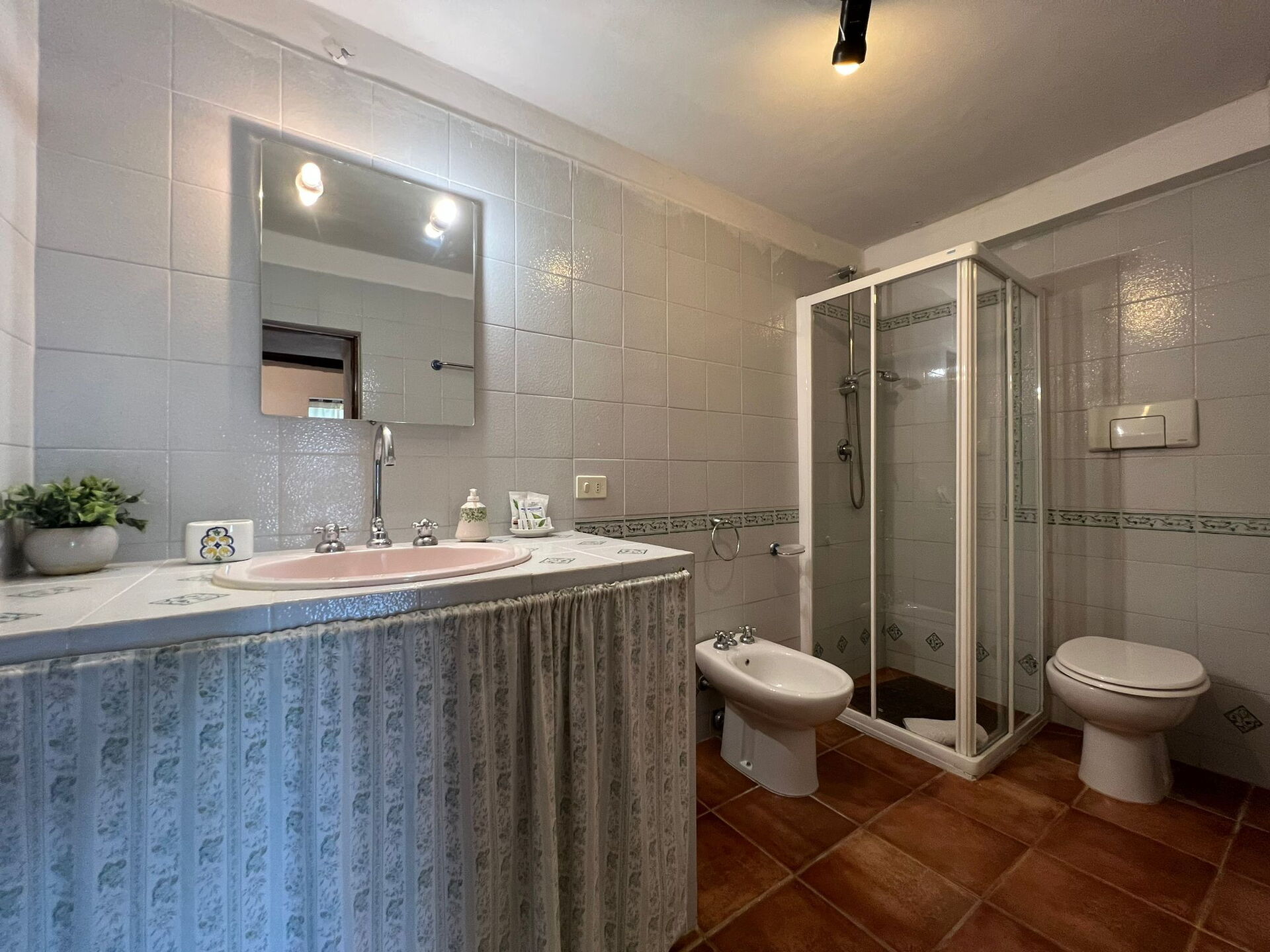 Bathroom: basin, toilet, bidet, shower, hairdryer.