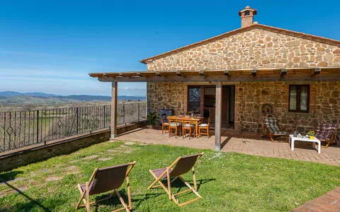 The house offers a marvelous panoramic view of the sea and the countryside. Only non-smokers are allowed to stay at the property. Pets are allowed, and up to two dogs can be accommodated. However, there is no internal connecting door between the separated properties. The maximum occupancy of the house is seven adults and two children under the age of 12. One room on the lower floor has a completely separate entrance and is occasionally used by the caretaker. Civitella is a beautiful vacation home that offers a comfortable and cozy stay, equipped with all the necessary amenities for a relaxing and enjoyable vacation.