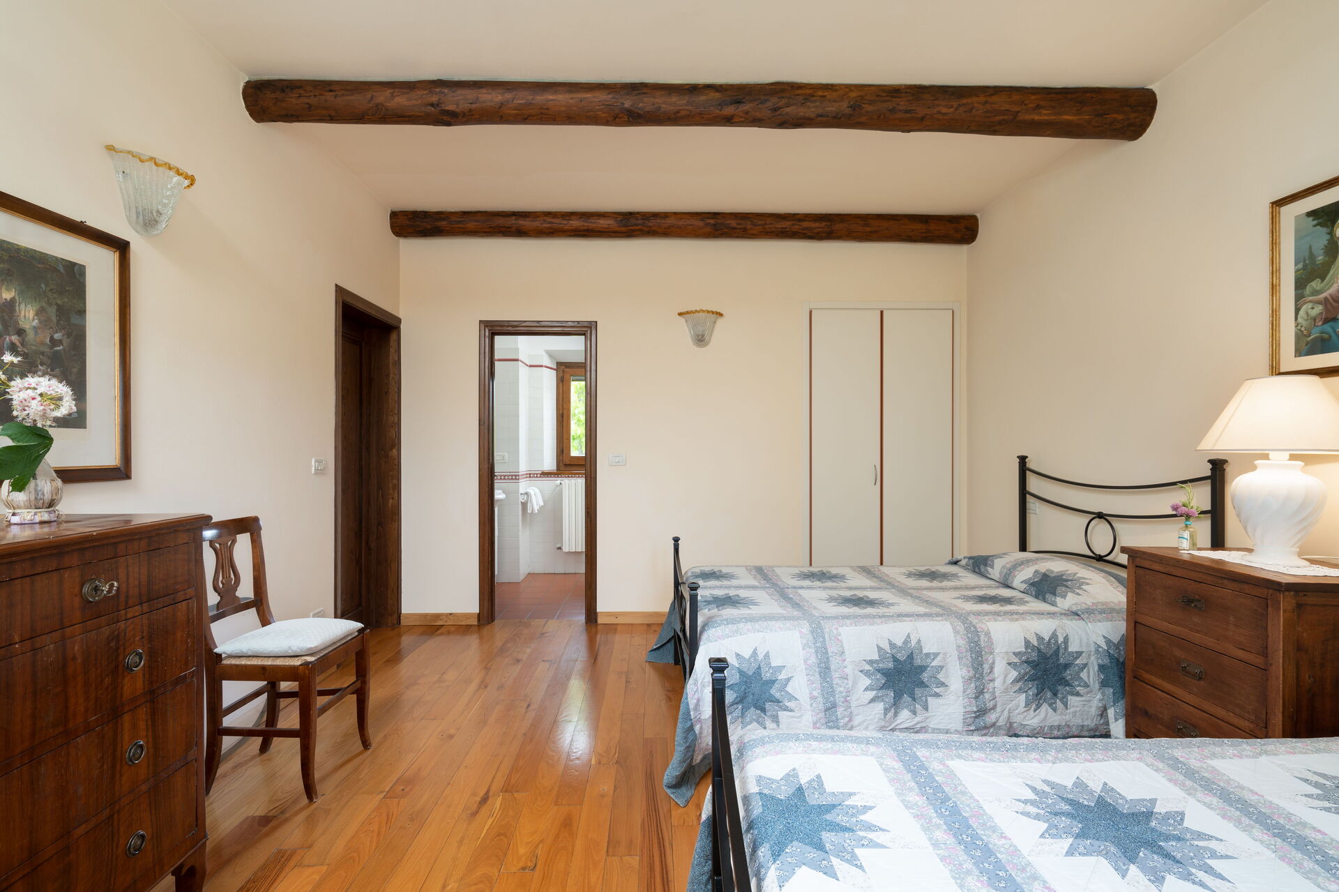 Bedroom + Ensuite Bathroom 2: two single beds, WIFI internet, air conditioning, mosquito net, basin, toilet, bidet, shower.