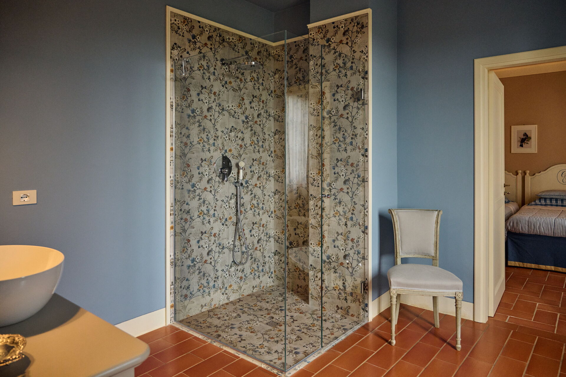 First floor: double bedroom with private bathroom with shower and walk in closet, suite with living corner and a bathroom with shower with access to double bedroom (4 steps down), double bedroom with private bathroom with shower, bedroom with 2 single beds, bathroom with shower, double bedroom with private bathroom with shower, bedroom with private bathroom with shower and access to loft with double bed.