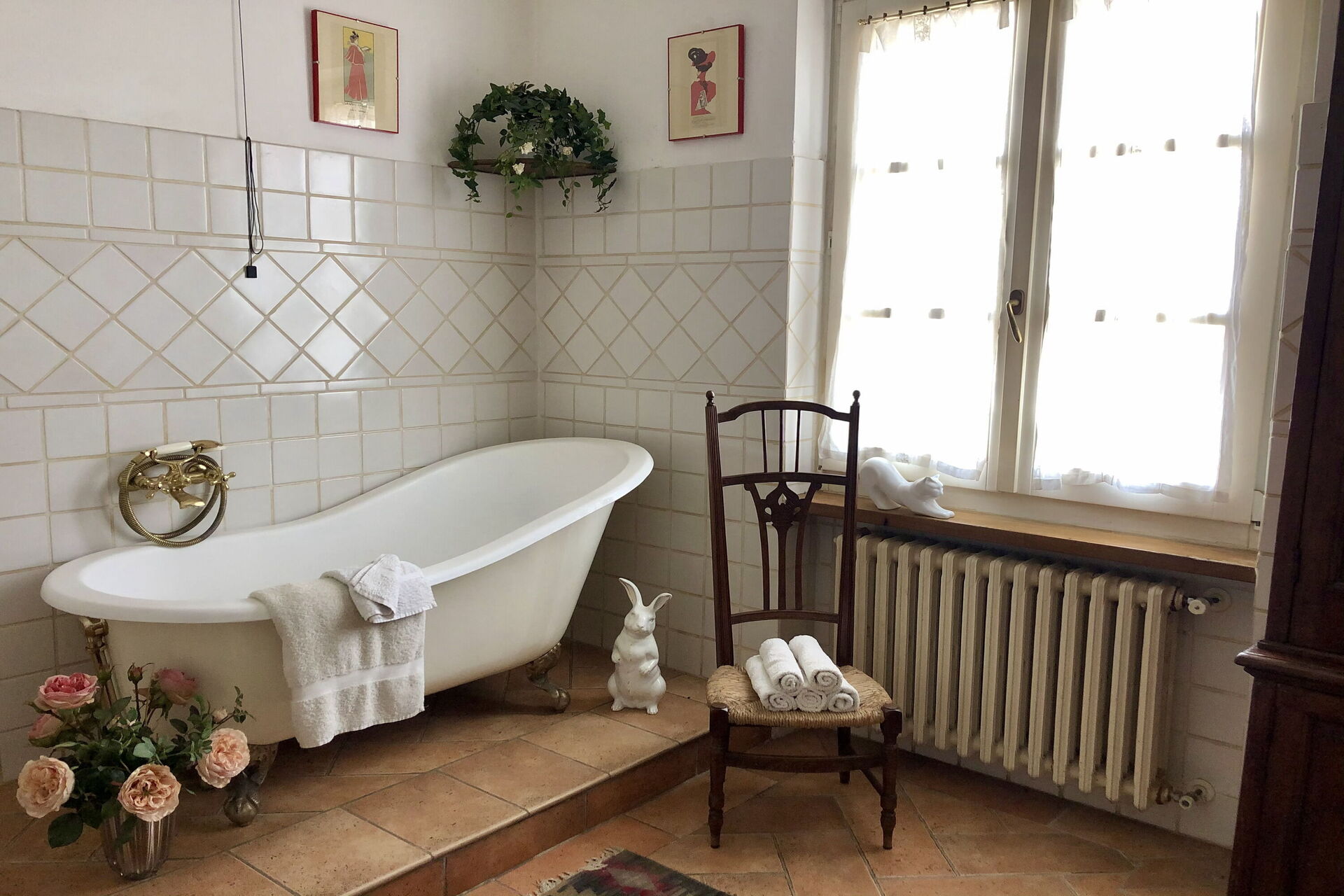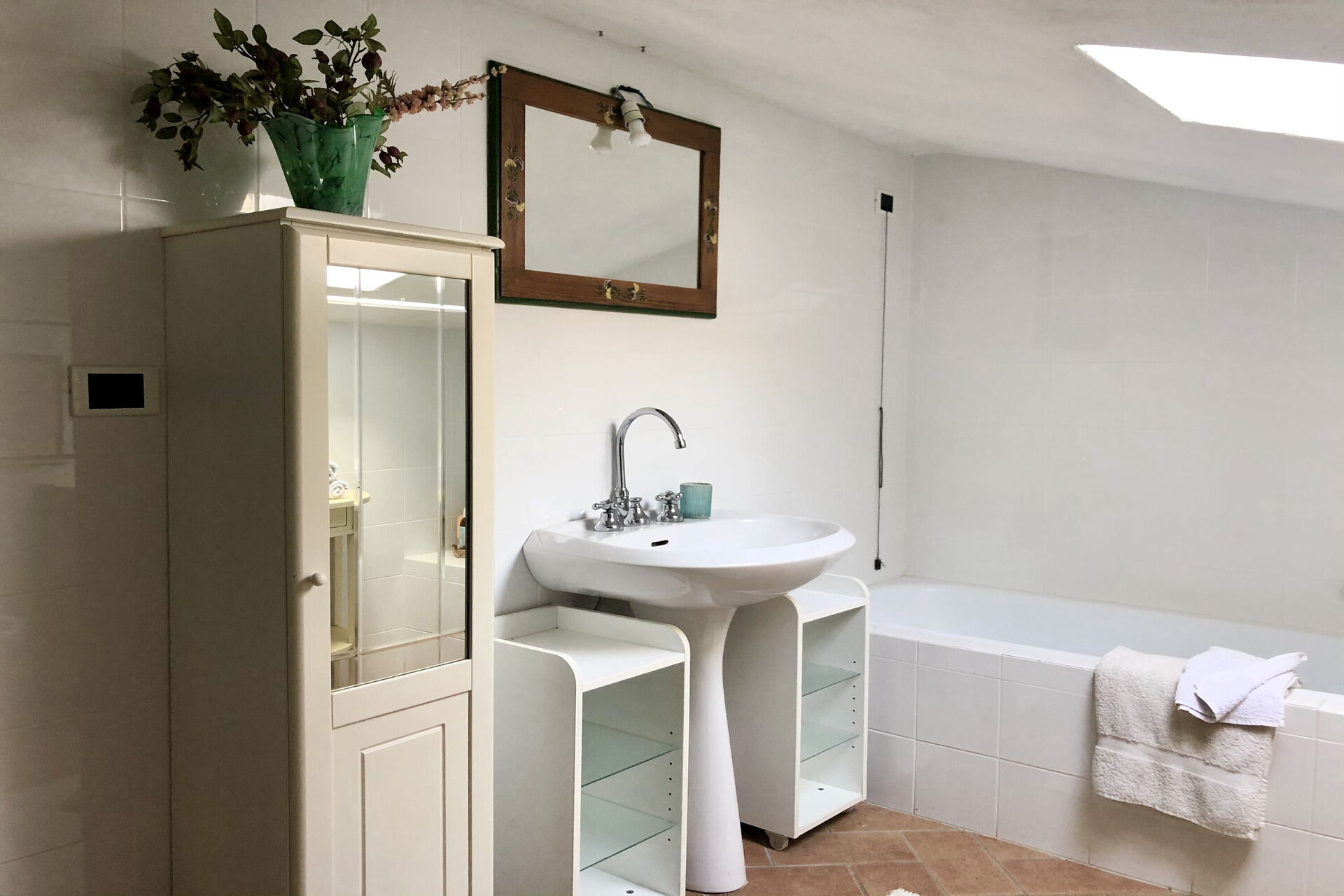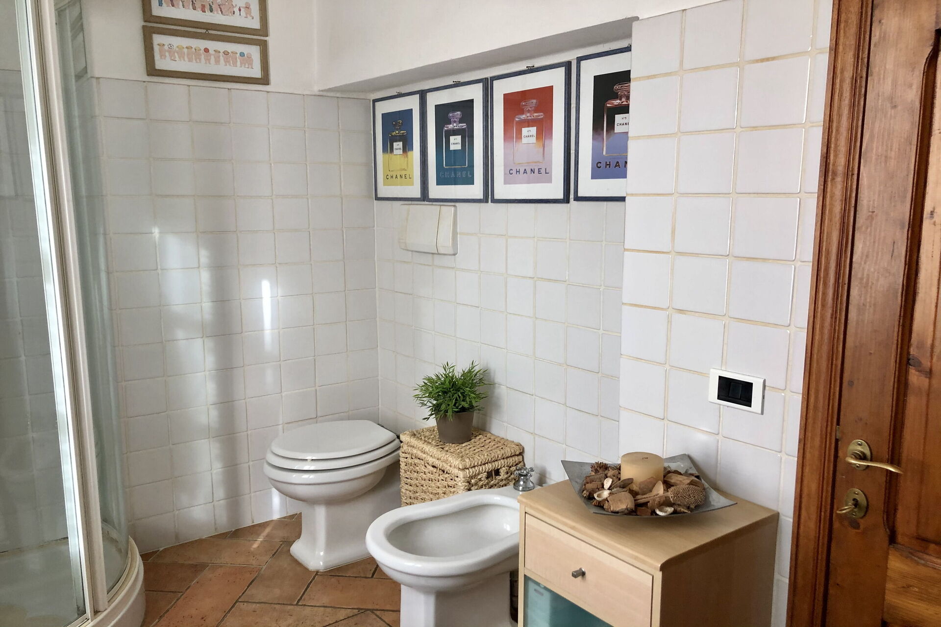 Bathroom 2: basin, toilet, bidet, bathtub.