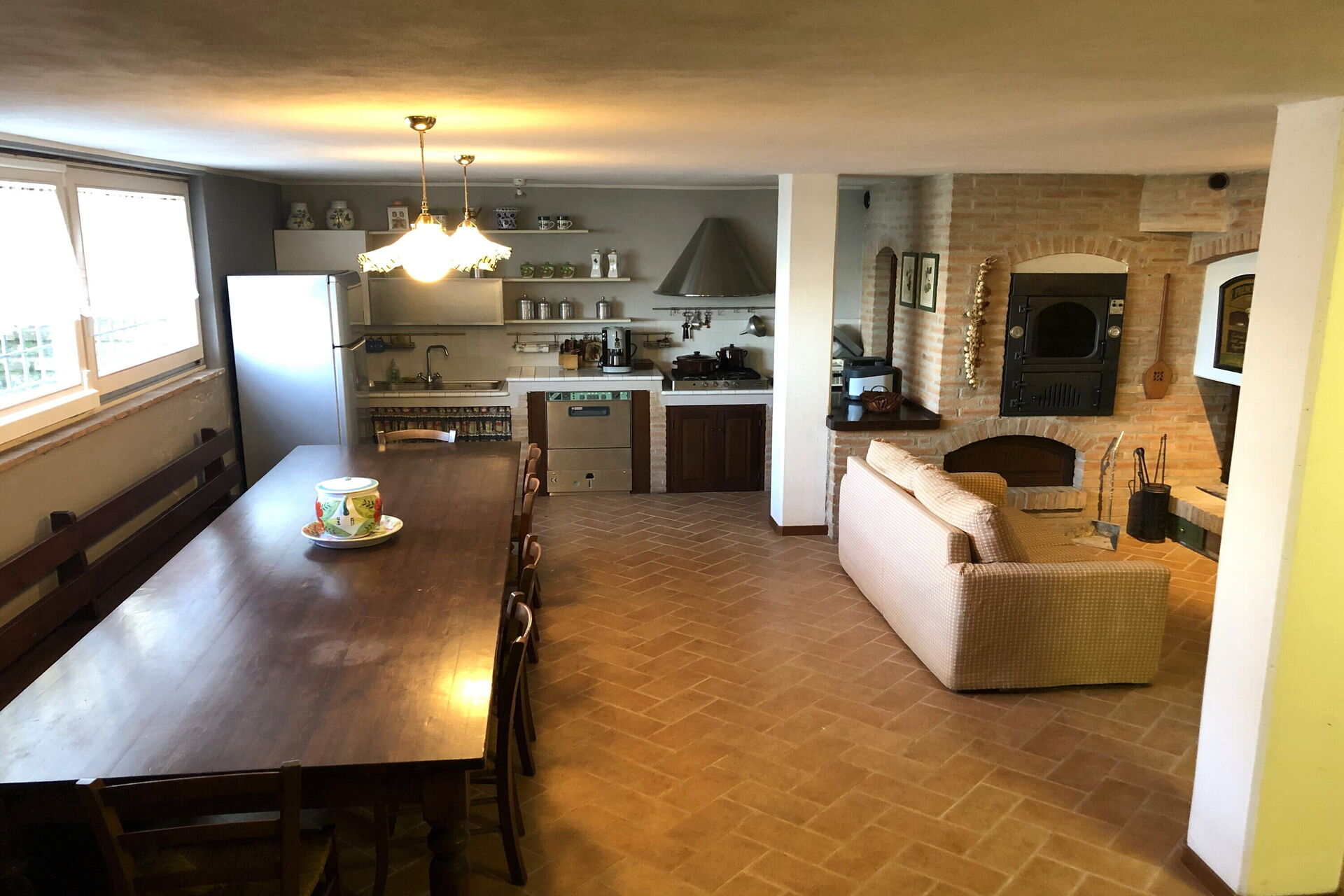Kitchen + living room: dining table (people: 10), dishwasher, fridge, freezer, stove top, oven, toaster, italian coffee machine, sofa, television.
