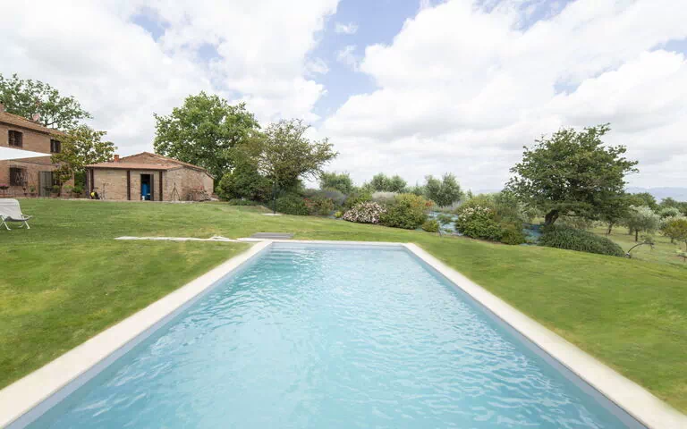 Country house "Pietraia" is a detached vacation rental surrounded by fields and vineyards in Cortona, Italy. It boasts a private park spanning 7,500 square meters, a seasonal swimming pool (4 x 8 meters, 160 cm depth), and Internet WiFi. Enjoy the outdoor shower, garden furniture, barbecue house, and parking on the premises.