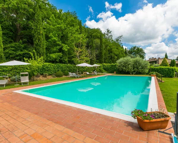 Nestled among rolling hills, lush trees, and picturesque vineyards in the heart of Tuscany, Italy, Borgo Roccaia is a beautifully renovated residence that offers an exceptional holiday rental experience in one of the most evocative landscapes of the region. Renovated in 2020, this charming residence comprises 20 houses and is situated approximately 6 kilometres from the historic centre of San Gimignano, perched in a secluded position atop a hill and surrounded by the tranquil beauty of the Tuscan countryside. The property benefits from a shared fenced swimming pool measuring 9 x 18 metres, available seasonally from 1 June to 30 September, with opening hours from 09:00 to 20:00, ensuring a refreshing retreat during the warmer months. The expansive natural-state grounds serve as a generous yard, offering guests a sense of space and privacy within a serene rural setting. Wireless internet connection is available at the property, keeping you connected even in this peaceful countryside retreat. Parking is conveniently provided on the premises, making arrival and departure straightforward for those travelling by car.