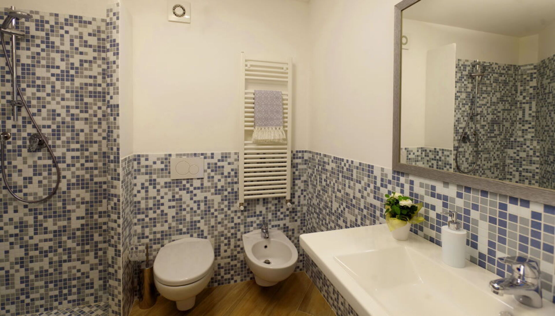 Bedroom + Ensuite Bathroom 2: double bed, single bed, WIFI internet, air conditioning, basin, toilet, bidet, shower, exit to the balcony.