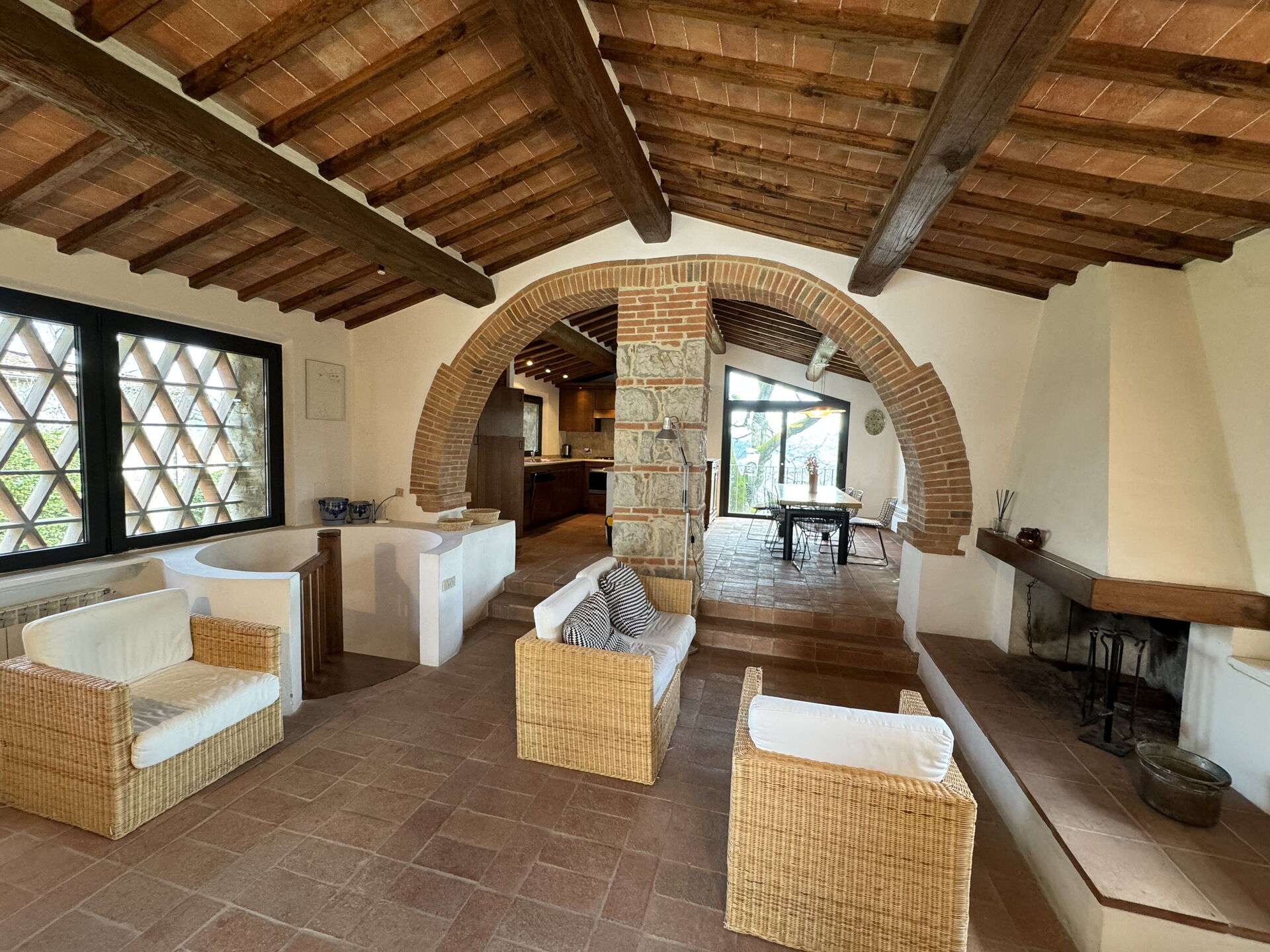 Living room: sofa (people: 2), two armchairs, fireplace, dining table (people: 6).