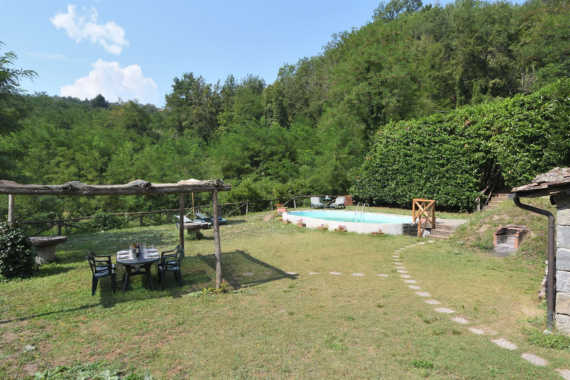 In the garden there is a private swimming pool, parking space, a gazebo and barbeque to eat outside while sipping a good glass of wine.