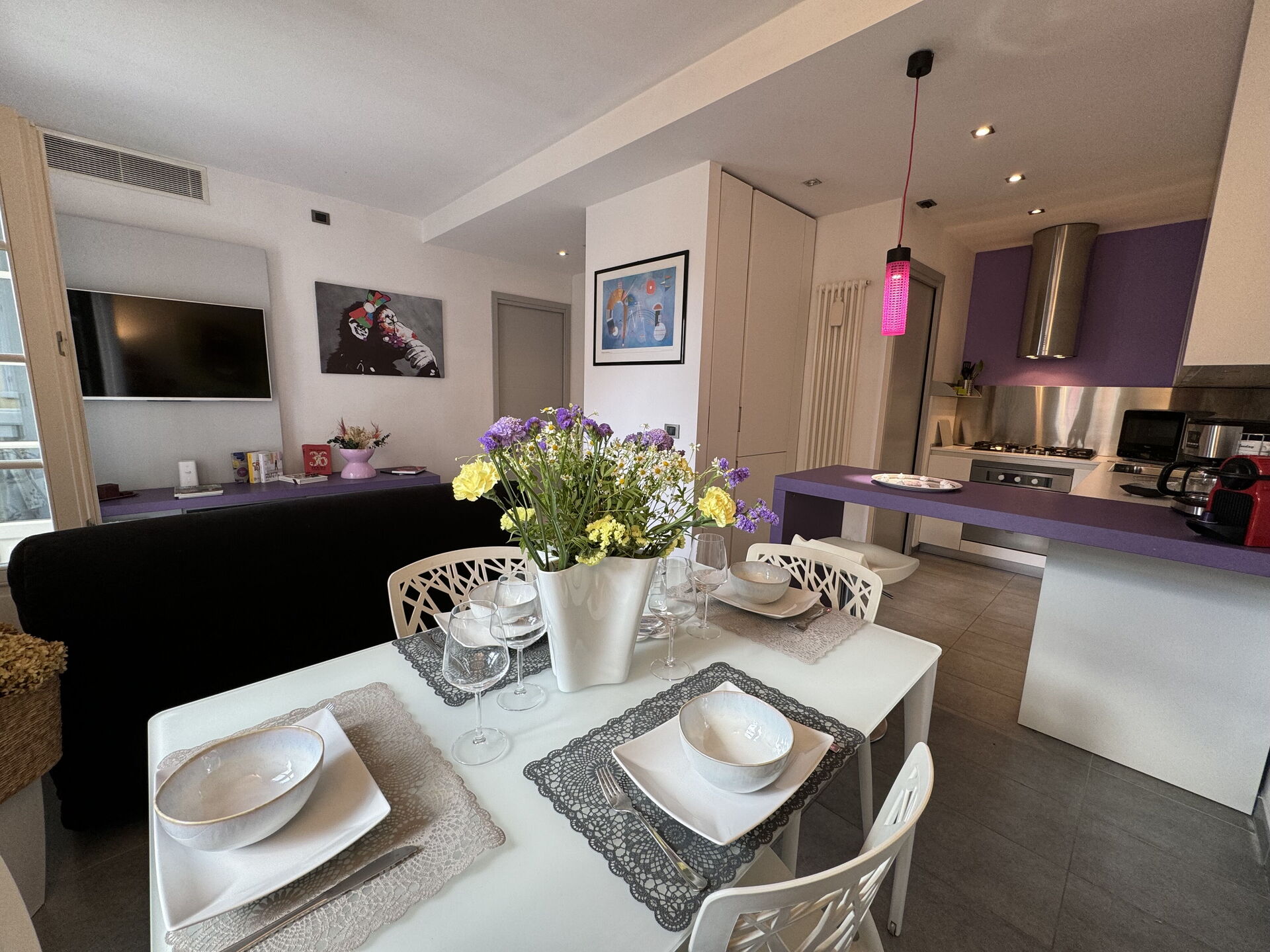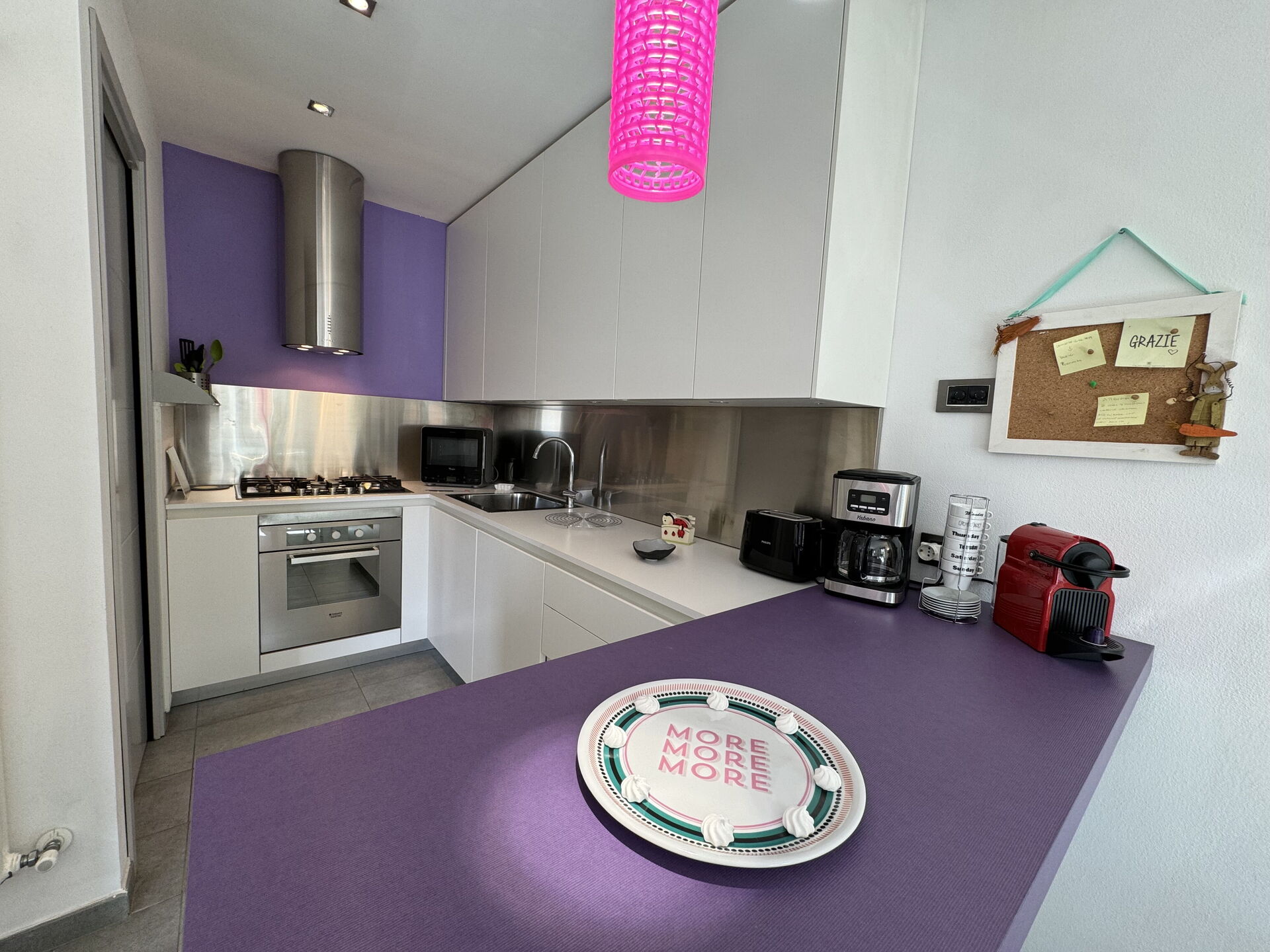 Kitchen + living room: well equipped kitchen, dining table, dishwasher, fridge, freezer, microwave, oven, toaster, italian coffee machine, american coffee machine, washing machine, sofa, WIFI internet, satellite tv, exit to the balcony.