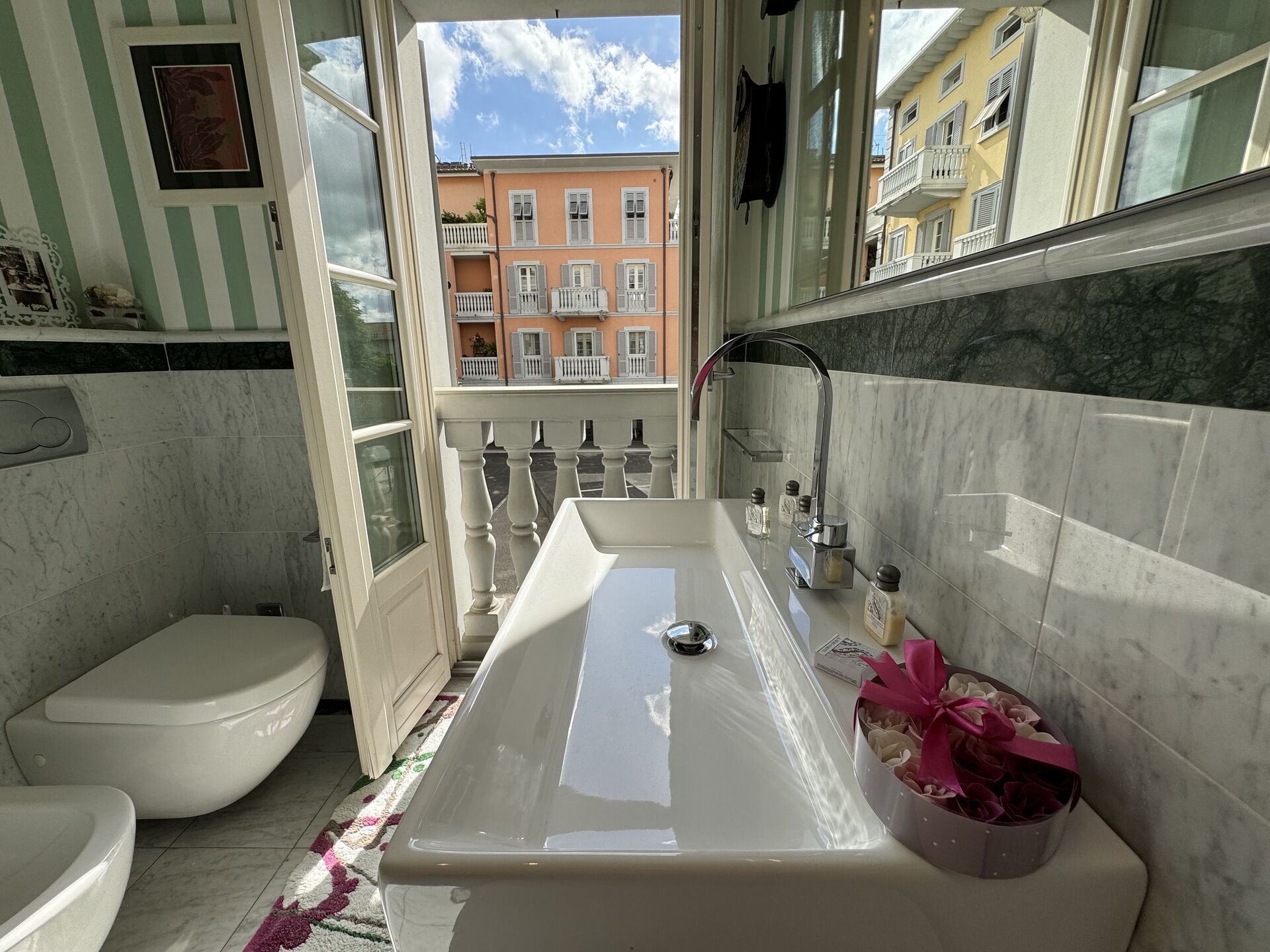 Bathroom: basin, toilet, bidet, bathtub, hairdryer.