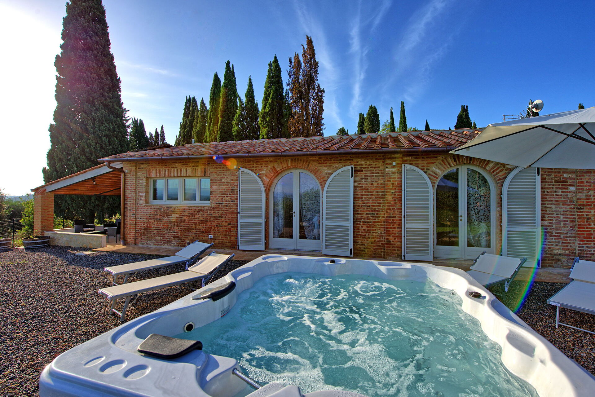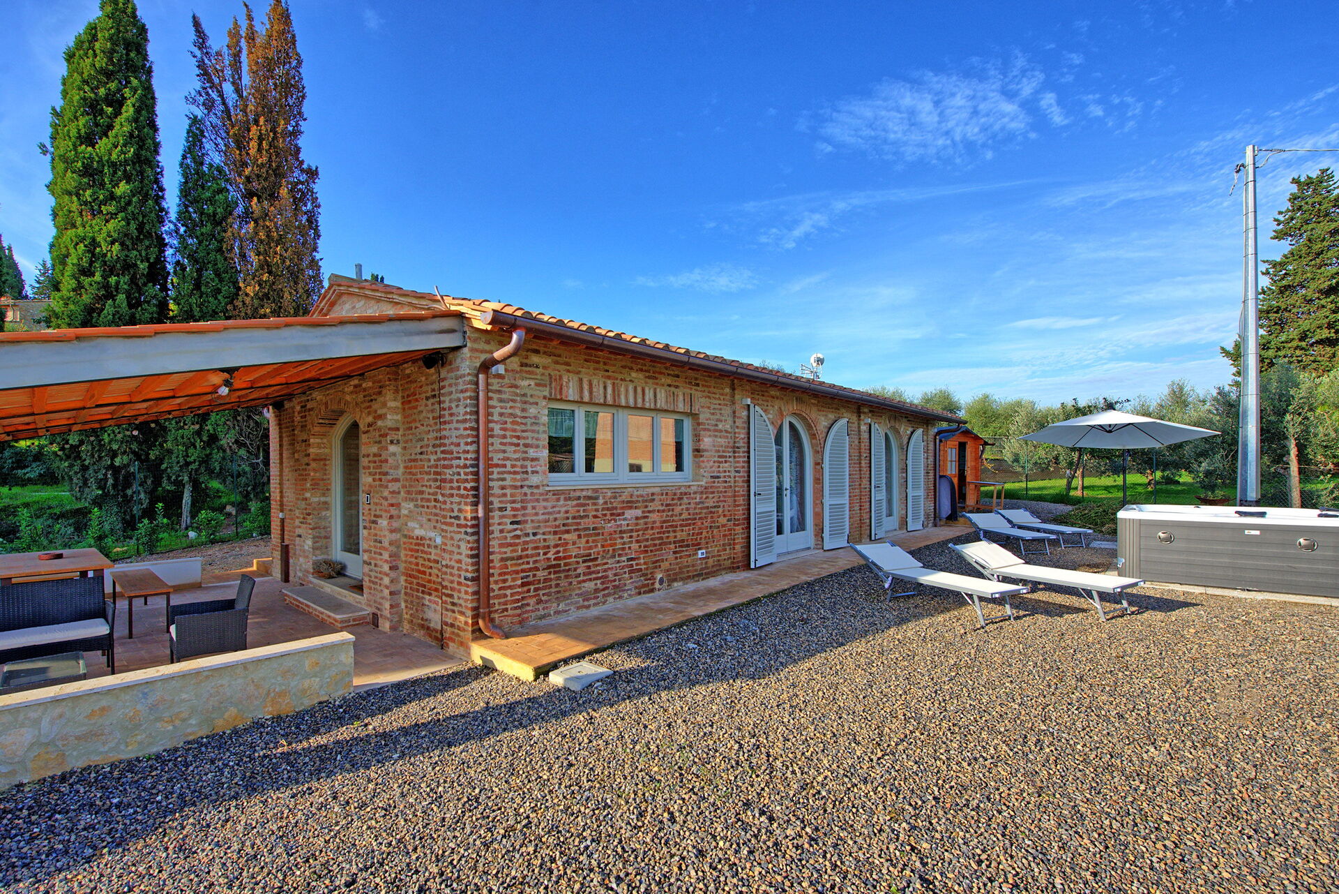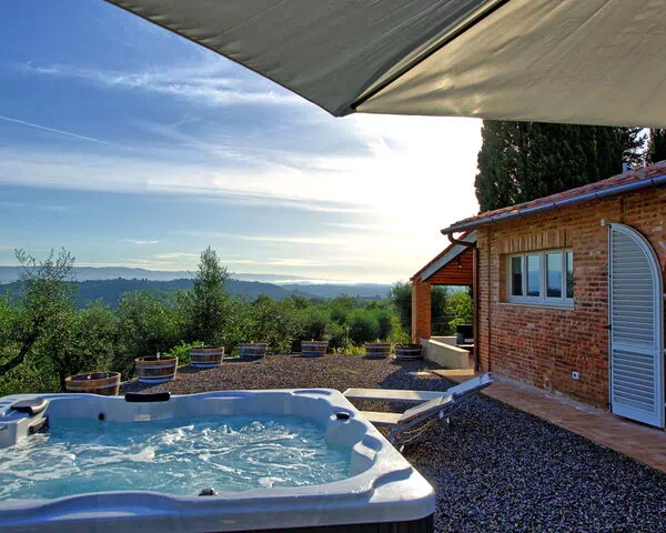 The interiors are tastefully furnished with traditional Tuscan materials. Outside, there is a private area furnished with a dining area where you can enjoy beautiful views of the surrounding landscape. Guests have an outdoor hot tub at their disposal.