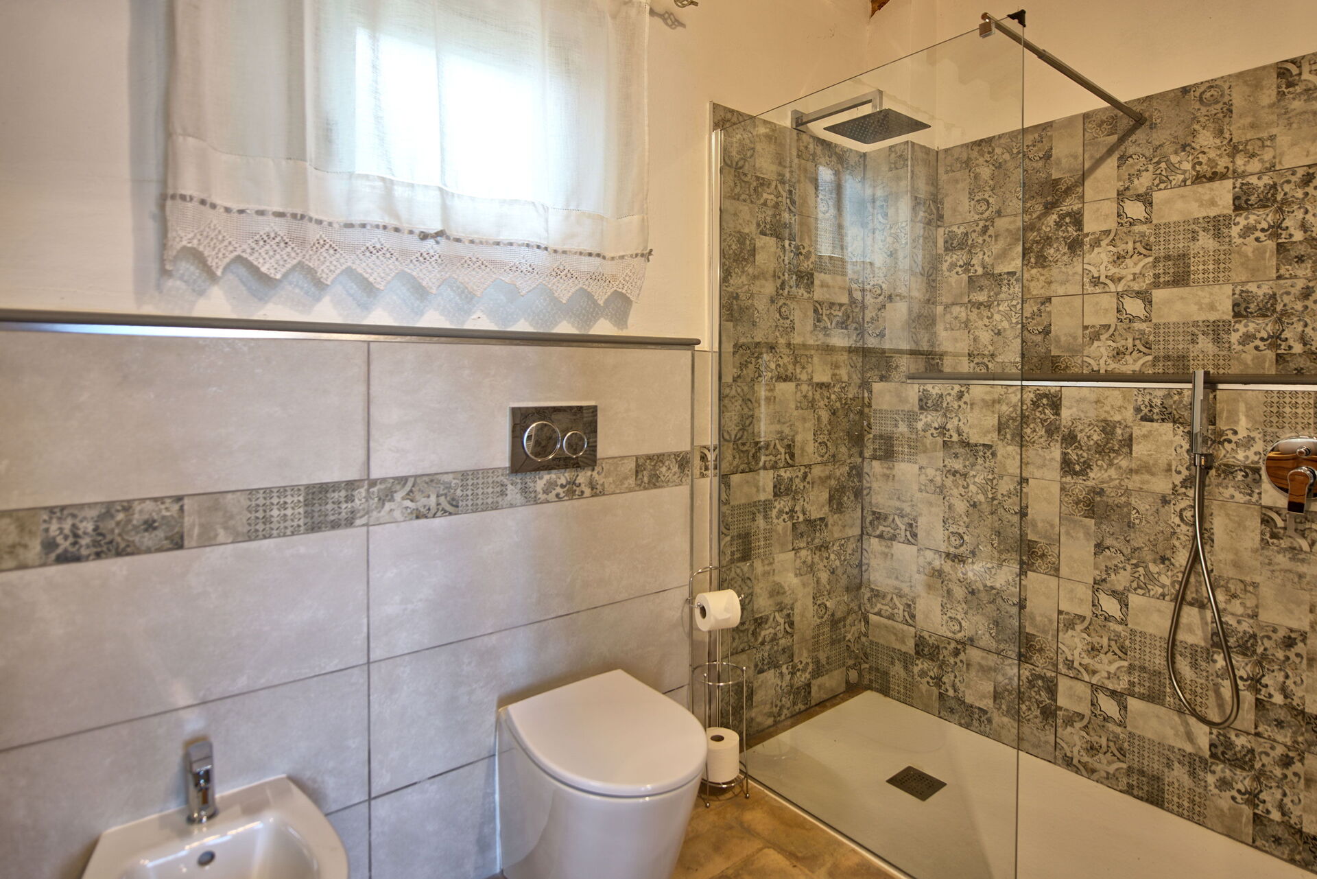 Ground floor: living room with dining area and kitchen corner (oven, freezer, dishwasher), closet with washing machine and dryer, double bedroom, bathroom with shower, double bedroom with private bathroom with shower. Covered terrace with panoramic views that is furnished for outdoor dining and relaxing outside.