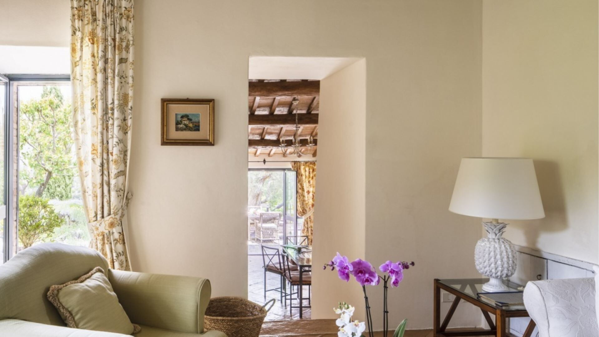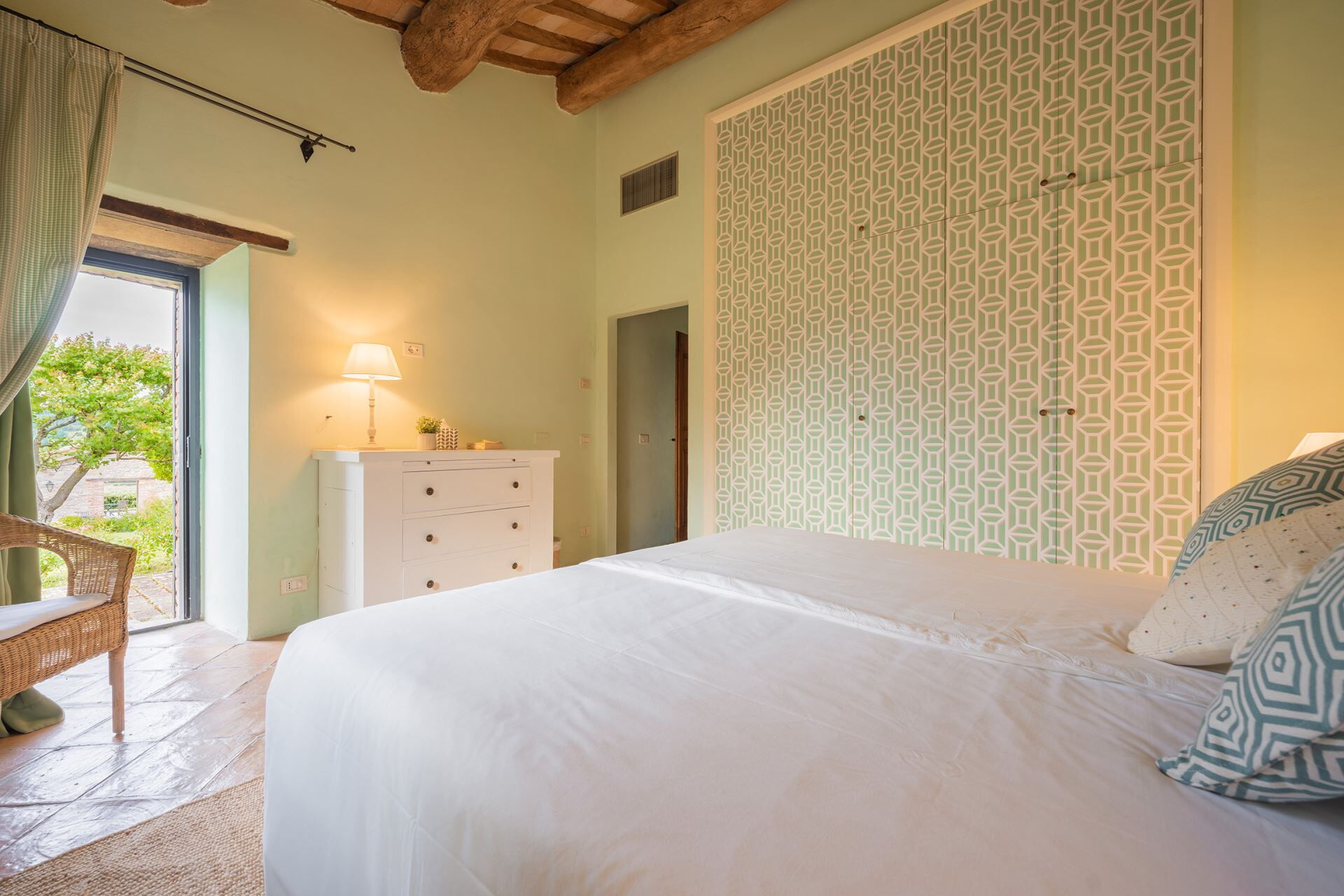 Villa Sibilla accommodates a maximum capacity of 16 guests, distributed between the main villa and the Olivo apartment, with a total of 8 bedrooms and 7 bathrooms throughout the property. The main villa spans two floors, with the ground floor featuring a welcoming living room with fireplace, an open plan living-dining room-kitchen area, a bathroom and a laundry room. The first floor is accessed via two separate staircases, creating two distinct sleeping wings. From the first staircase, you reach a king-size double bedroom measuring 2 meters by 1.90 meters with an en-suite bathroom featuring both shower and bathtub, a double room with beds measuring 0.85 meters by 1.90 meters, and another double room of the same dimensions with an en-suite bathroom with shower. The second staircase leads to a king-size double bedroom measuring 1.85 meters by 1.90 meters with an en-suite bathroom equipped with both bath and shower, a twin bedroom with beds measuring 0.85 meters by 1.90 meters, and an additional king-size double bedroom measuring 2 meters by 1.90 meters with an en-suite bathroom with shower. The independent Olivo apartment comprises a living room, a fully equipped kitchen with dining table, and two double bedrooms each measuring 2 meters by 1.90 meters, both with en-suite bathrooms featuring showers.