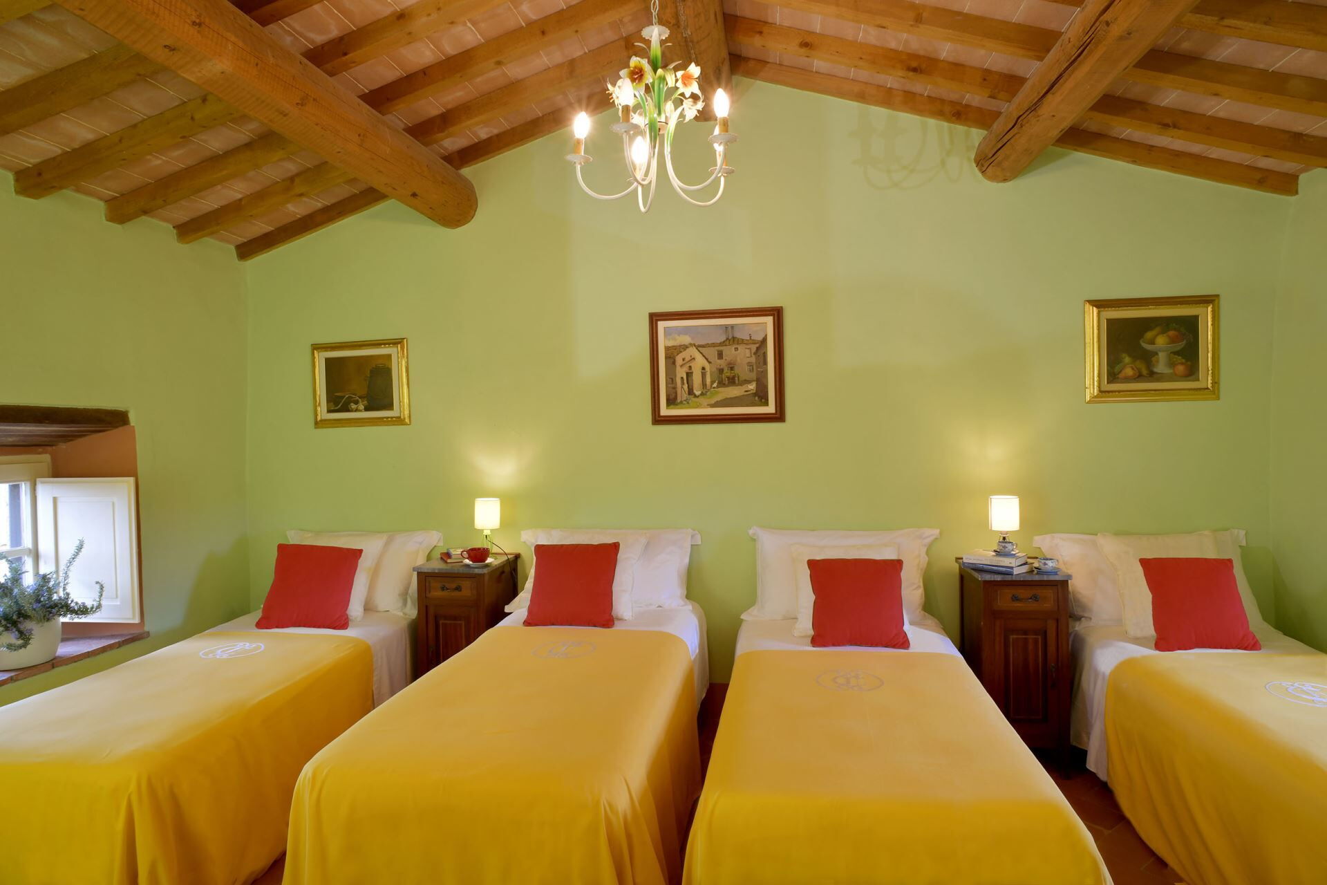 The farmhouse is arranged across a ground floor and a first floor, comfortably accommodating up to 10 guests in 4 bedrooms, each with its own en-suite bathroom. On the ground floor, you will discover a welcoming living room furnished with a fireplace, comfortable sofas, and a television, along with a raised area that houses the kitchen and dining space. This ground floor area provides direct access to the garden and porch. The ground floor also features 1 double bedroom with direct garden access and its own private bathroom. Ascending to the first floor, you will find the remaining 3 bedrooms, comprising 2 double bedrooms and 1 bedroom furnished with 4 single beds, each accompanied by its own en-suite bathroom, bringing the total to 4 bathrooms throughout the property.