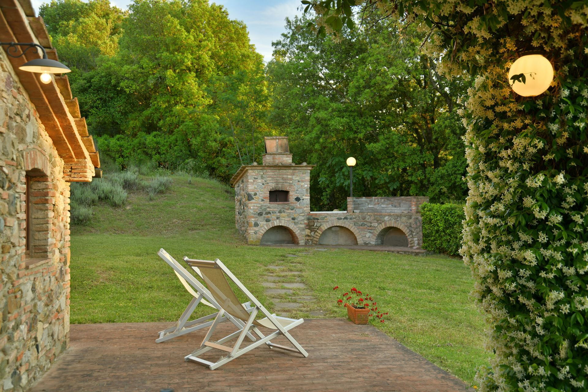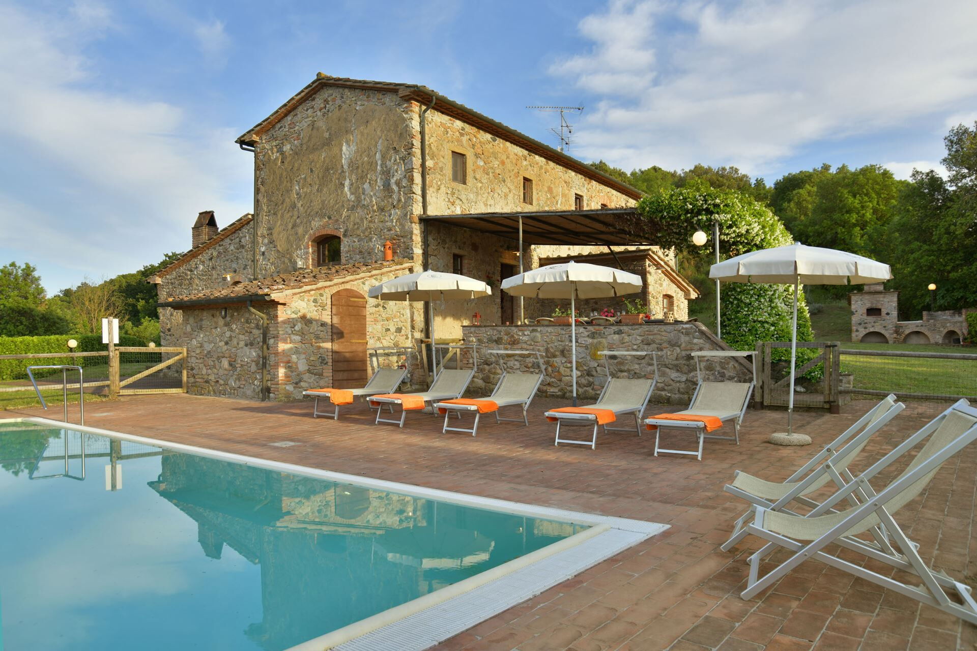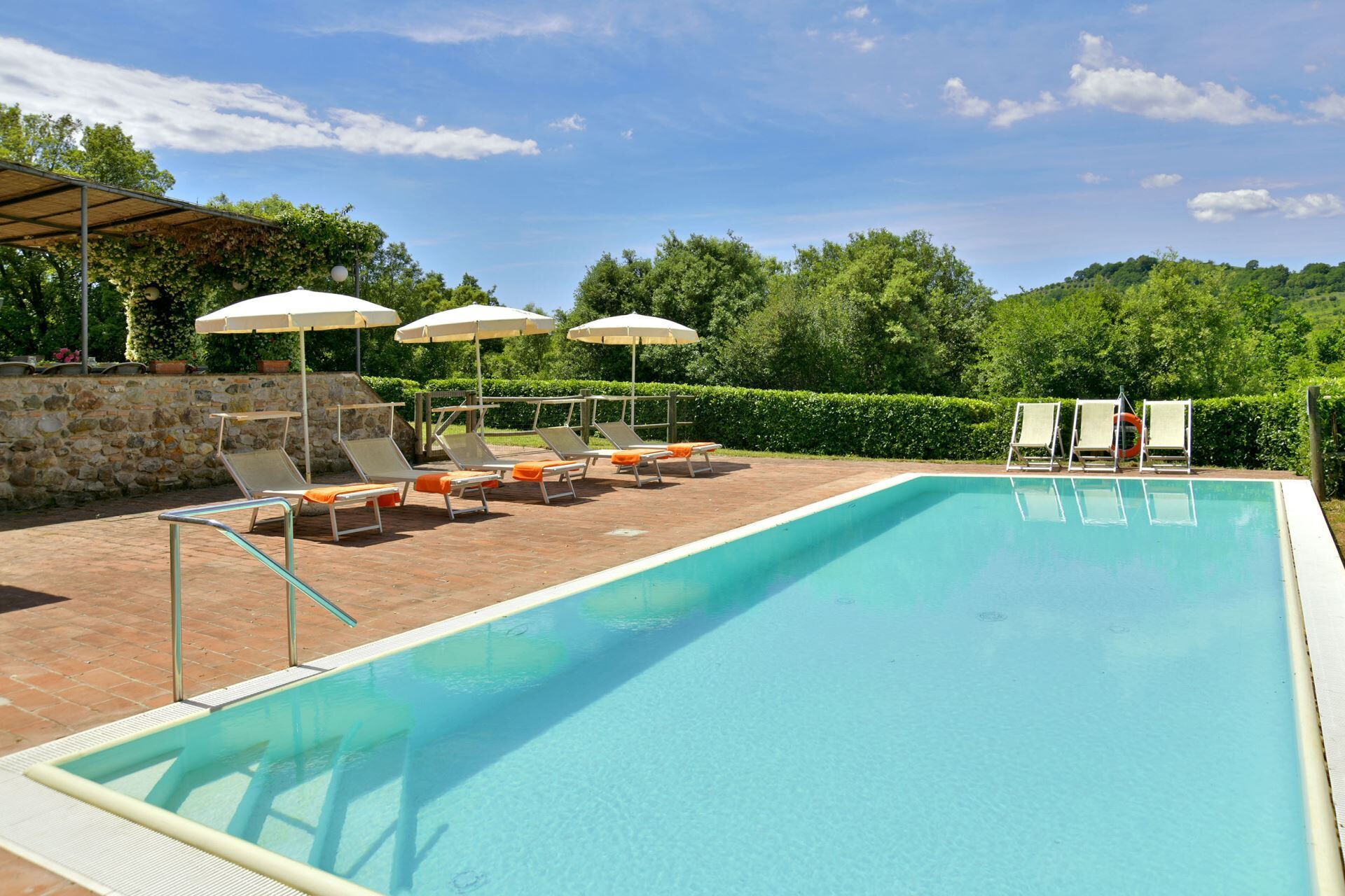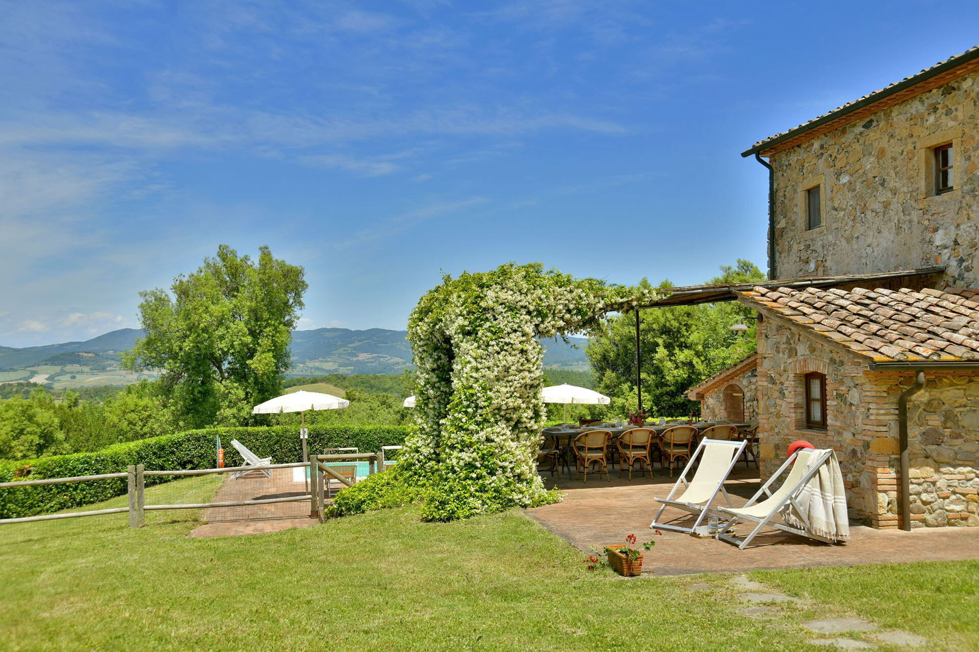 You will find a private garden surrounding the farmhouse, designed for outdoor living and entertainment. The infinity pool can be heated upon request and is surrounded by a spacious sunbathing area equipped with comfortable sun loungers, chairs, and umbrellas for your relaxation. A covered porch provides shaded outdoor dining space, featuring a large wrought iron and stone table where you can enjoy meals while taking in the beautiful Tuscan landscape. The property includes a functional barbecue area complete with a traditional pizza oven, perfect for preparing authentic Italian cuisine and entertaining guests throughout your stay.