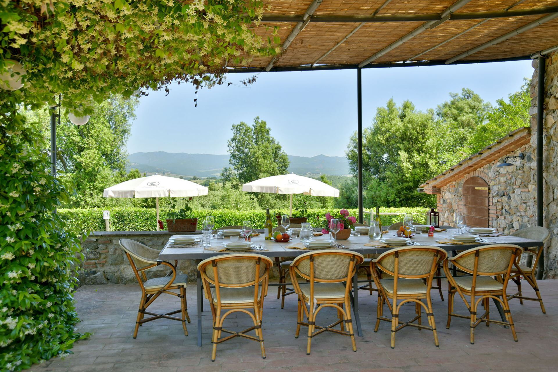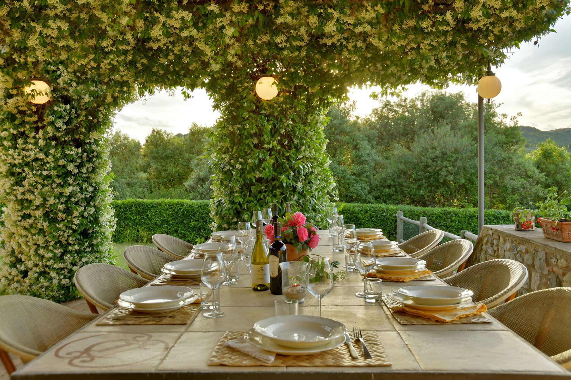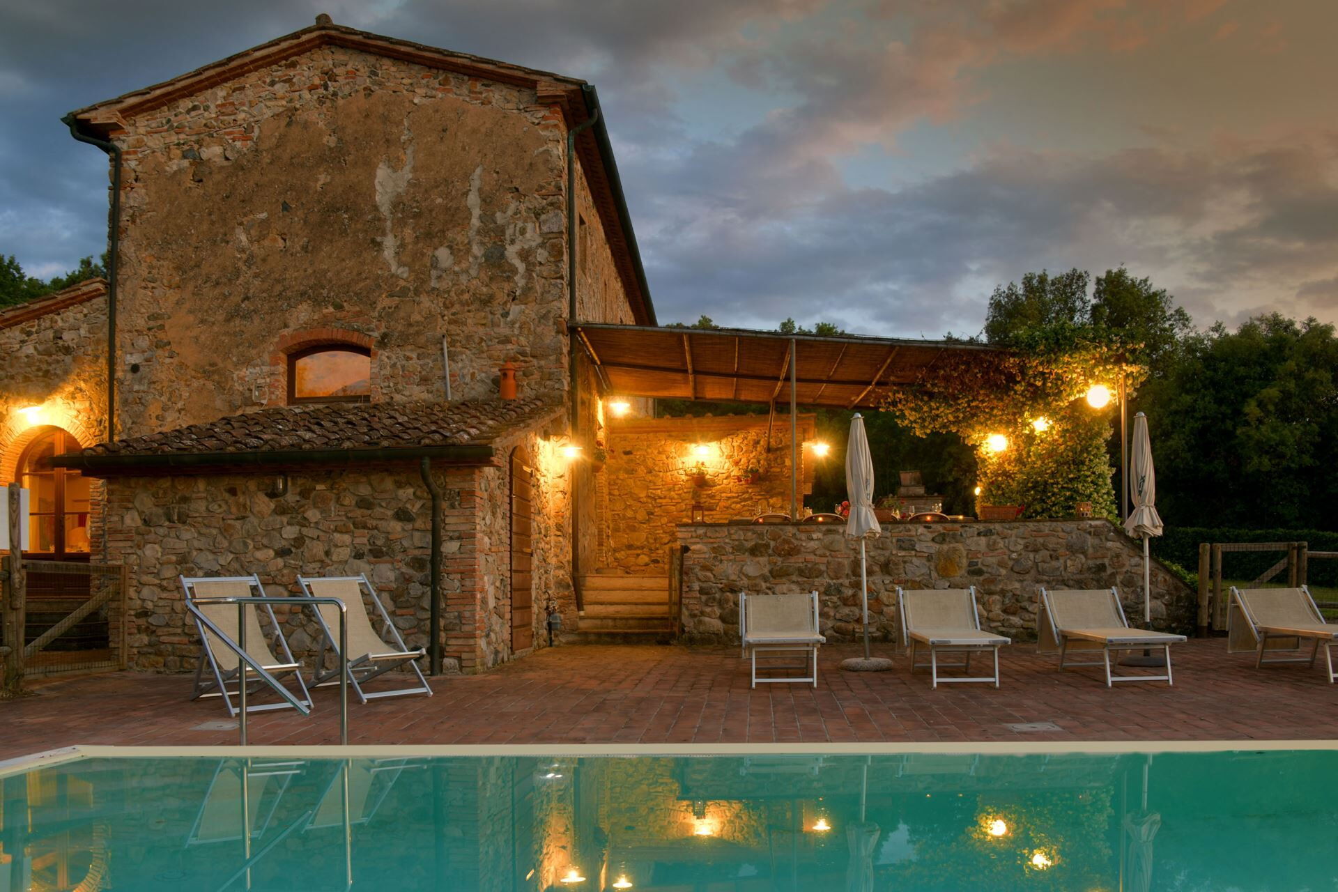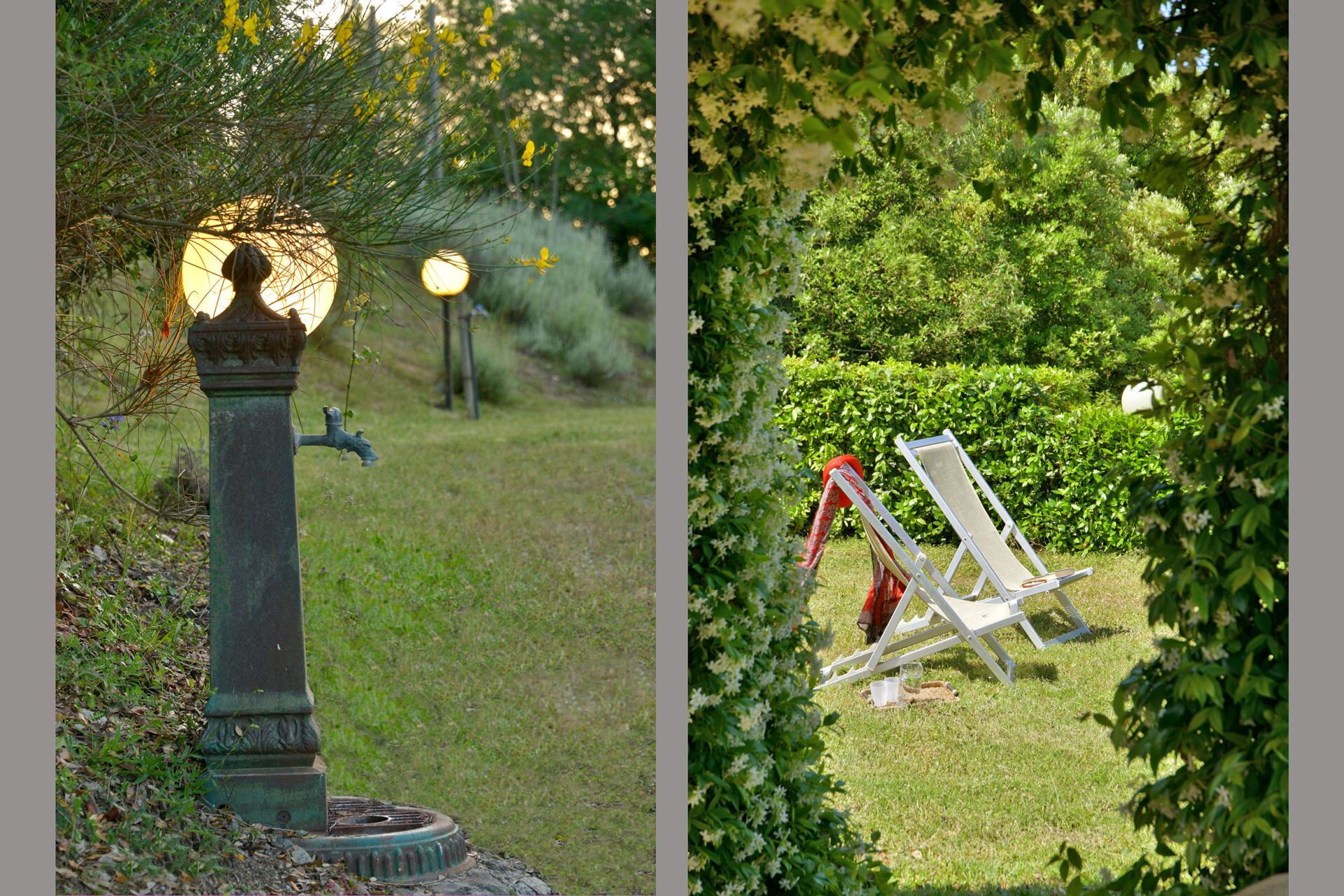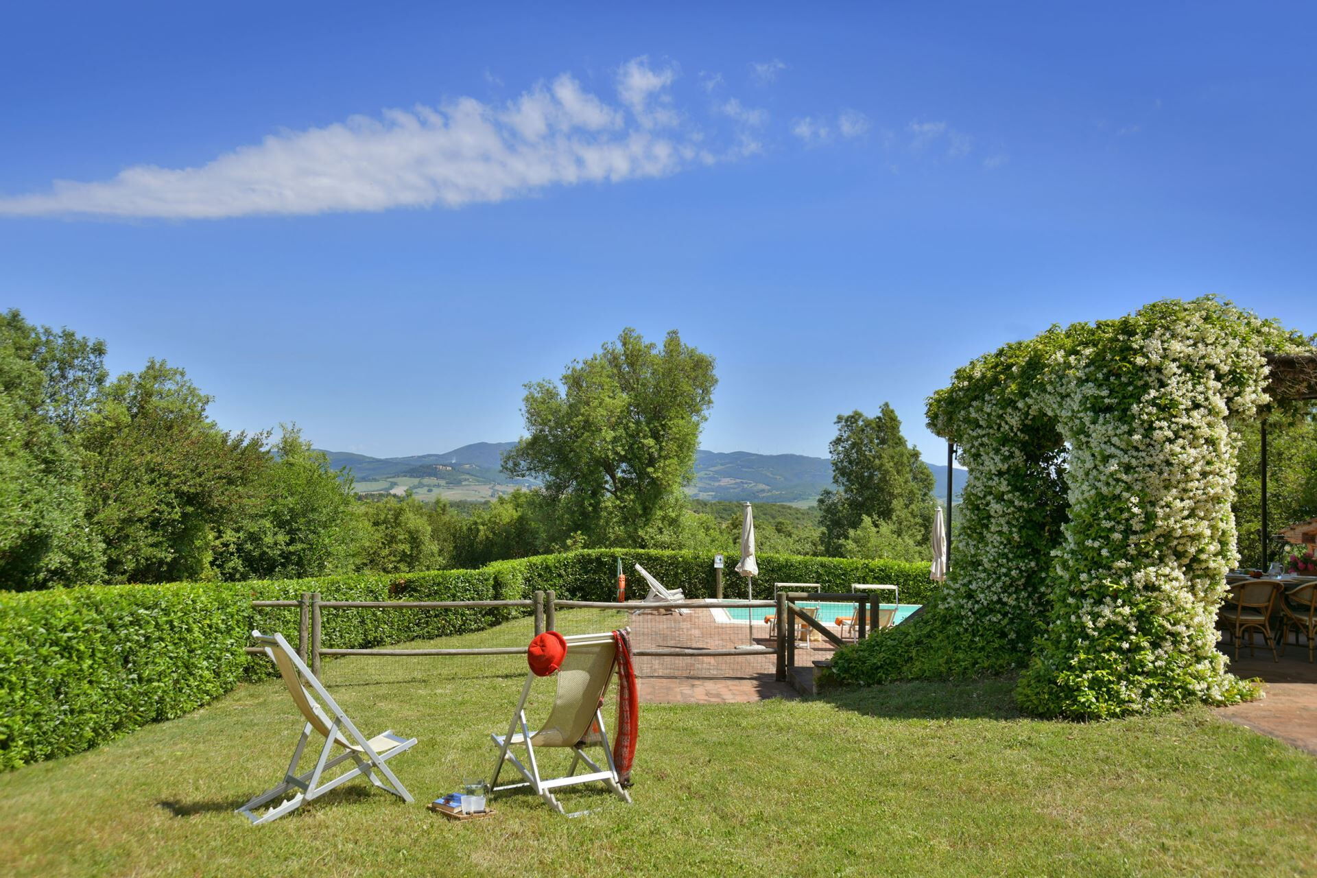 You will find a private garden surrounding the farmhouse, designed for outdoor living and entertainment. The infinity pool can be heated upon request and is surrounded by a spacious sunbathing area equipped with comfortable sun loungers, chairs, and umbrellas for your relaxation. A covered porch provides shaded outdoor dining space, featuring a large wrought iron and stone table where you can enjoy meals while taking in the beautiful Tuscan landscape. The property includes a functional barbecue area complete with a traditional pizza oven, perfect for preparing authentic Italian cuisine and entertaining guests throughout your stay.