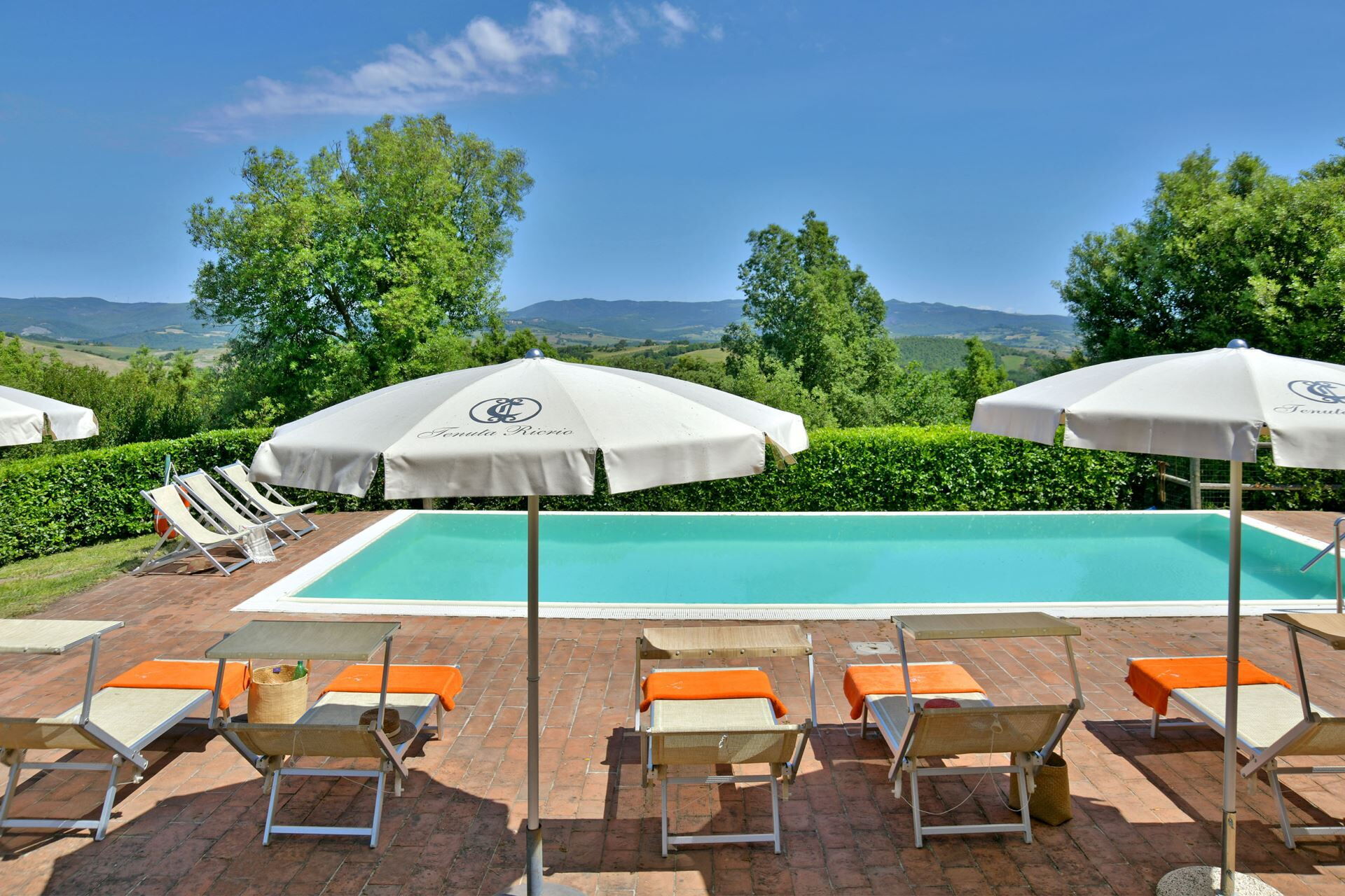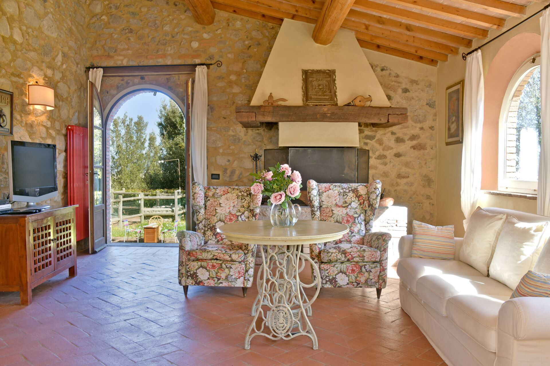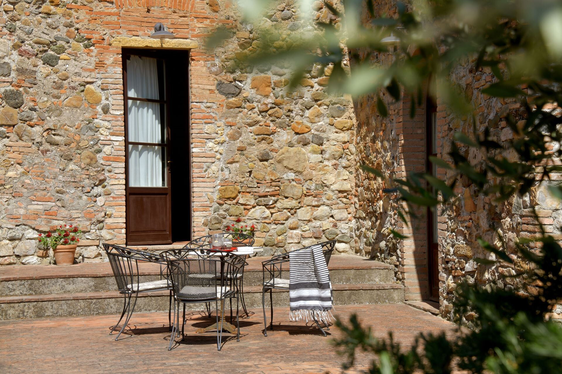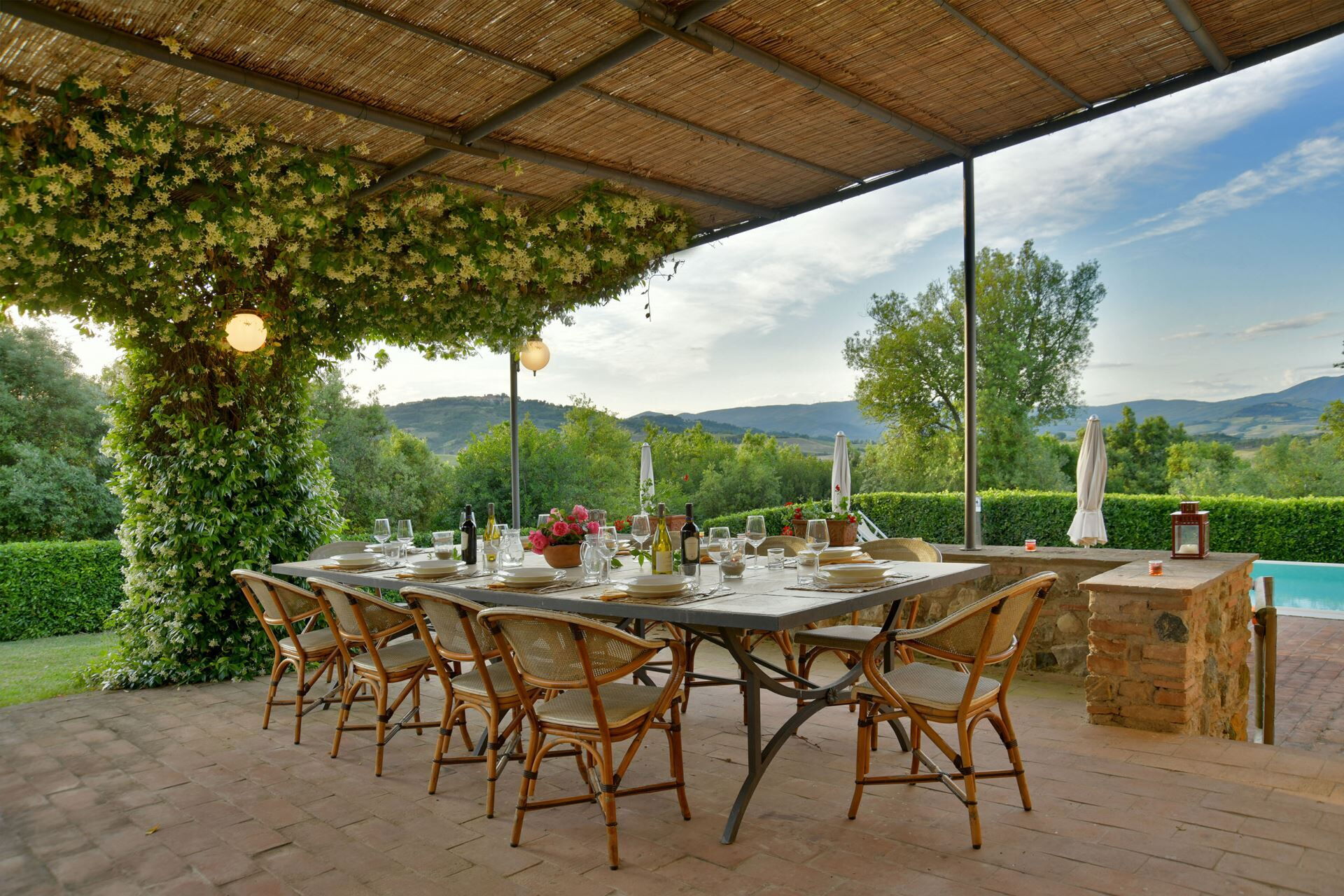 You will find a private garden surrounding the farmhouse, designed for outdoor living and entertainment. The infinity pool can be heated upon request and is surrounded by a spacious sunbathing area equipped with comfortable sun loungers, chairs, and umbrellas for your relaxation. A covered porch provides shaded outdoor dining space, featuring a large wrought iron and stone table where you can enjoy meals while taking in the beautiful Tuscan landscape. The property includes a functional barbecue area complete with a traditional pizza oven, perfect for preparing authentic Italian cuisine and entertaining guests throughout your stay.