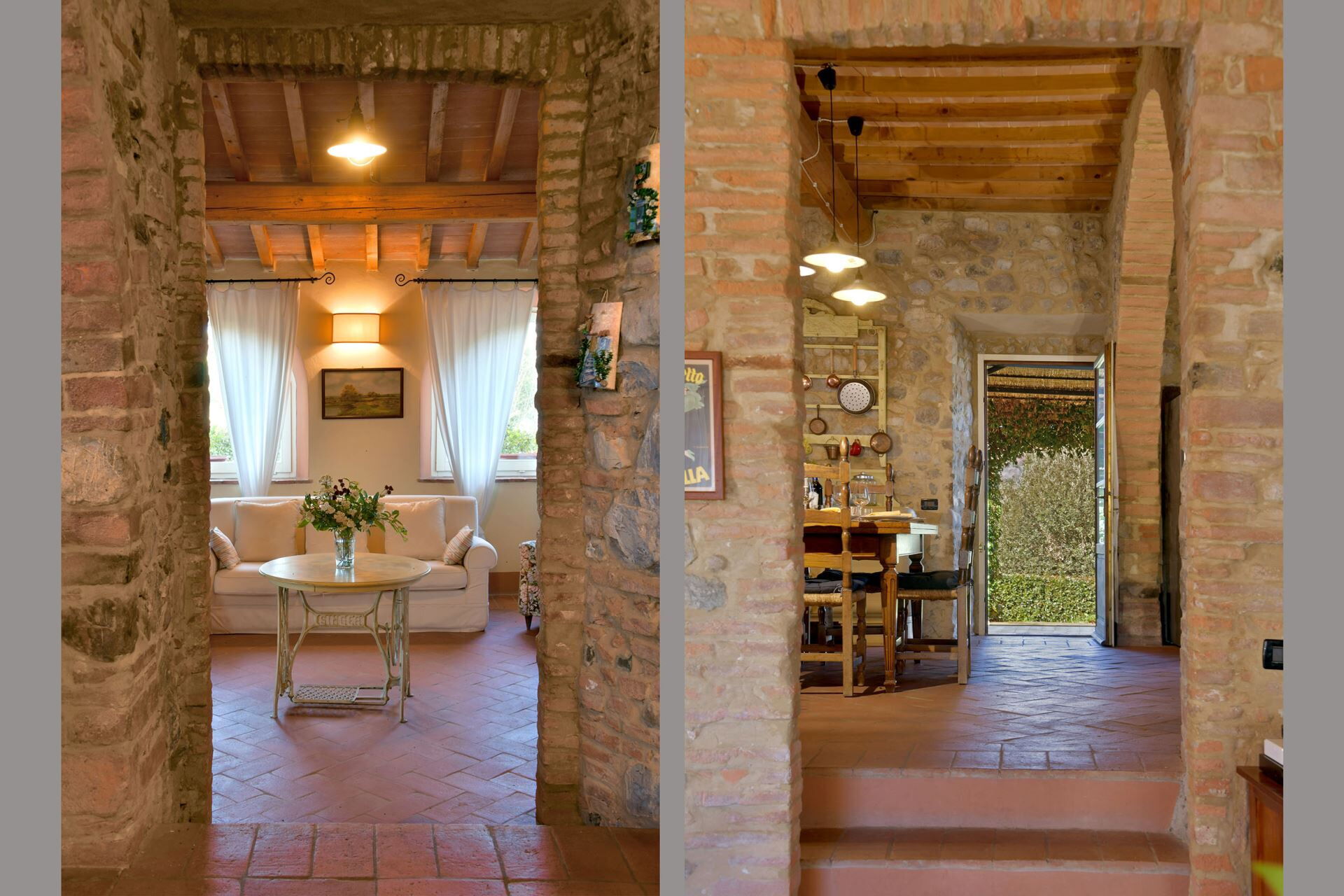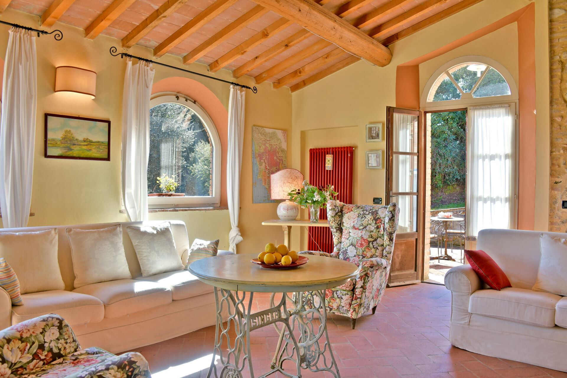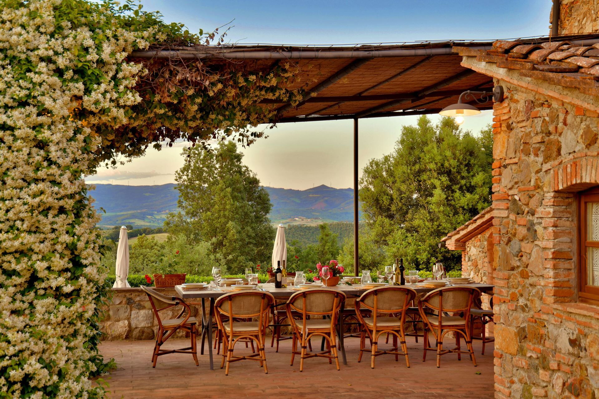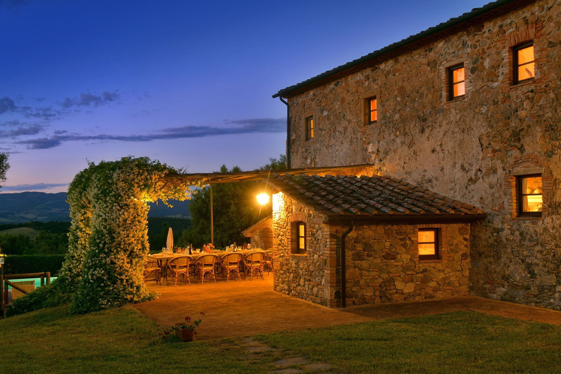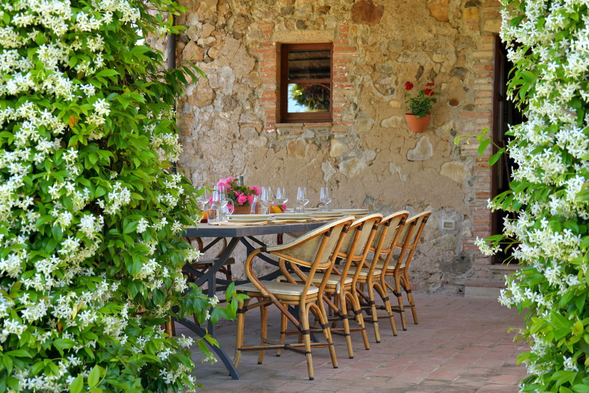 You will find a private garden surrounding the farmhouse, designed for outdoor living and entertainment. The infinity pool can be heated upon request and is surrounded by a spacious sunbathing area equipped with comfortable sun loungers, chairs, and umbrellas for your relaxation. A covered porch provides shaded outdoor dining space, featuring a large wrought iron and stone table where you can enjoy meals while taking in the beautiful Tuscan landscape. The property includes a functional barbecue area complete with a traditional pizza oven, perfect for preparing authentic Italian cuisine and entertaining guests throughout your stay.