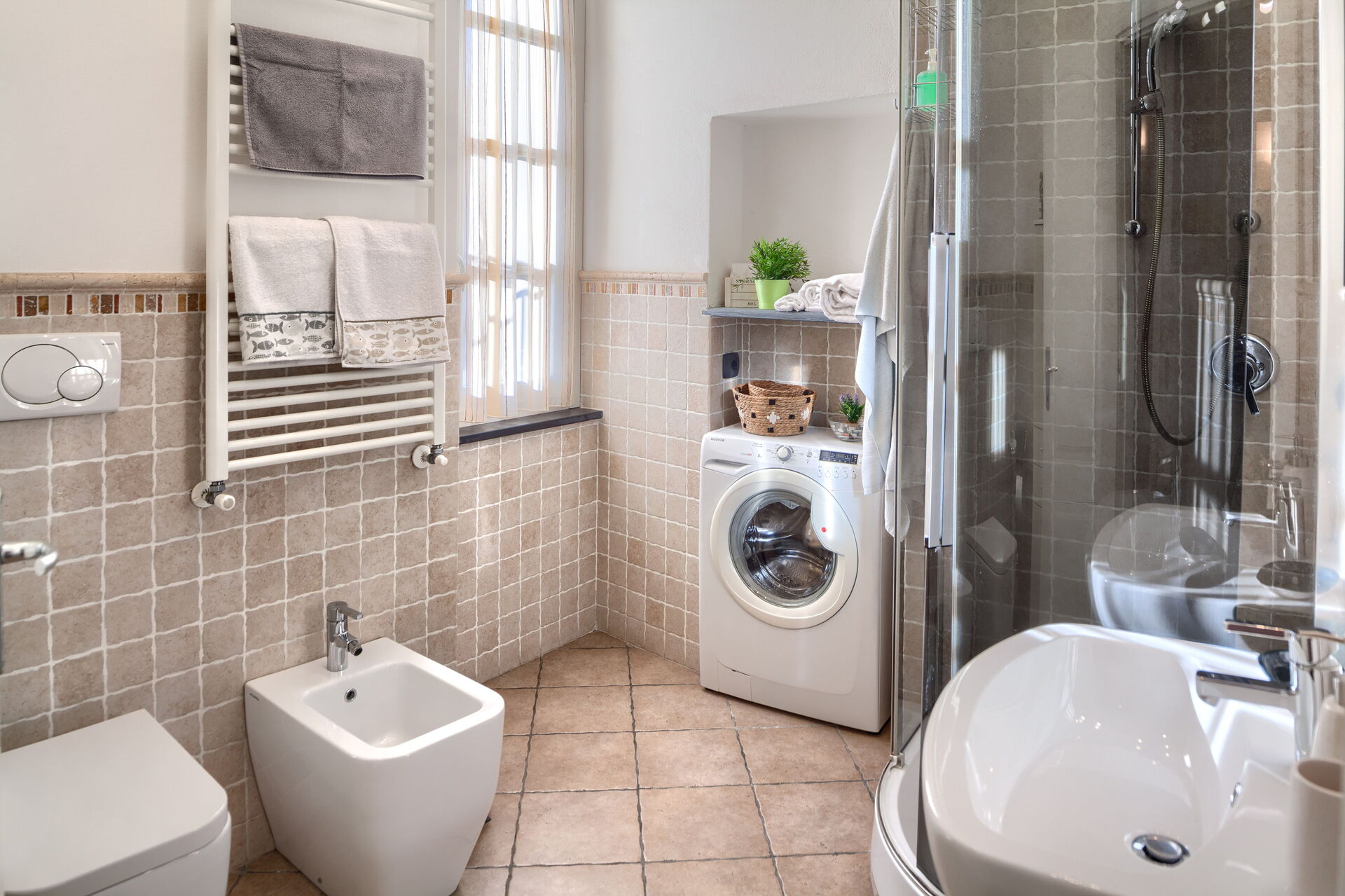 Bathroom with shower, sink, toilet and bidet. Washing machine.