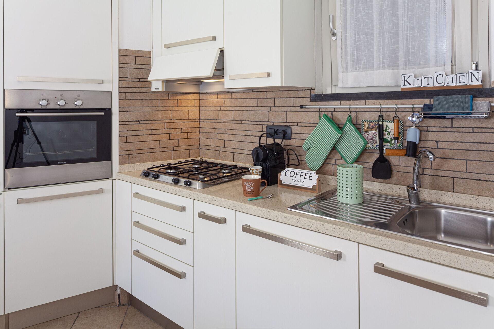 The kitchen area is excellently equipped: table with chairs, hob, fridge with freezer, oven, dishwasher, microwave oven, toaster, American coffee machine, kettle, Nespresso.