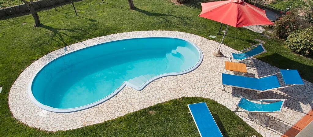 The house has a main entrance and two exits to the garden, a covered veranda with an integrated pizza oven, and a dining table with a barbecue in the garden. At the edge is the approx. 8m long oval pool (chlorine) 1.40m deep, with loungers and chairs. Some fruit trees in the garden.