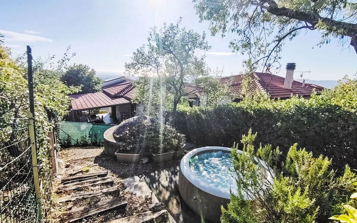The terraced garden is fenced, ensuring privacy and seclusion. A hot tub and a pool, both maintained by the owner/gardener, offer ample opportunities for relaxation and recreation. The property's location is truly remarkable, situated just 50 meters from the edge of the forest, allowing you to bask in the tranquility of nature.