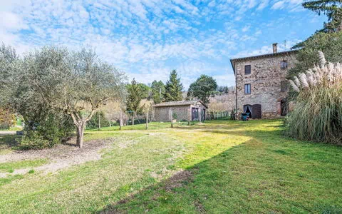 Situated 5 km from the picturesque town of Todi, Italy, the Country house "San Damiano" offers a secluded and peaceful holiday rental. This semi-detached property boasts a spacious private garden spanning 1,000 square meters, complete with a fenced enclosure. Enjoy the luxury of your own swimming pool, measuring 10 x 5 meters with a depth of 150 cm, available for use from May 15th to September 30th. The pool area features a convenient shower/WC and a pool house. Additionally, the house is equipped with a washing machine for your convenience.