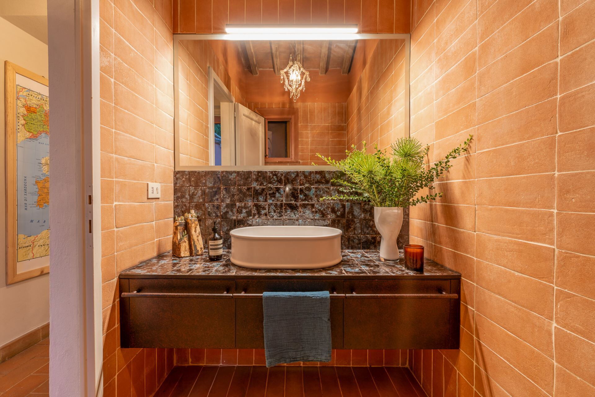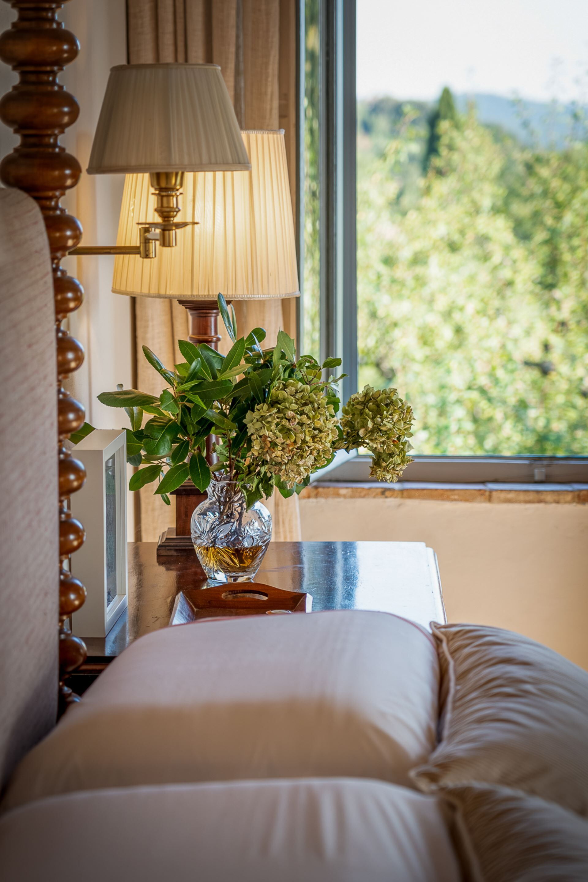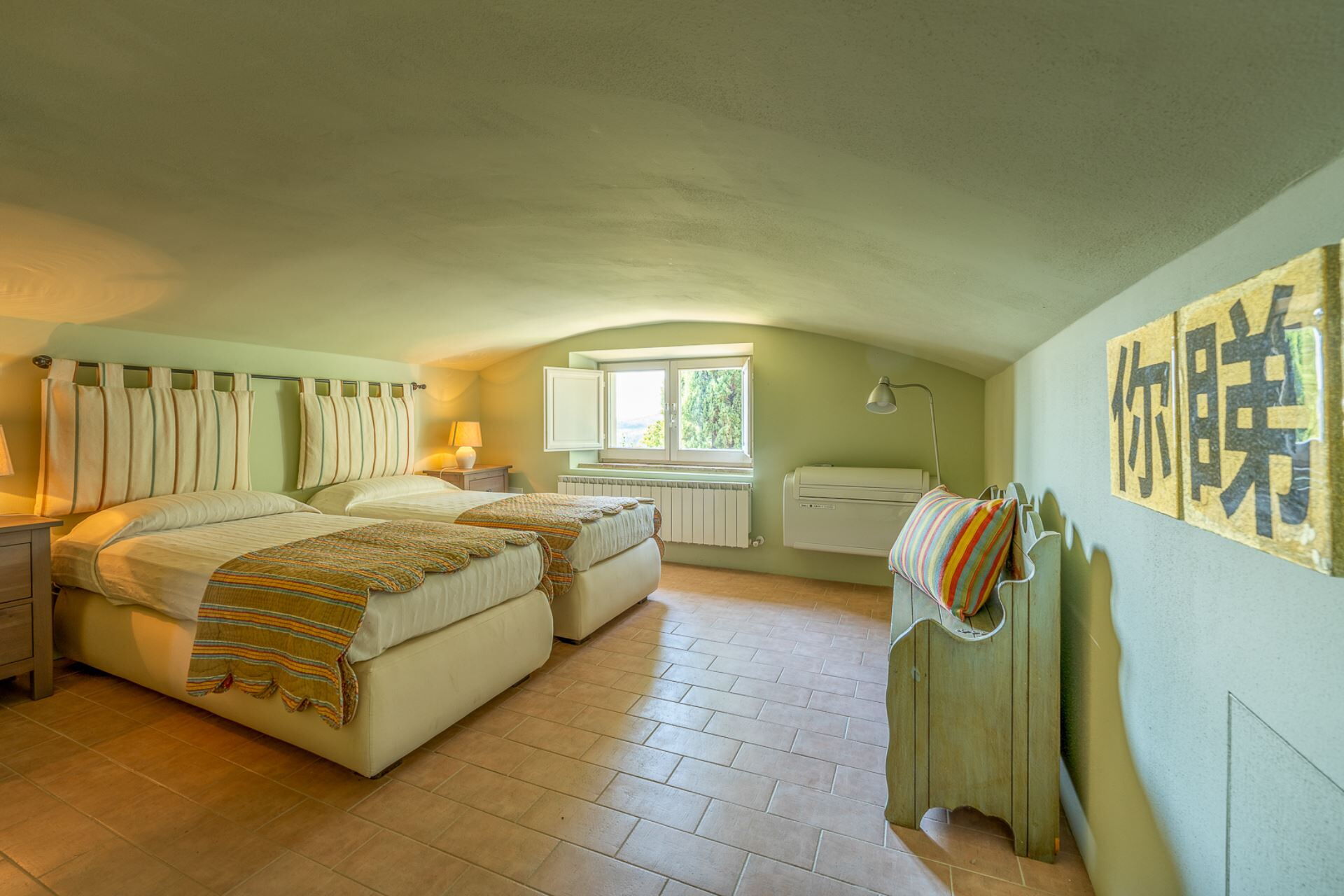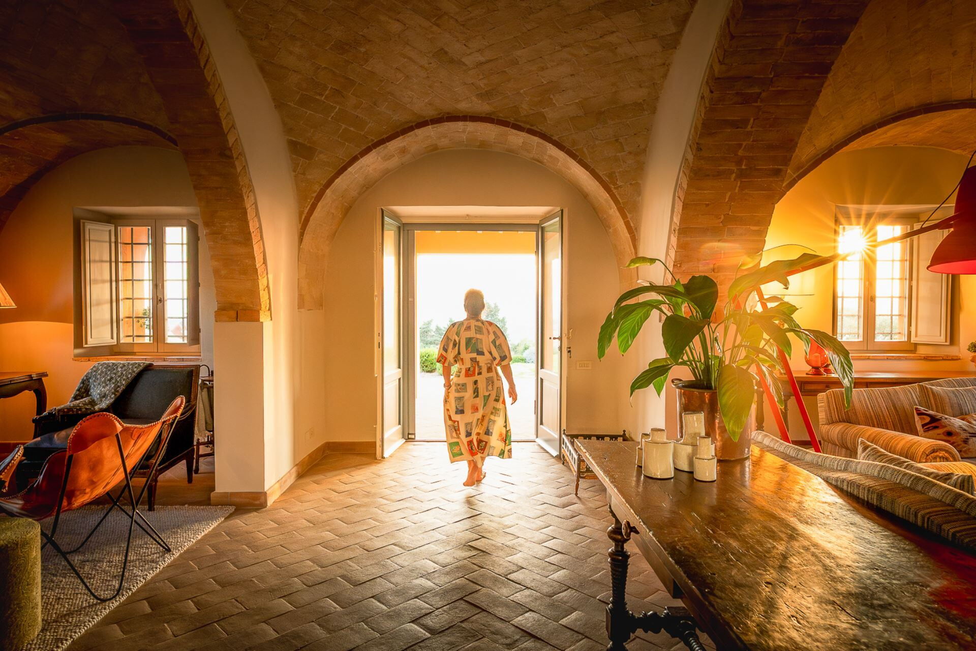 The ground floor rooms with standout vaulted brick ceilings were once where animals lived while the farmers lived upstairs. Today, these rooms are spacious living areas furnished with comfortable lounges for relaxing, reading and entertaining. Additional furniture pieces and artworks collected over 30 years together have also made their way to their new Italian base. These open plan rooms look out on to vast views of the rolling Tuscan hills, pool and garden.