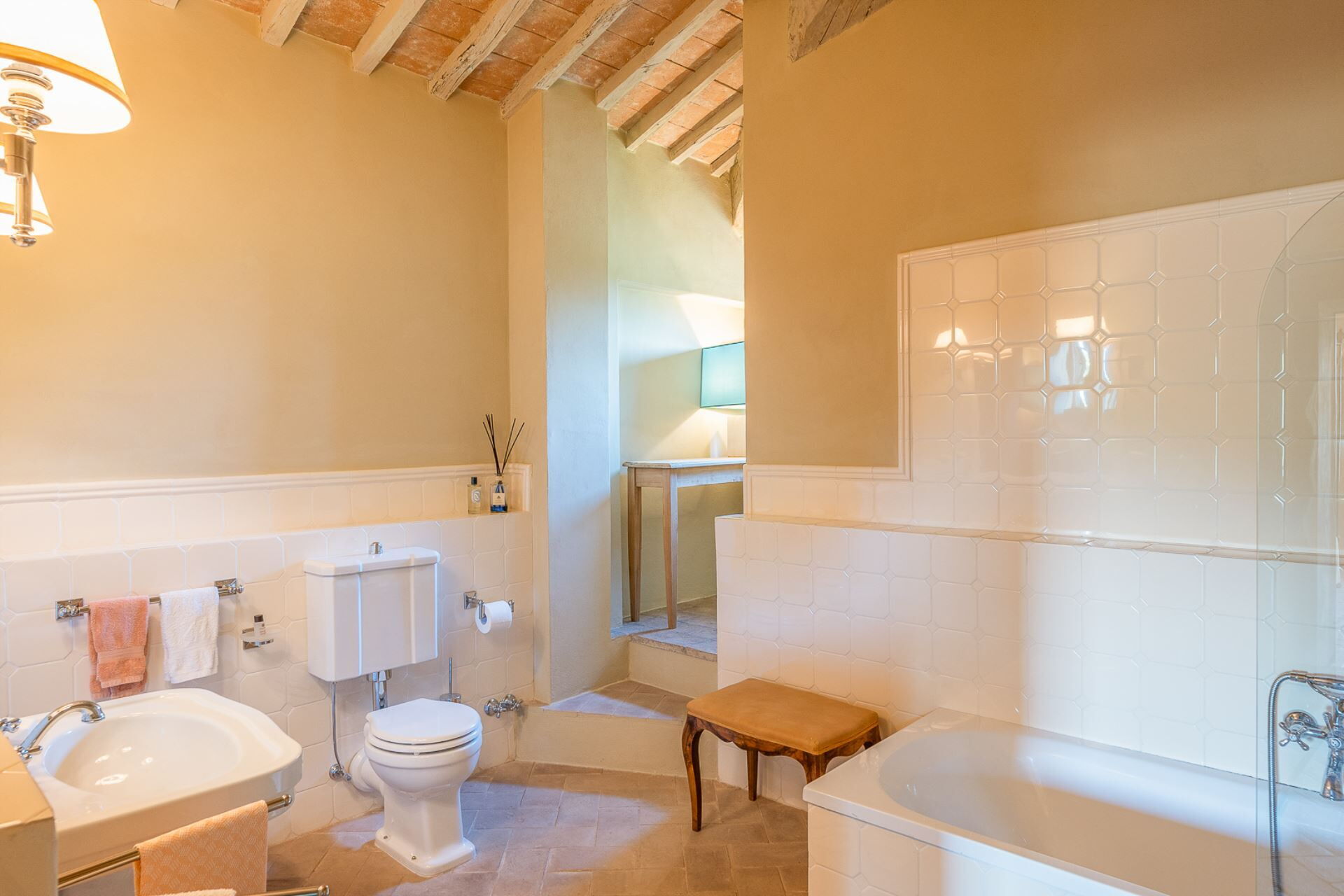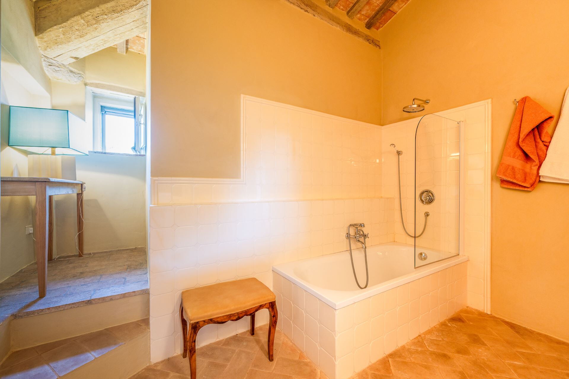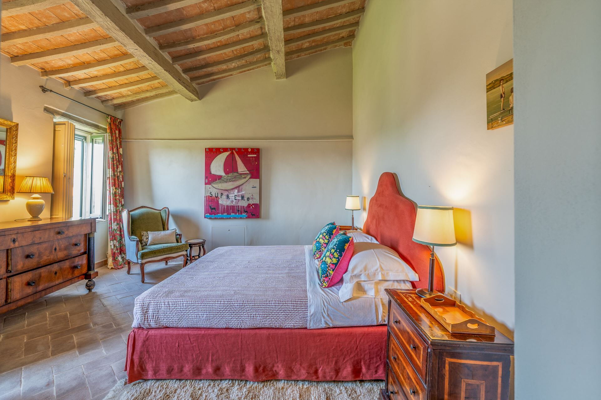 A beautiful staircase leads to the upper floor where the sleeping area of the property is located. Four majestic bedrooms with exposed wooden structural beams and elegantly styled bathrooms, offer complete comfort to every guest. High quality linen and refined fabrics characterize each room with coordinated colors and details.