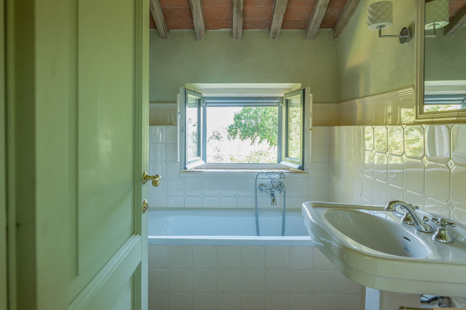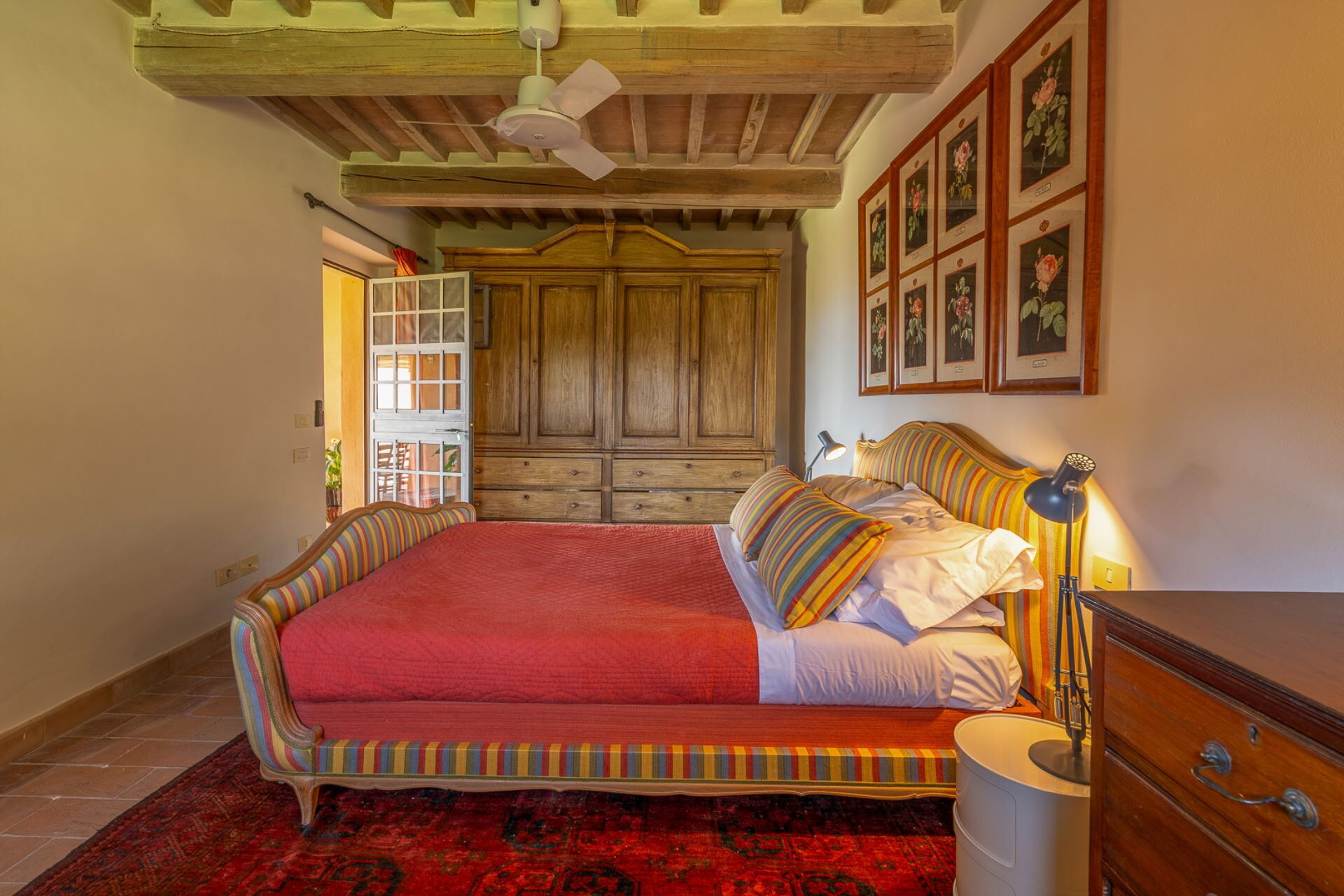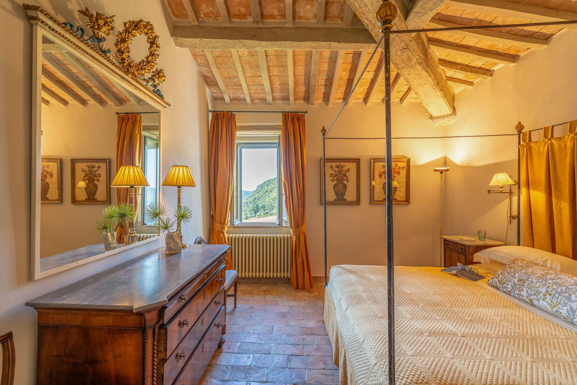 A beautiful staircase leads to the upper floor where the sleeping area of the property is located. Four majestic bedrooms with exposed wooden structural beams and elegantly styled bathrooms, offer complete comfort to every guest. High quality linen and refined fabrics characterize each room with coordinated colors and details.