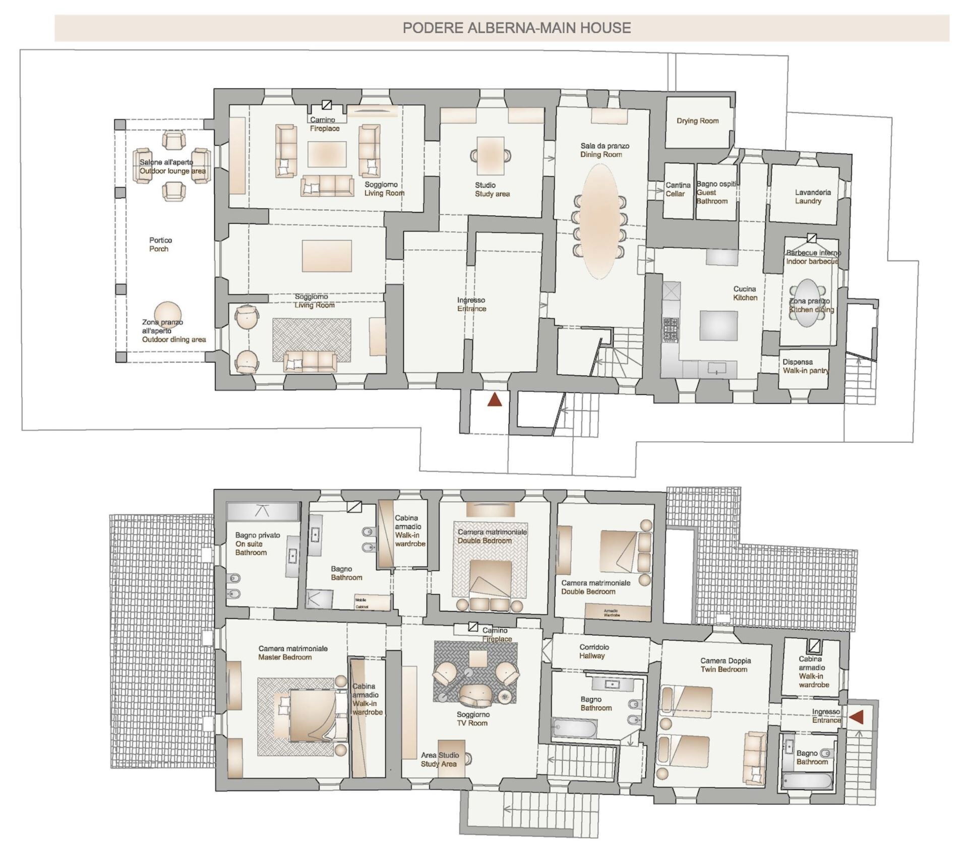 The beautiful spacious kitchen with a 900mm wide Ilve, large fridge, travertine double sink, walk-in pantry and island bench positioned in the center lends itself to preparing delicious meals with local Tuscan ingredients including the vegetable and fruit produce from the kitchen garden. An indoor traditional Tuscan BBQ is perfect for cooking on winter evenings.