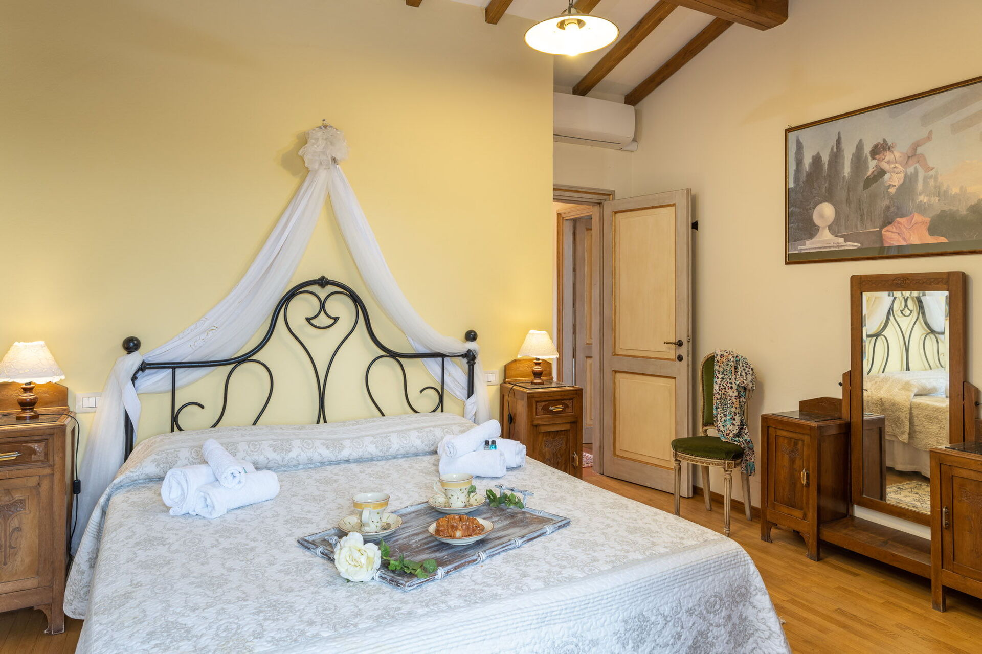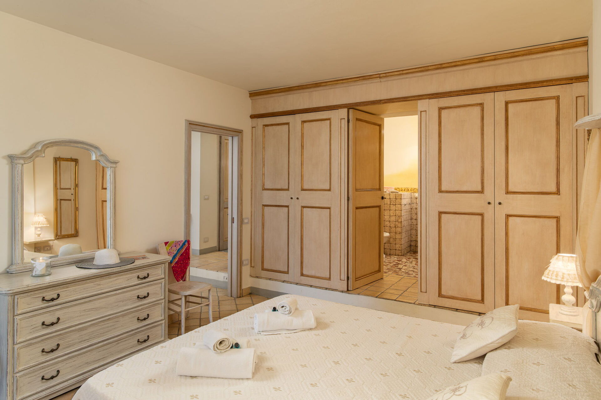 Bedroom + Ensuite Bathroom: double bed (length: 200m, width: 160m), baby bed, WIFI internet, WIFI internet, air conditioning, armchair, working desk, basin, bidet, shower, hairdryer, exit to the garden.