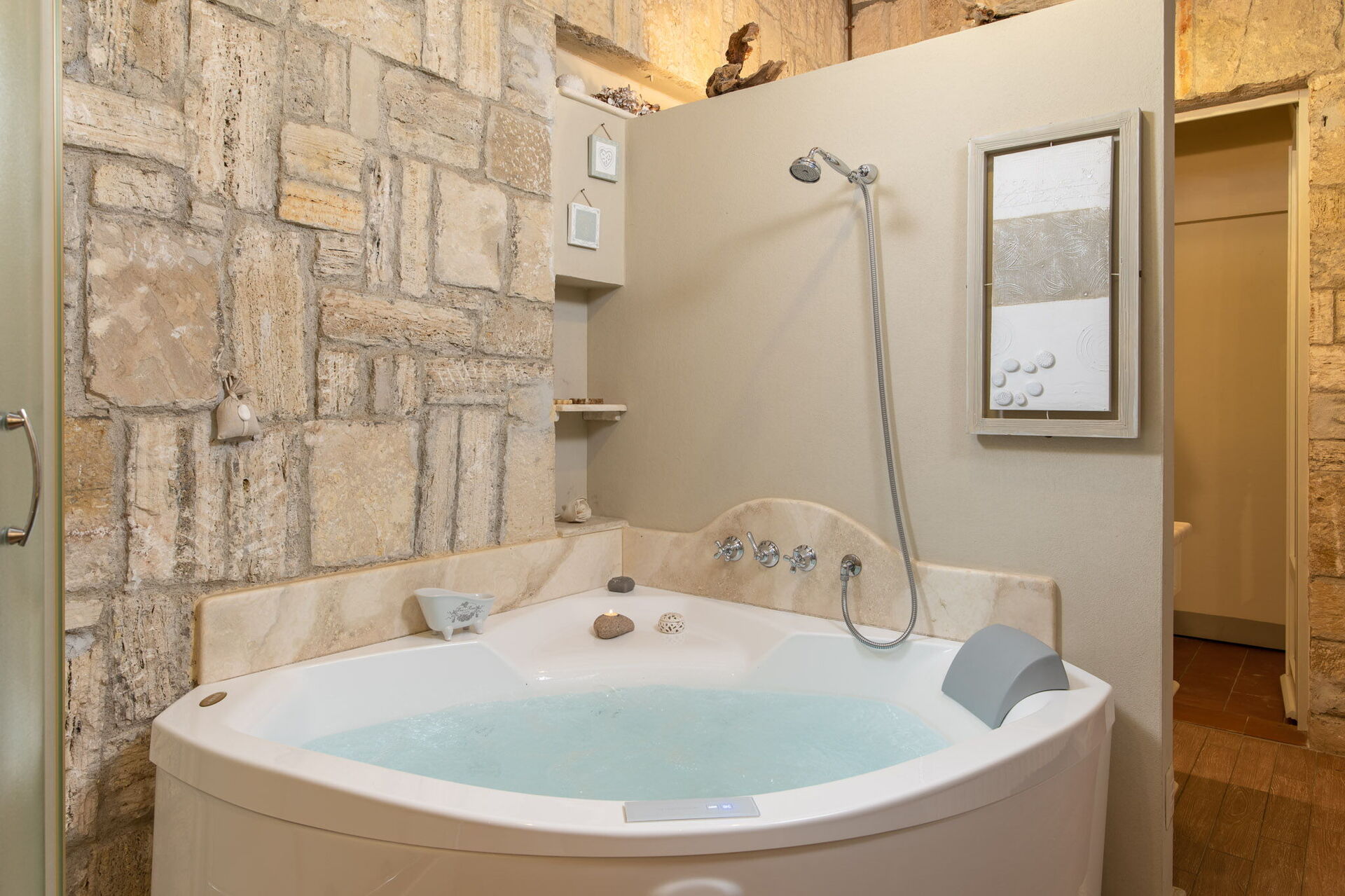 Bedroom + Ensuite Bathroom: double bed (length: 200m, width: 160m), WIFI internet, air conditioning, armchair, fireplace, whirlpool bathtub, double basin, bidet, shower, hairdryer.