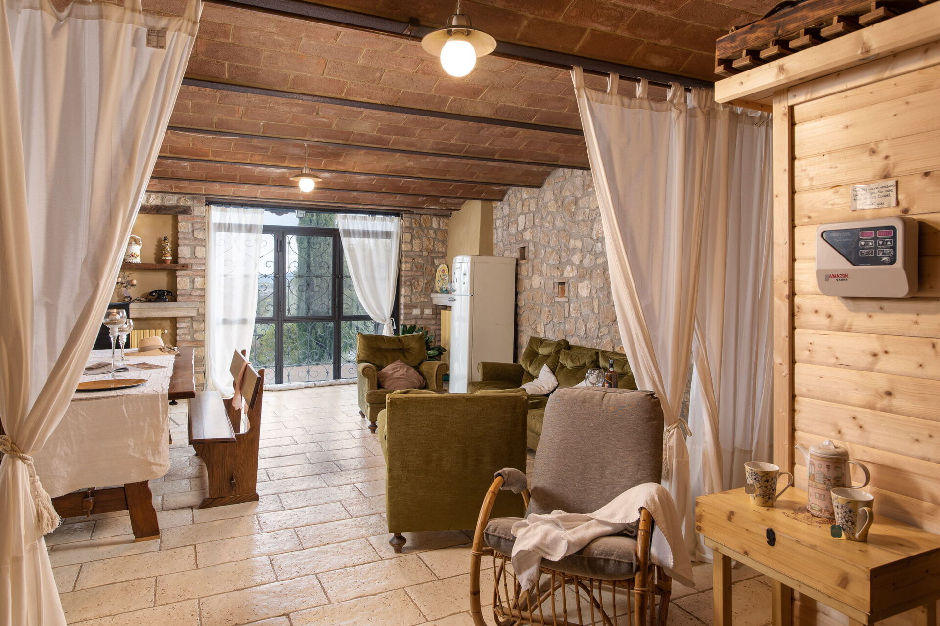 Dining room: dining table (people: 14), WIFI internet, co2 detector, exit to the garden, exit to the terrace.