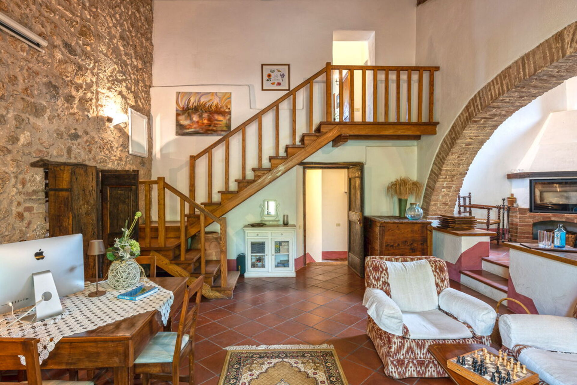 Living room: sofa (people: 3), two armchairs, working desk, exit to the garden.