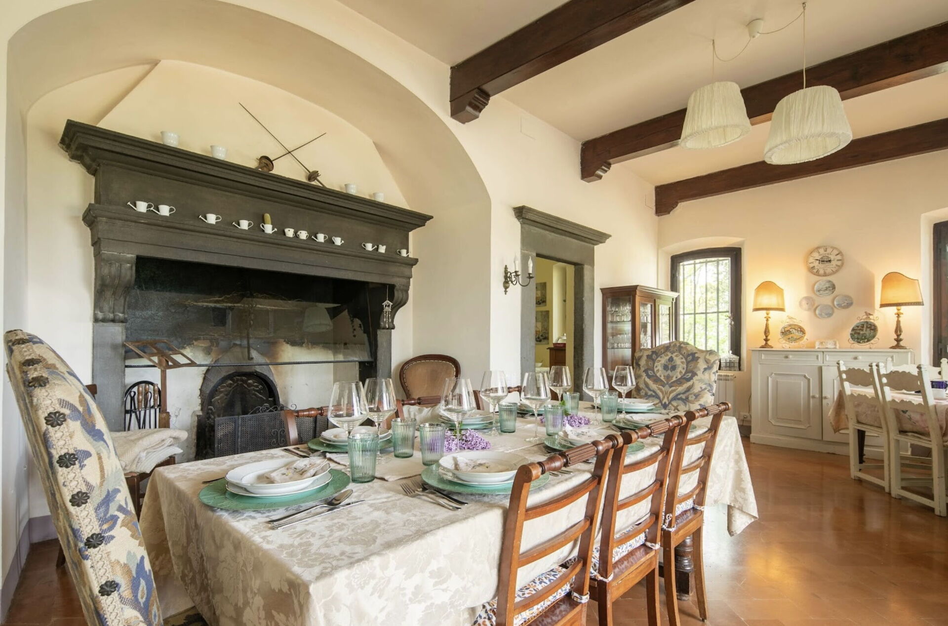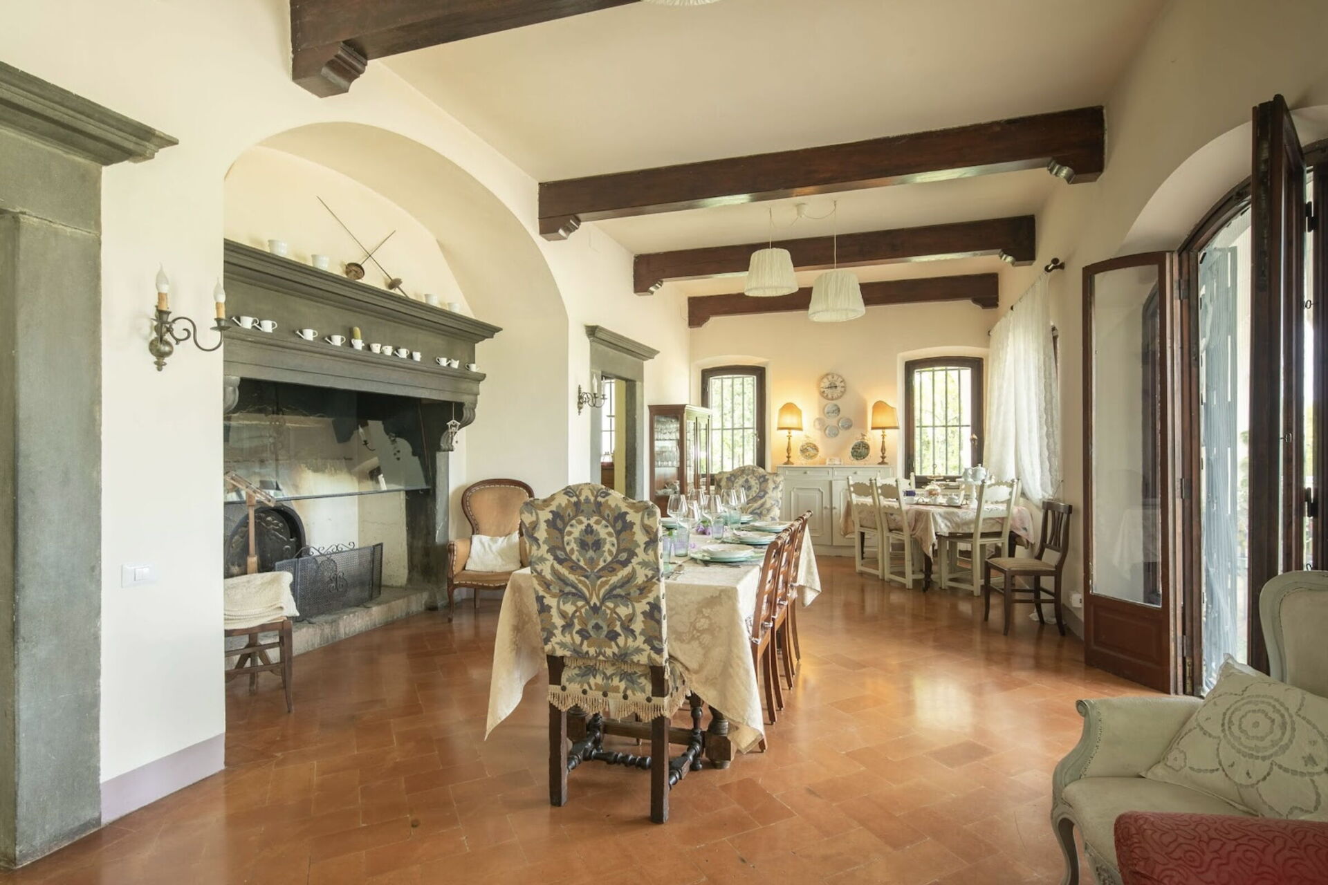 Dining room: dining table, WIFI internet, television, fireplace, exit to the garden.