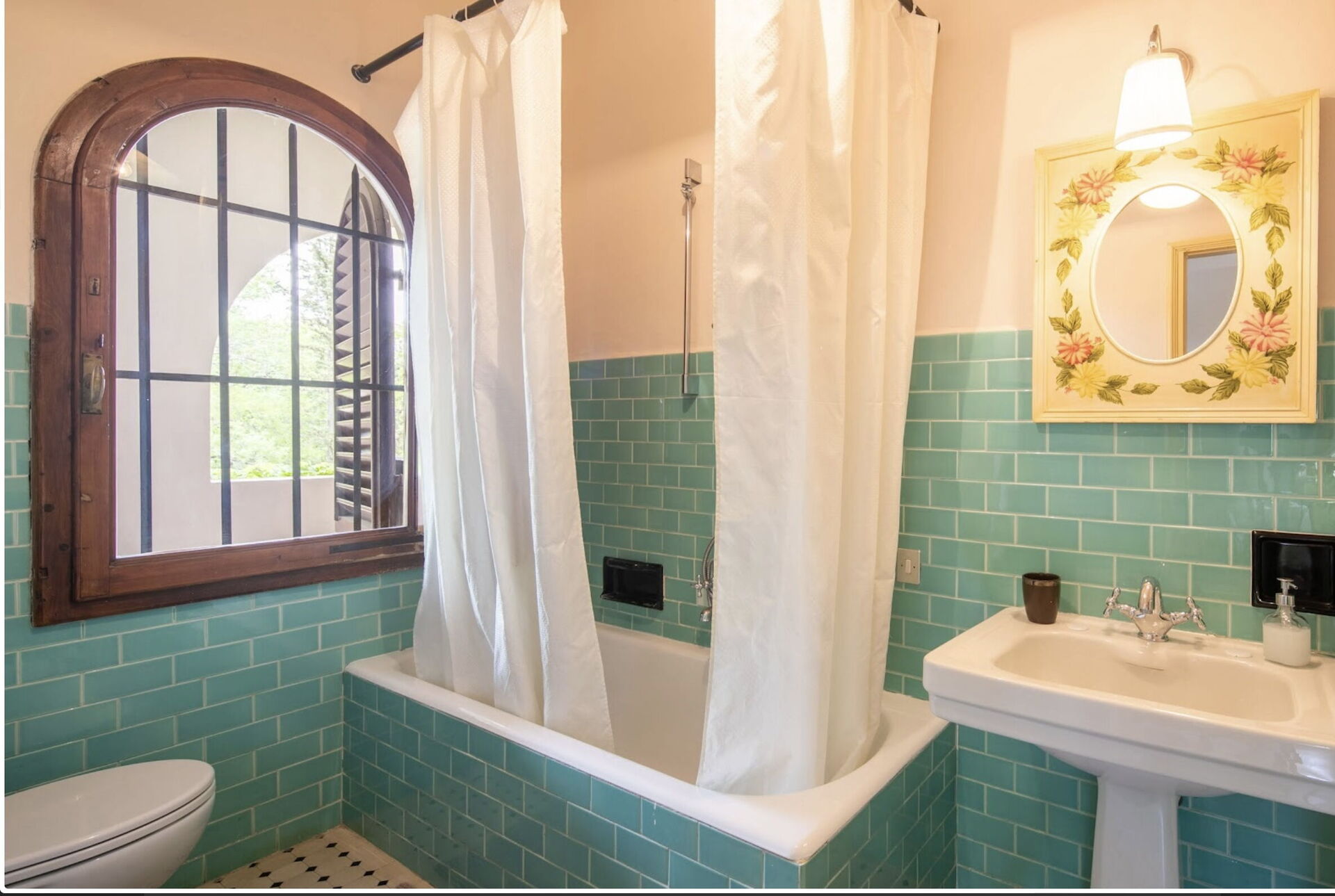 Bathroom: basin, toilet, shower.