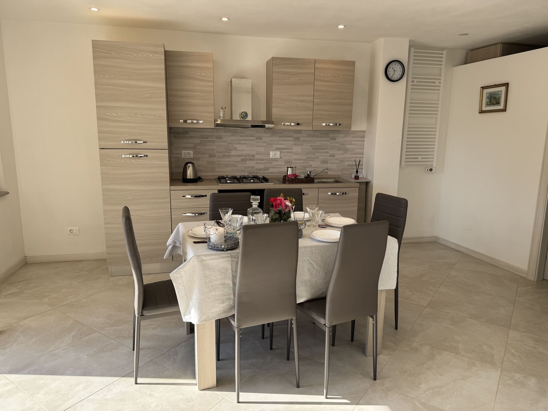 Kitchen: well equipped kitchen, dining table, fridge, freezer, stove top, oven, toaster, italian coffee machine, american coffee machine, WIFI internet, television, exit to the terrace.