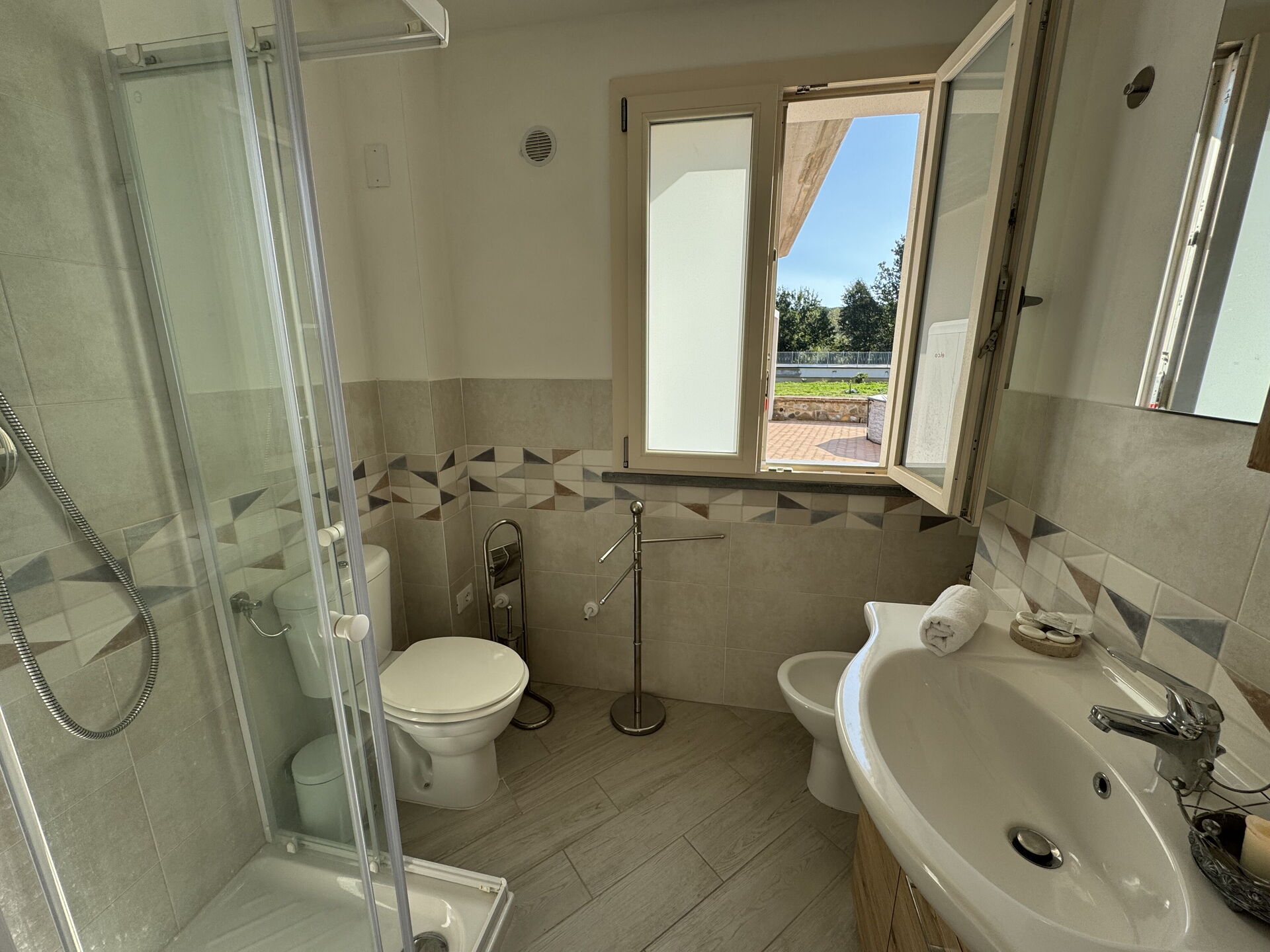Bathroom: basin, toilet, bidet, shower.