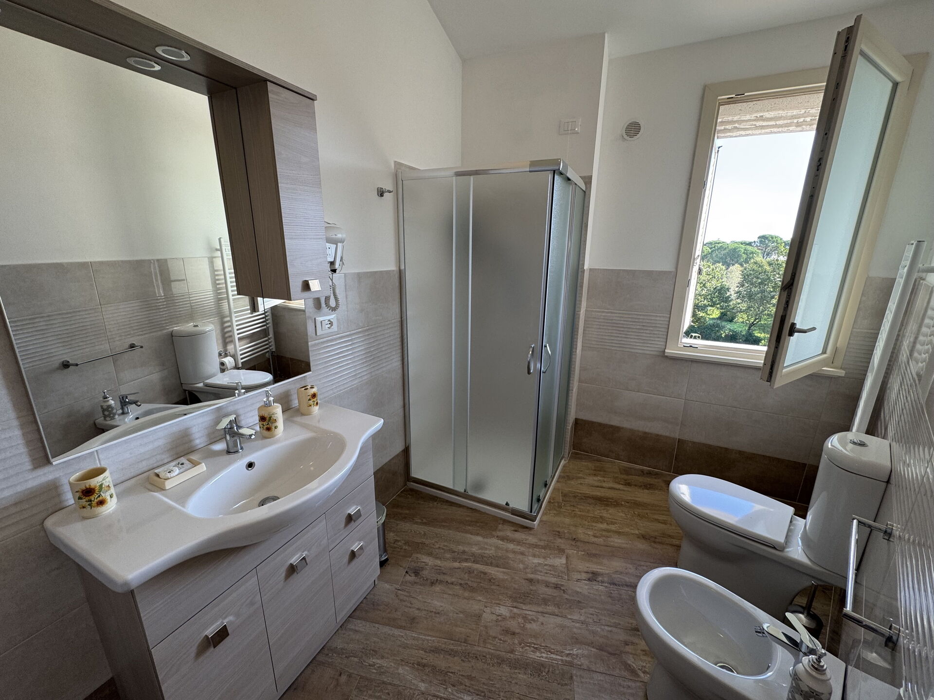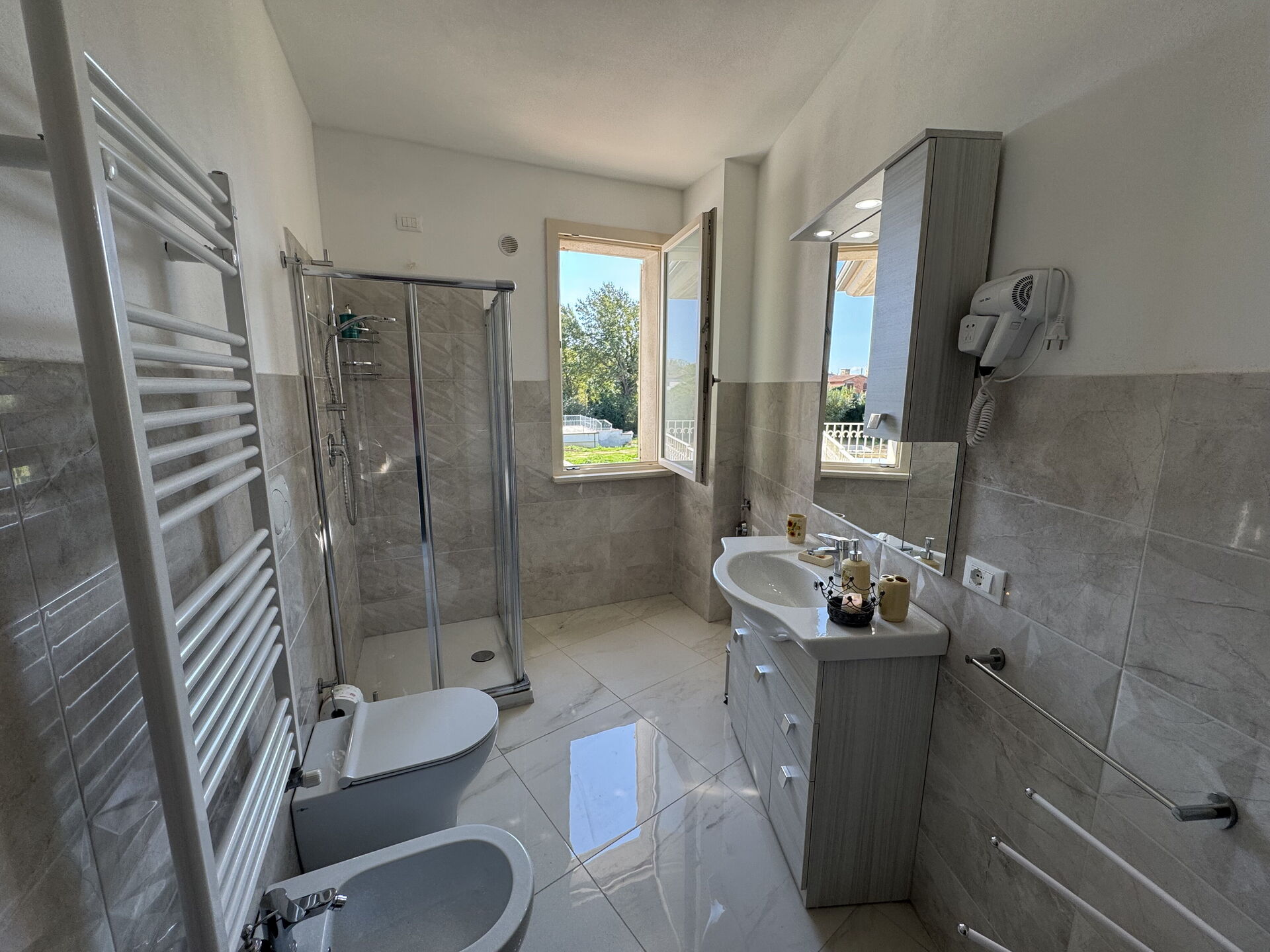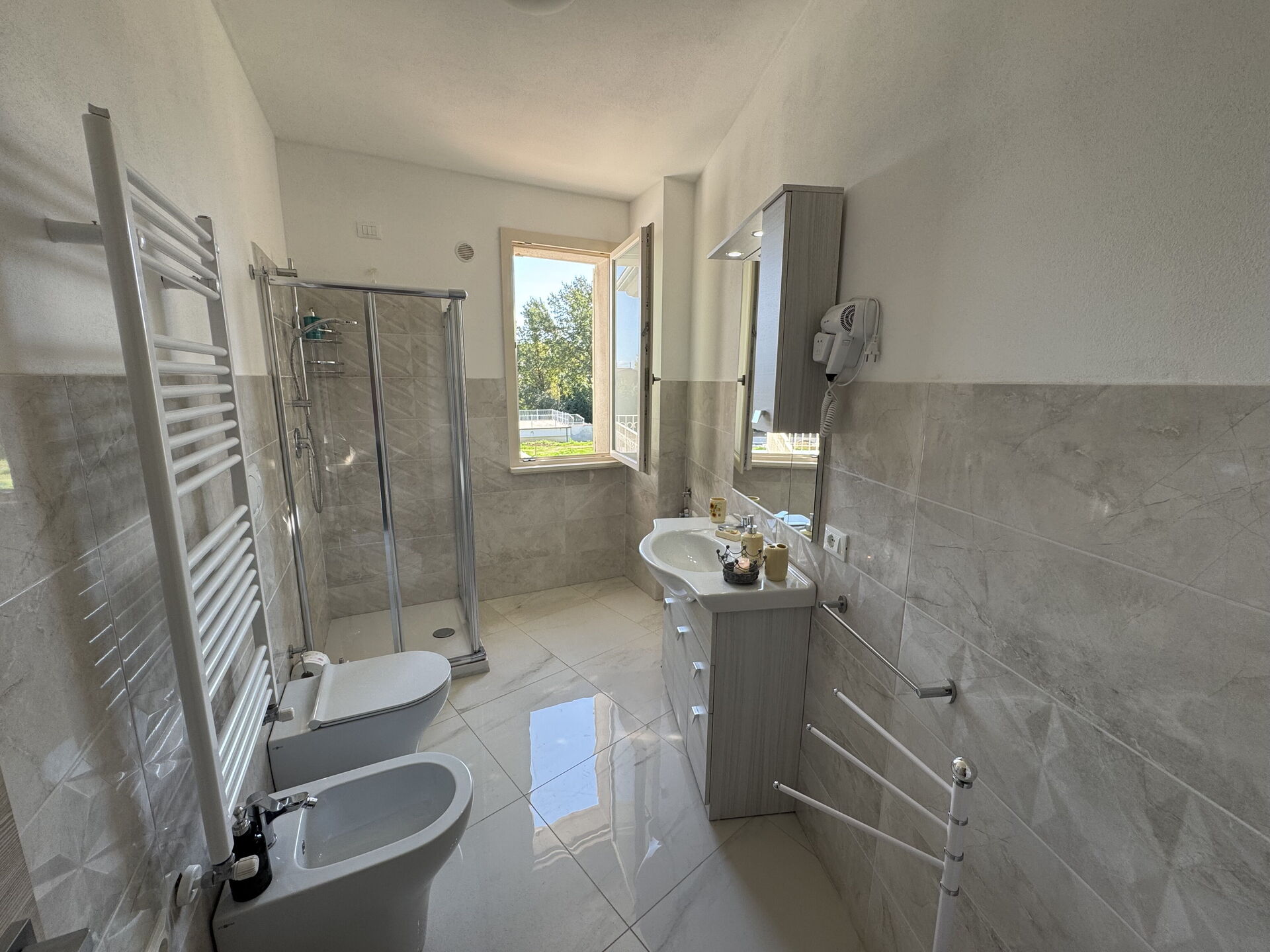 Bathroom: toilet, bidet, shower, hairdryer.