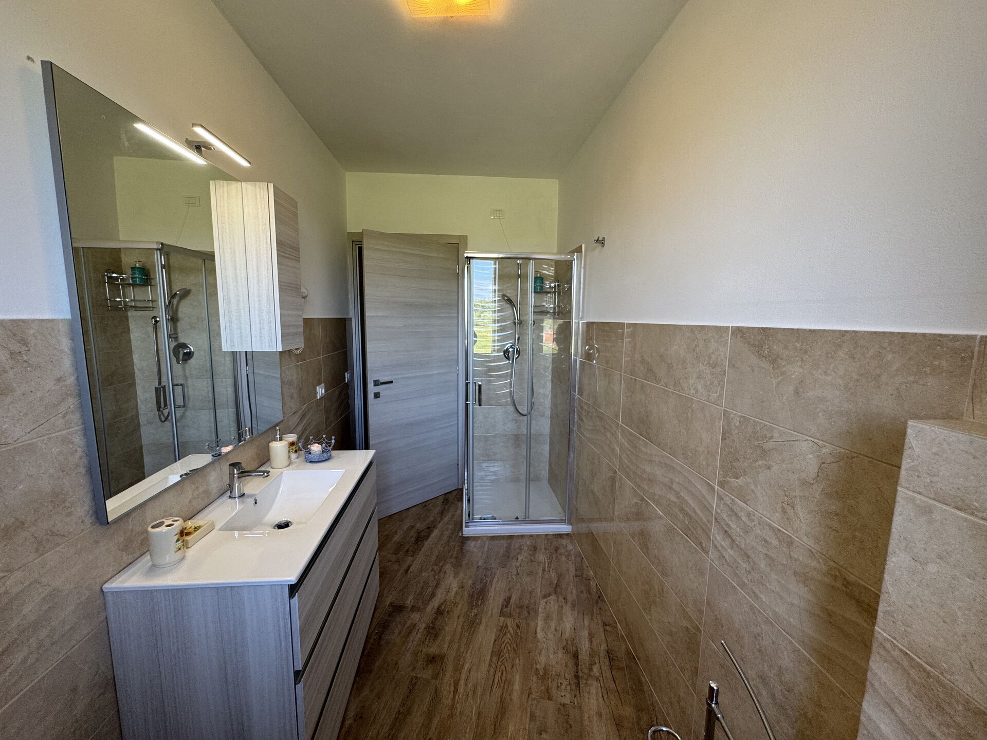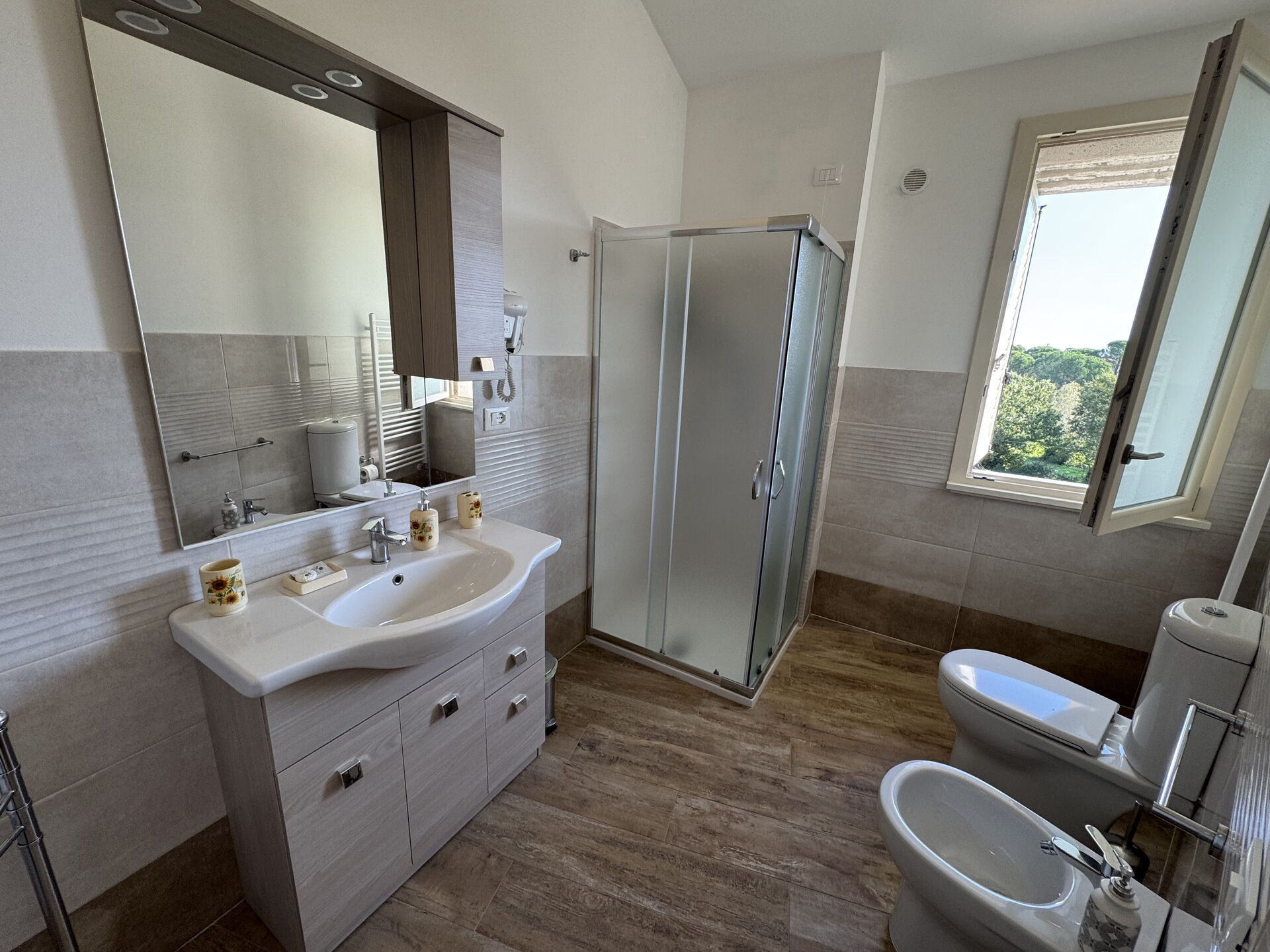Bathroom: basin, toilet, bidet, shower.