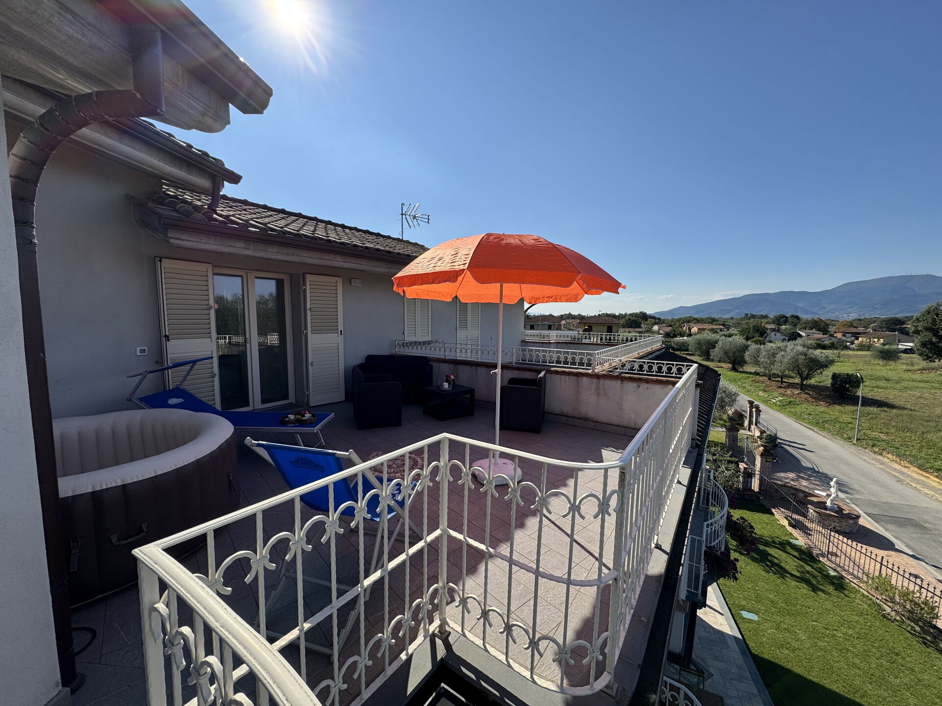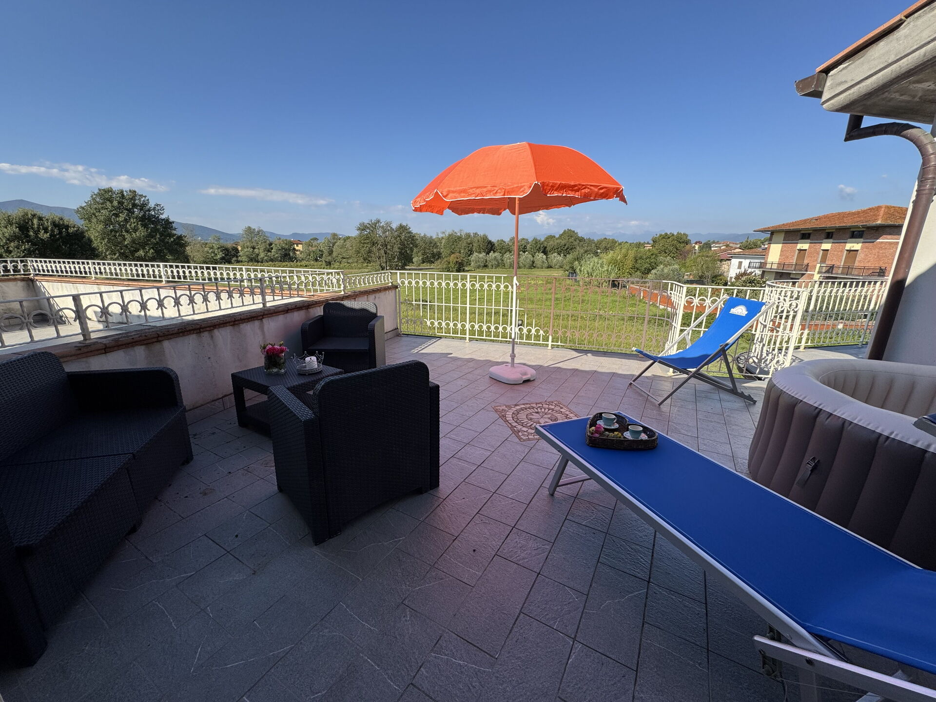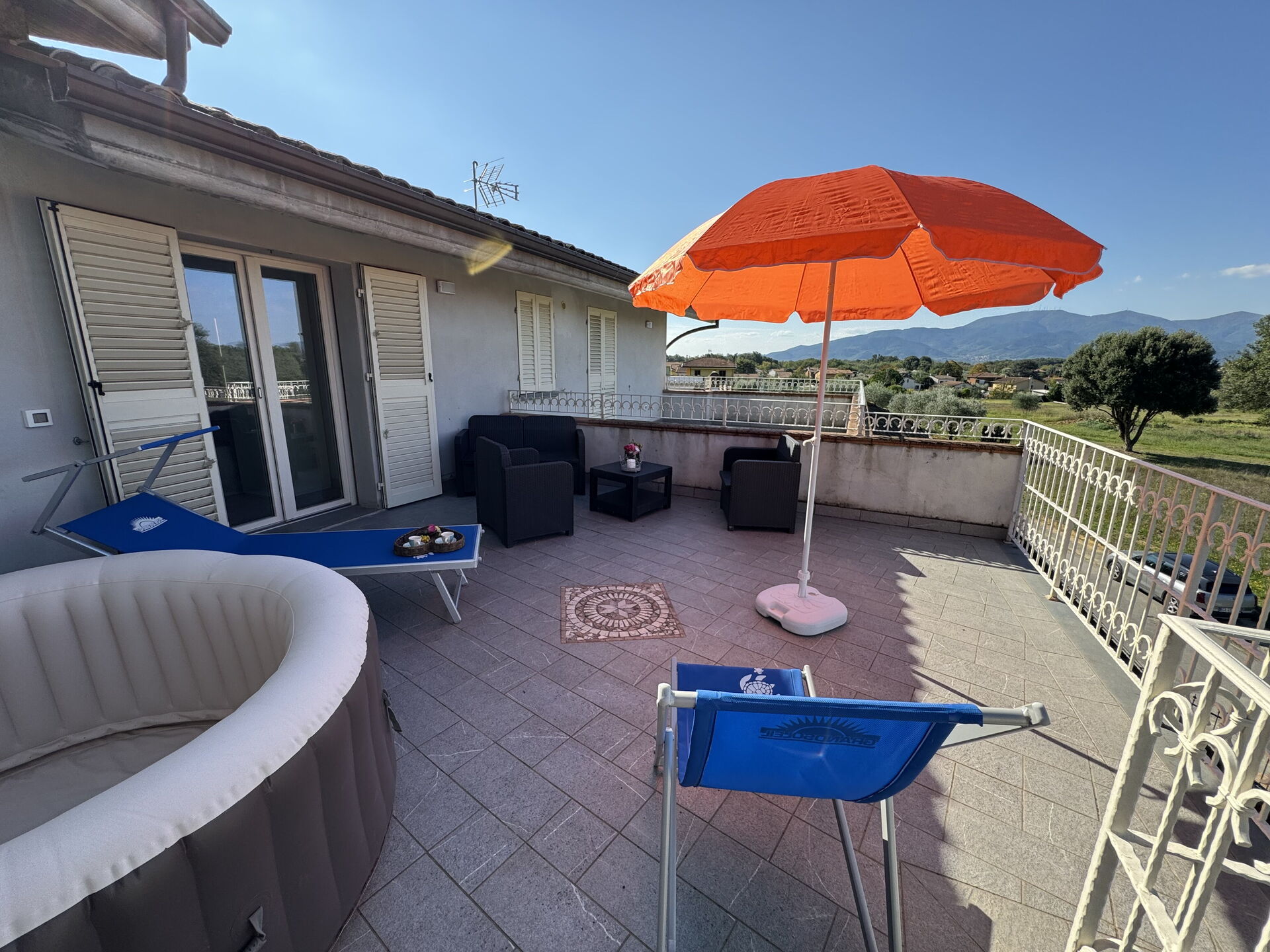 Terrace: outdoor hot tub, garden furniture, sunbed.