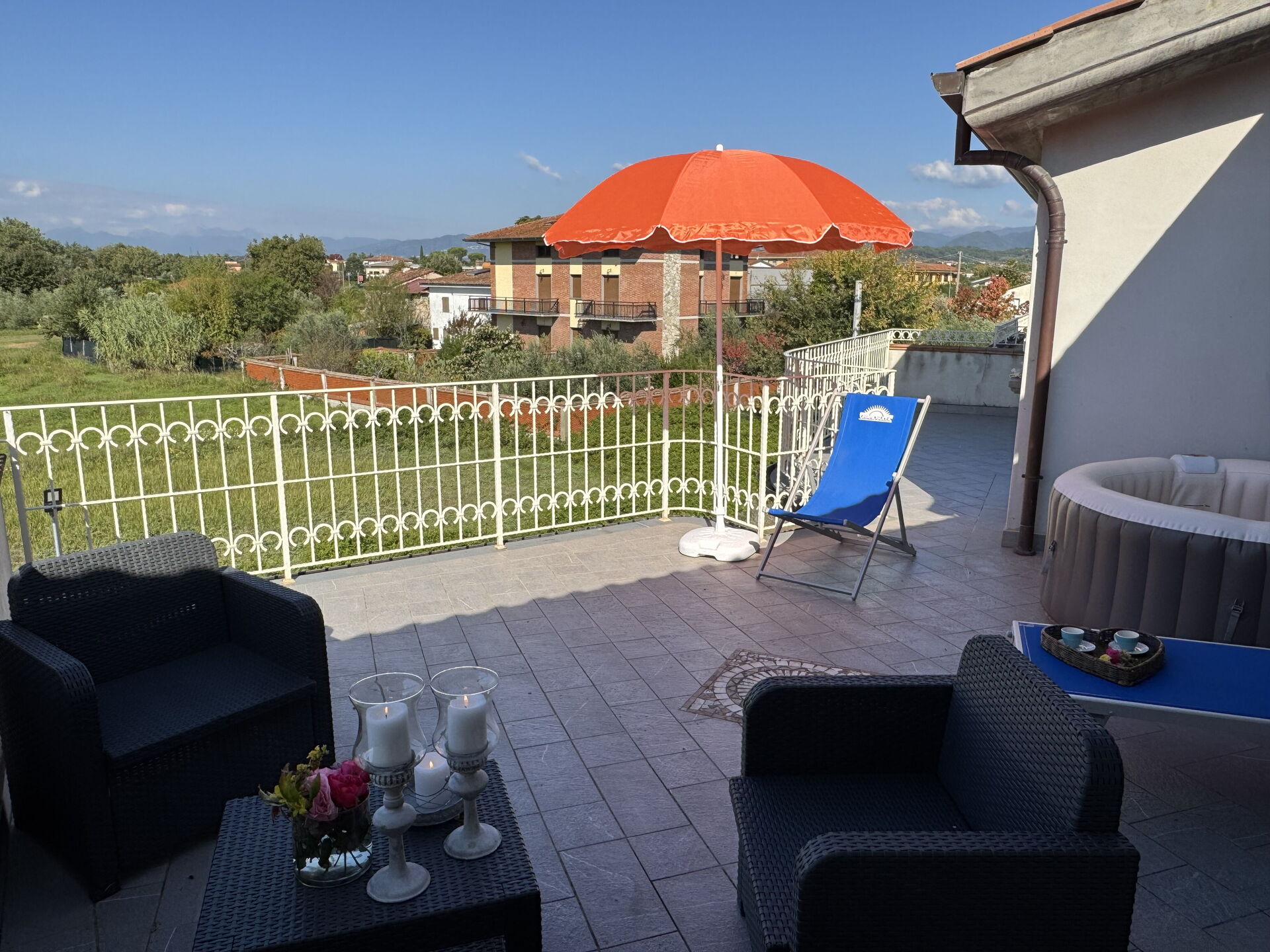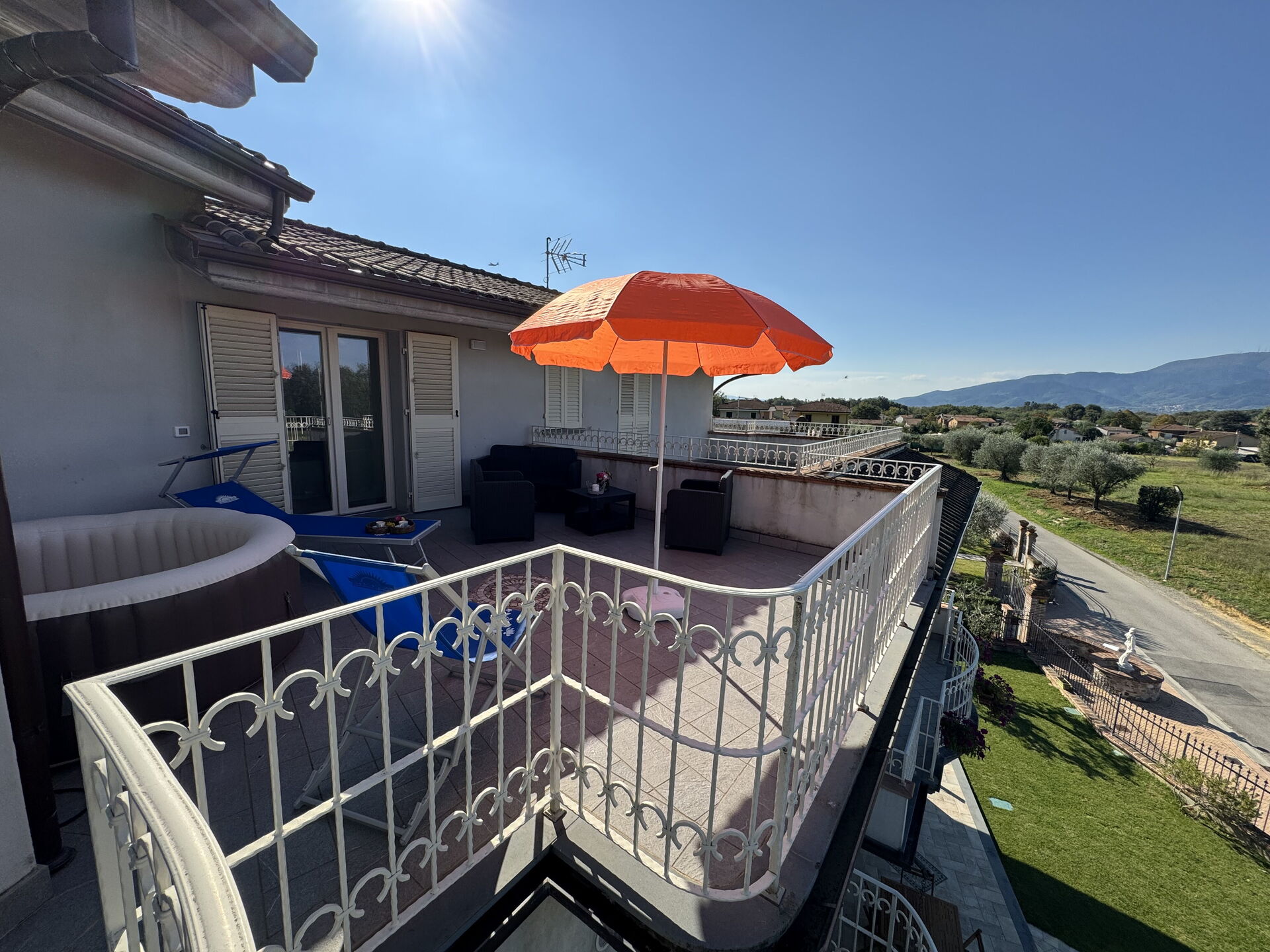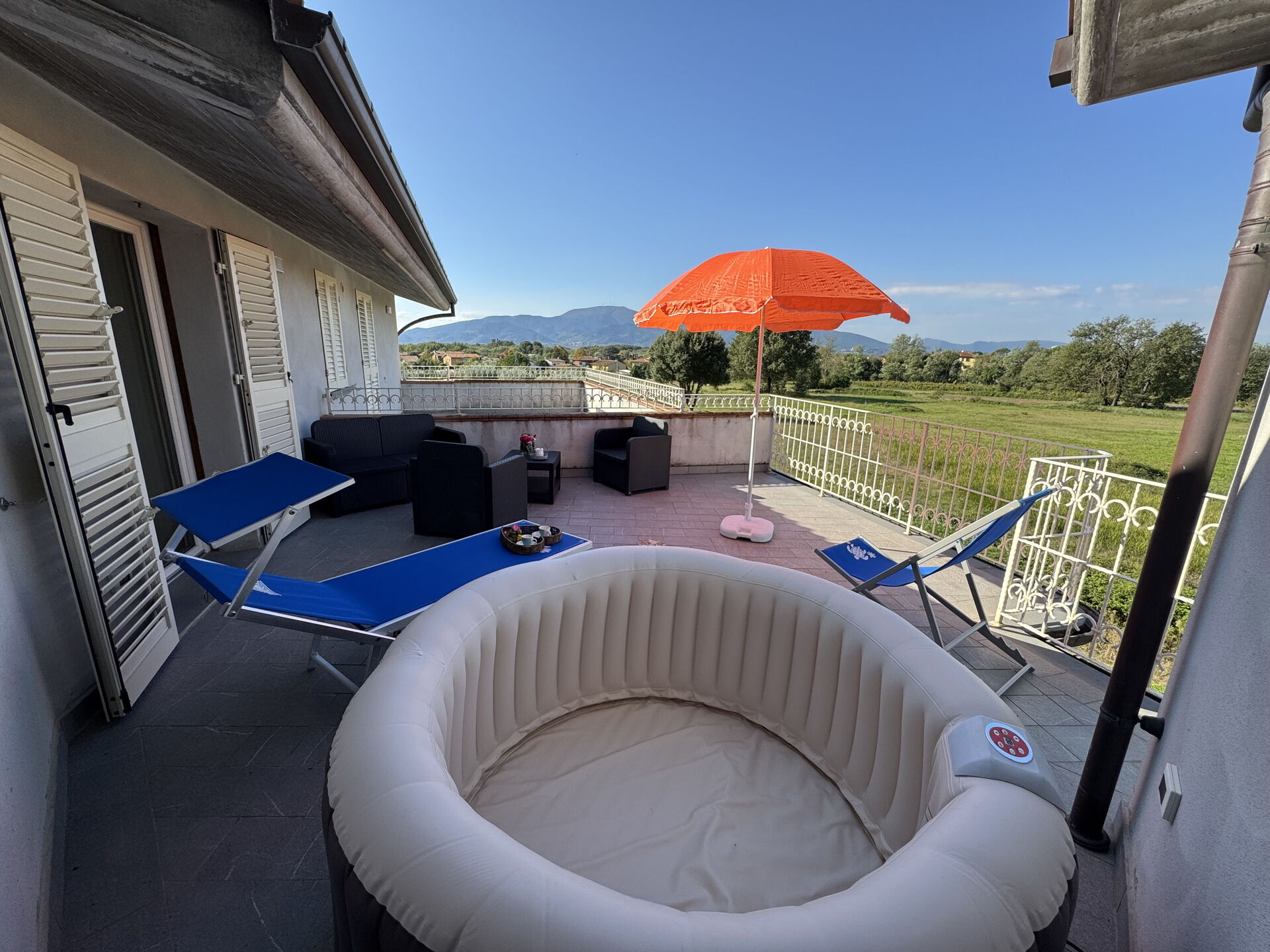 Terrace: outdoor hot tub, garden furniture, sunbed.